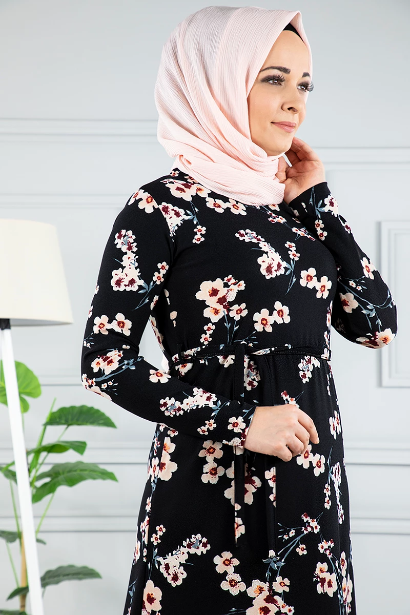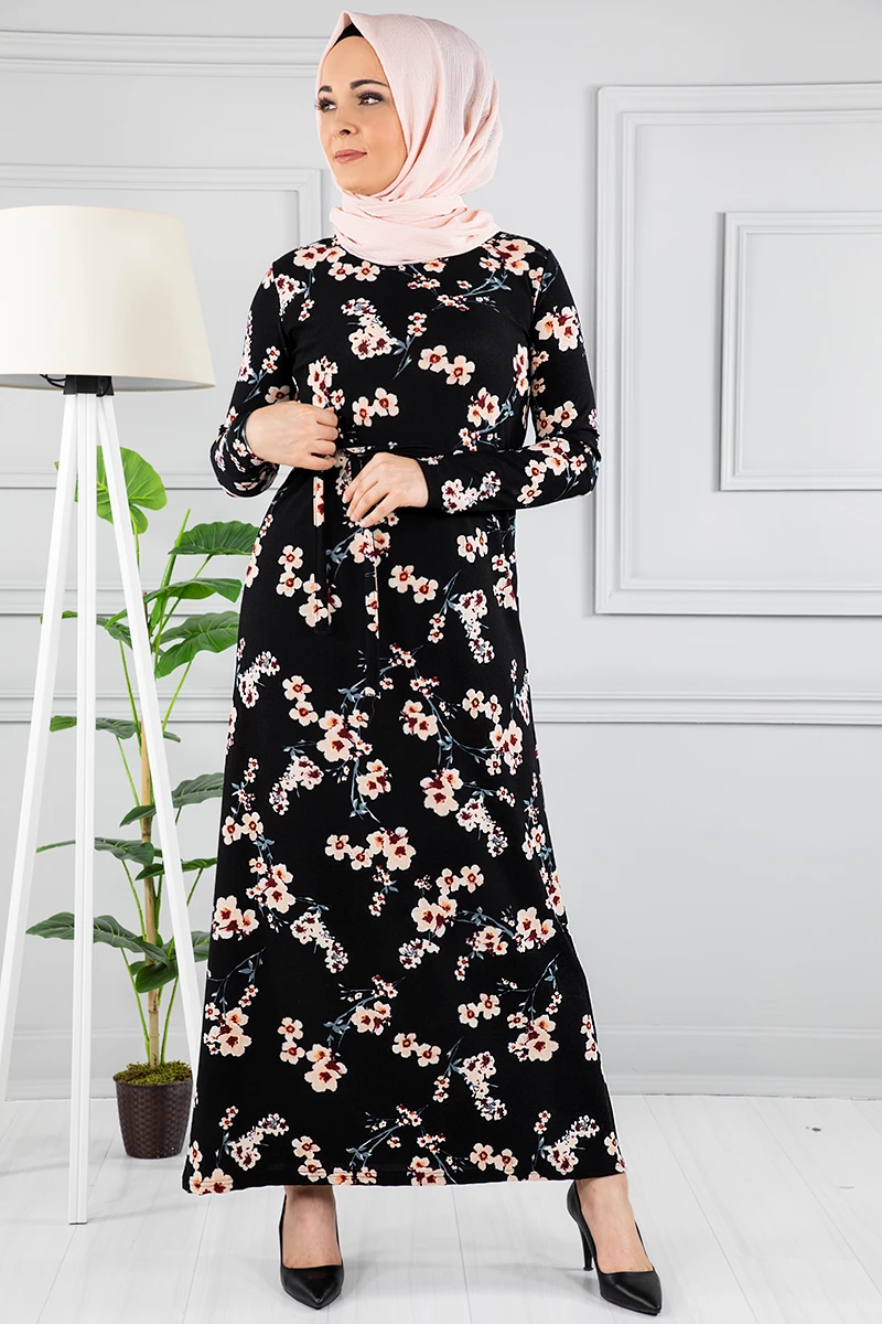 Çiçek Desenli Beli Kuşaklı Tesettür Elbise AZ1015 Siyah 15 XXL