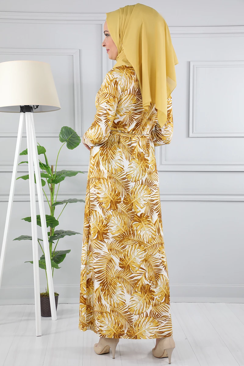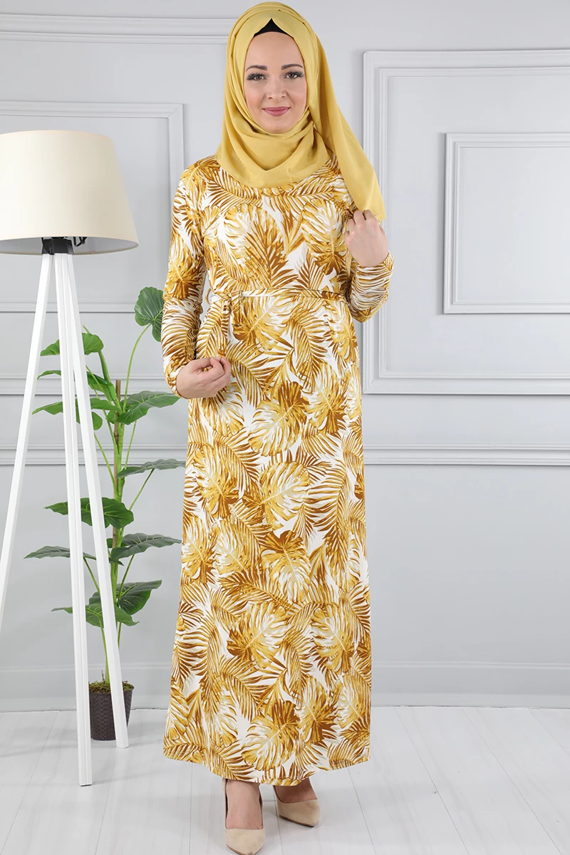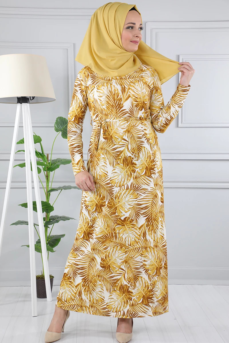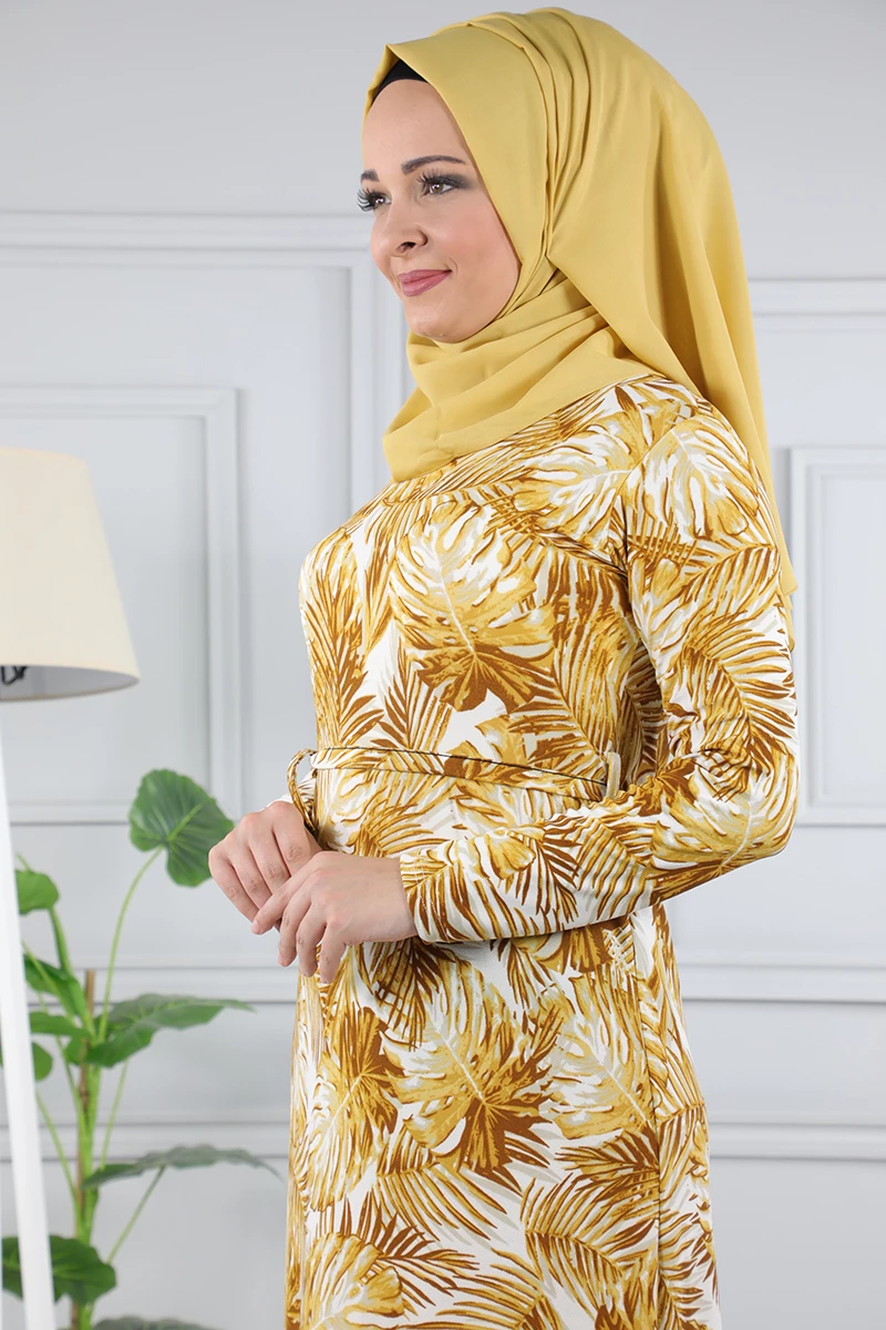 Çiçek Desenli Beli Kuşaklı Tesettür Elbise AZ1016 Hardal S-M