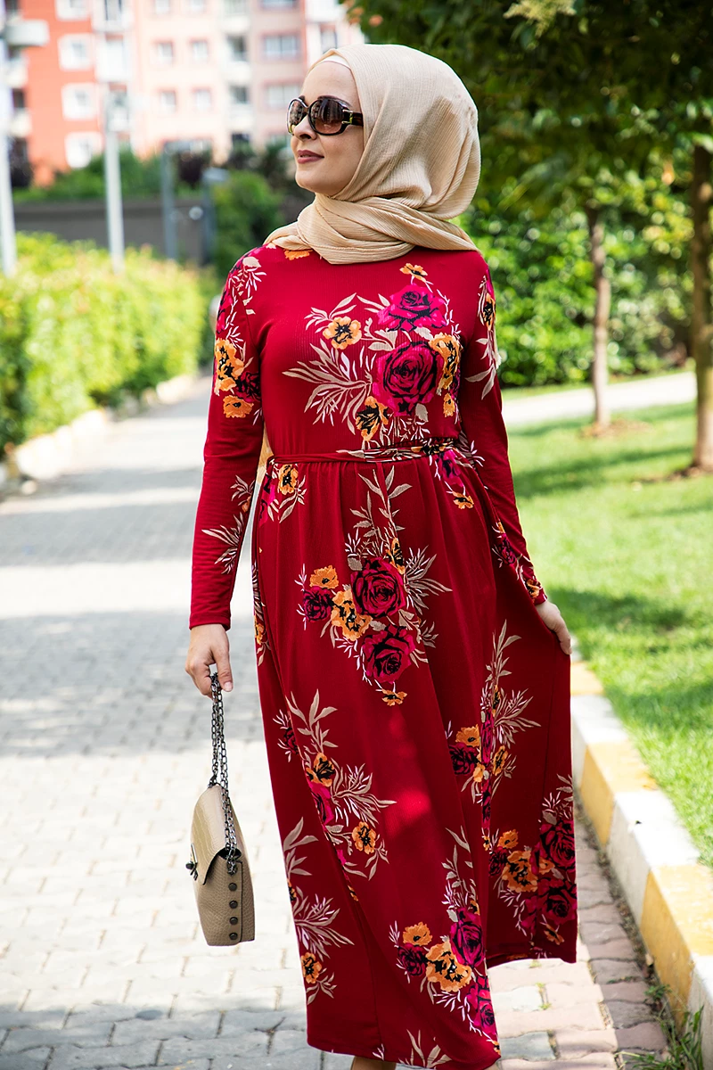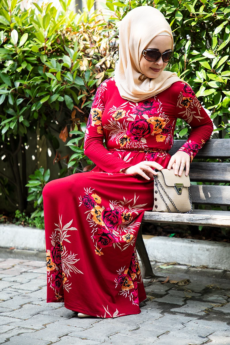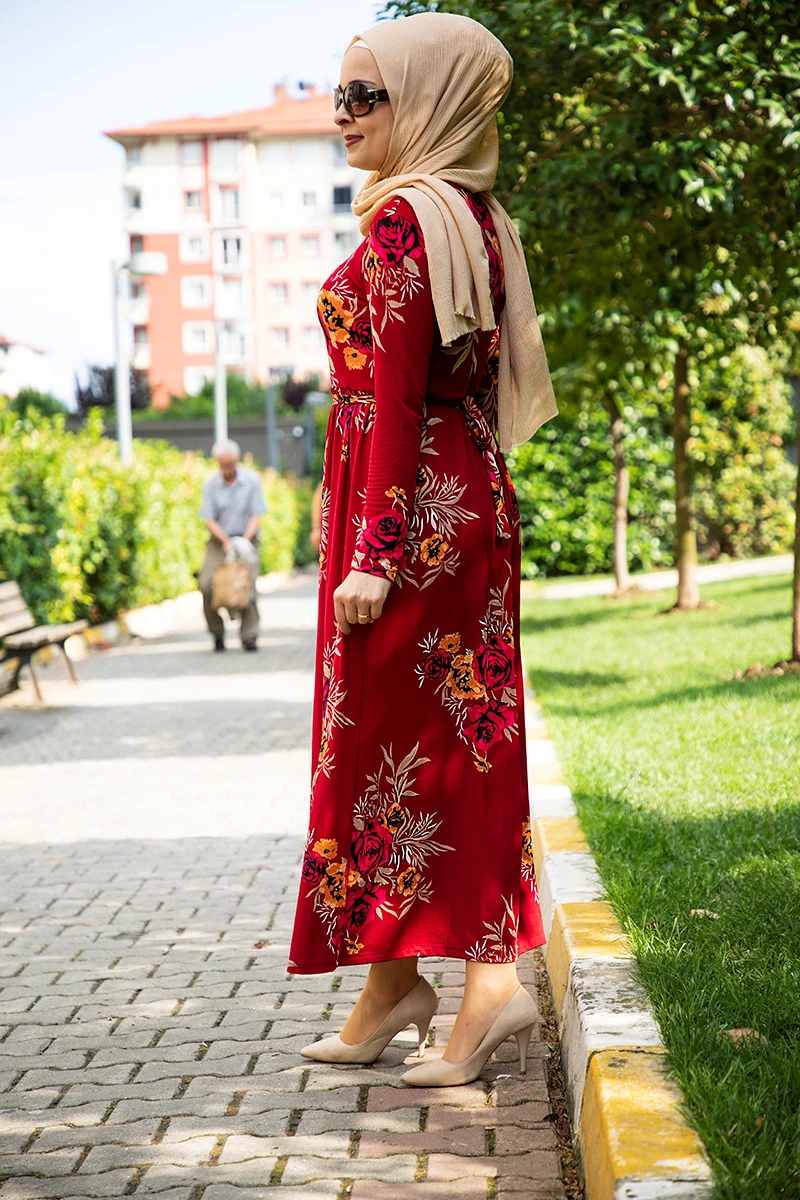 Needion - Çiçek Desenli Beli Kuşaklı Tesettür Elbise Kırmızı 03 2xl