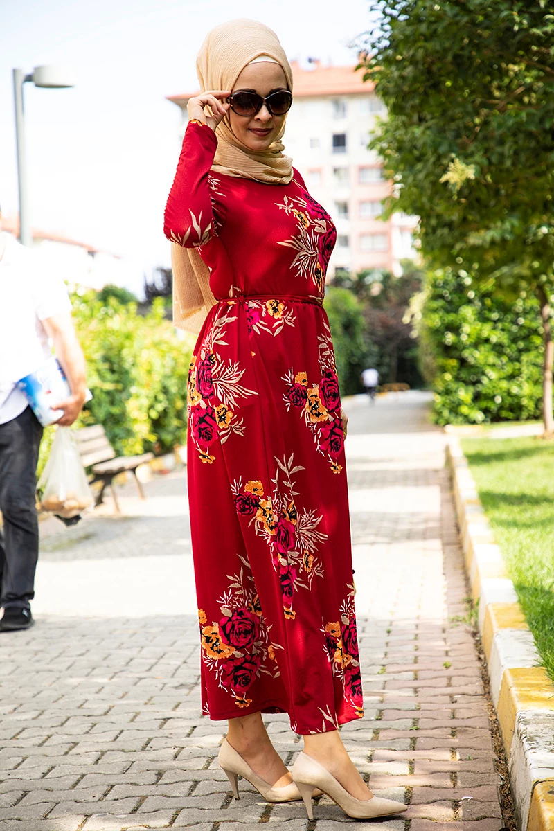 Çiçek Desenli Beli Kuşaklı Tesettür Elbise Kırmızı 03 2xl