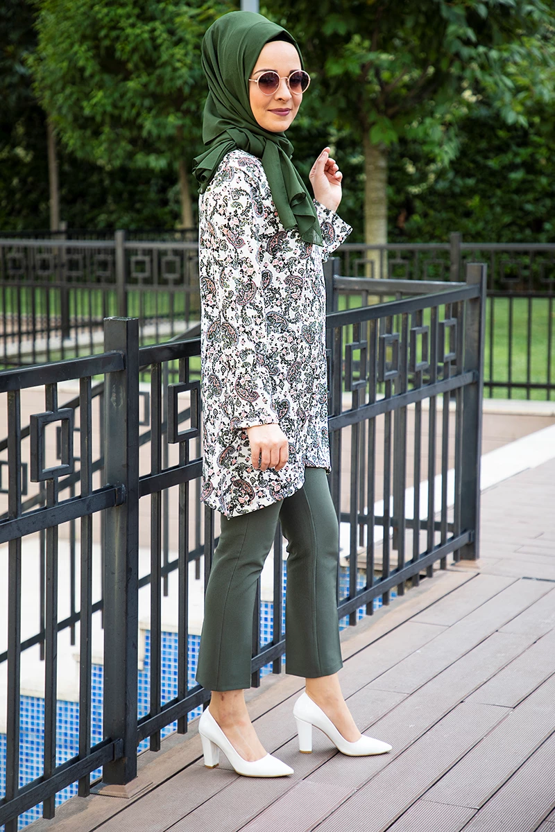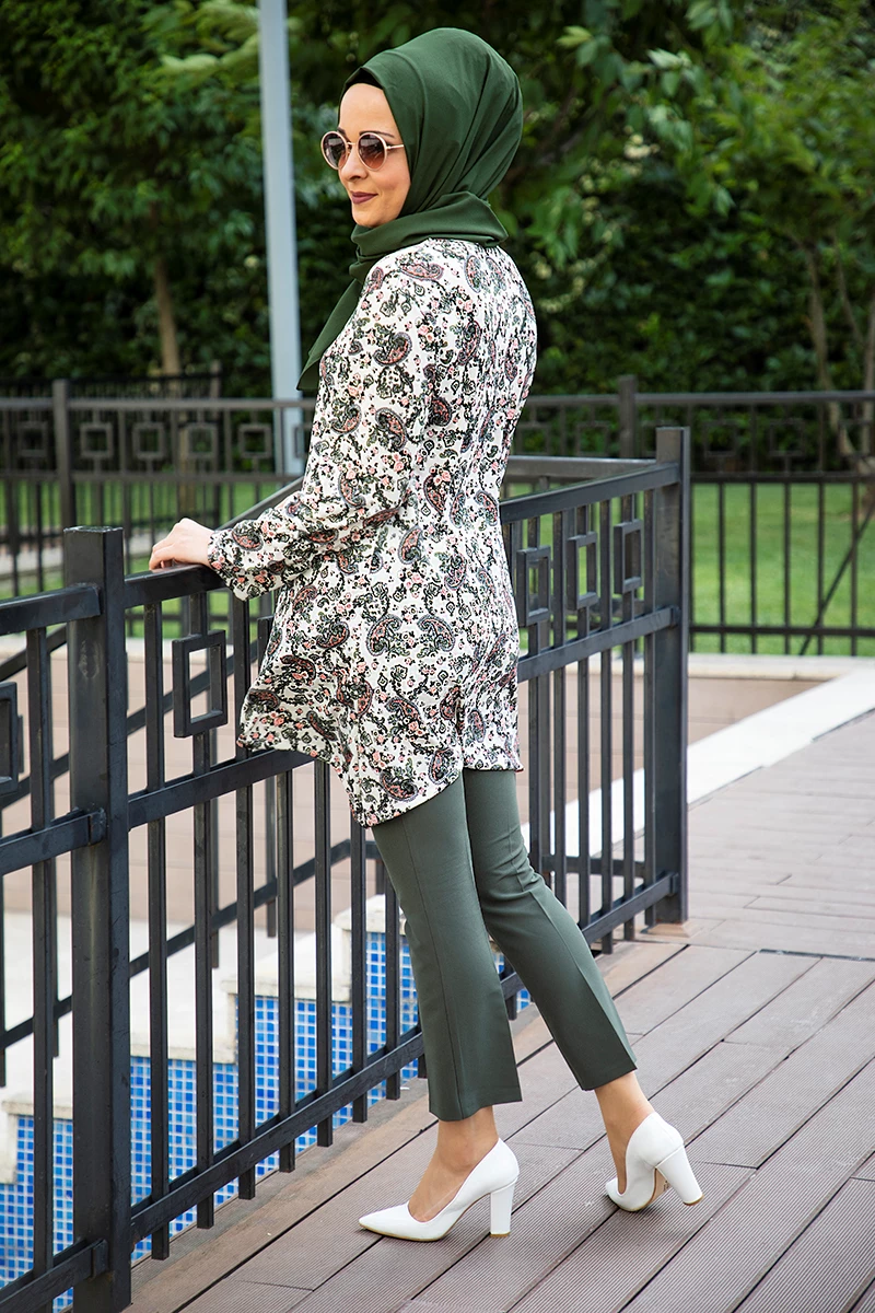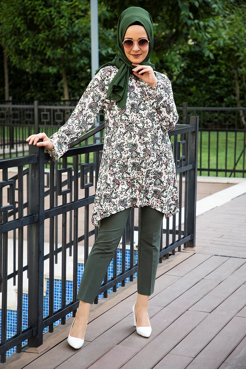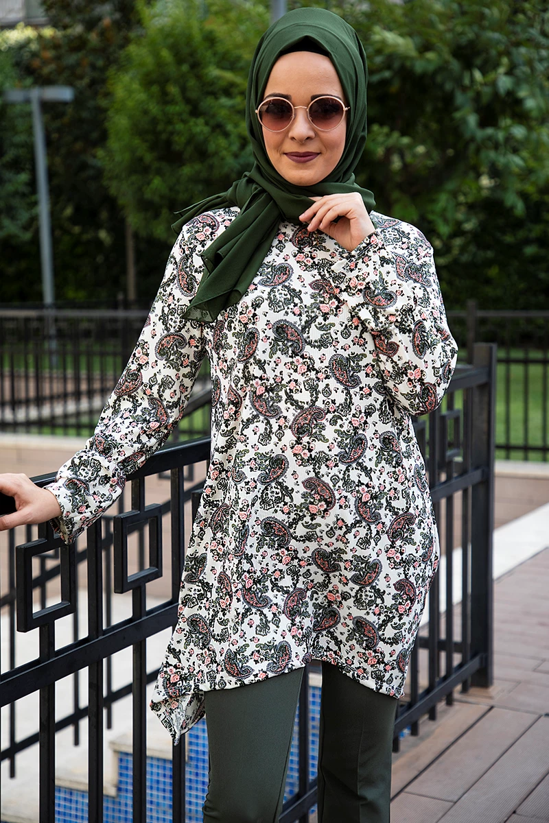 Çiçek Desenli Hilal Kesim Kolları Büzgülü Tesettür Tunik Beyaz 05 L-XL