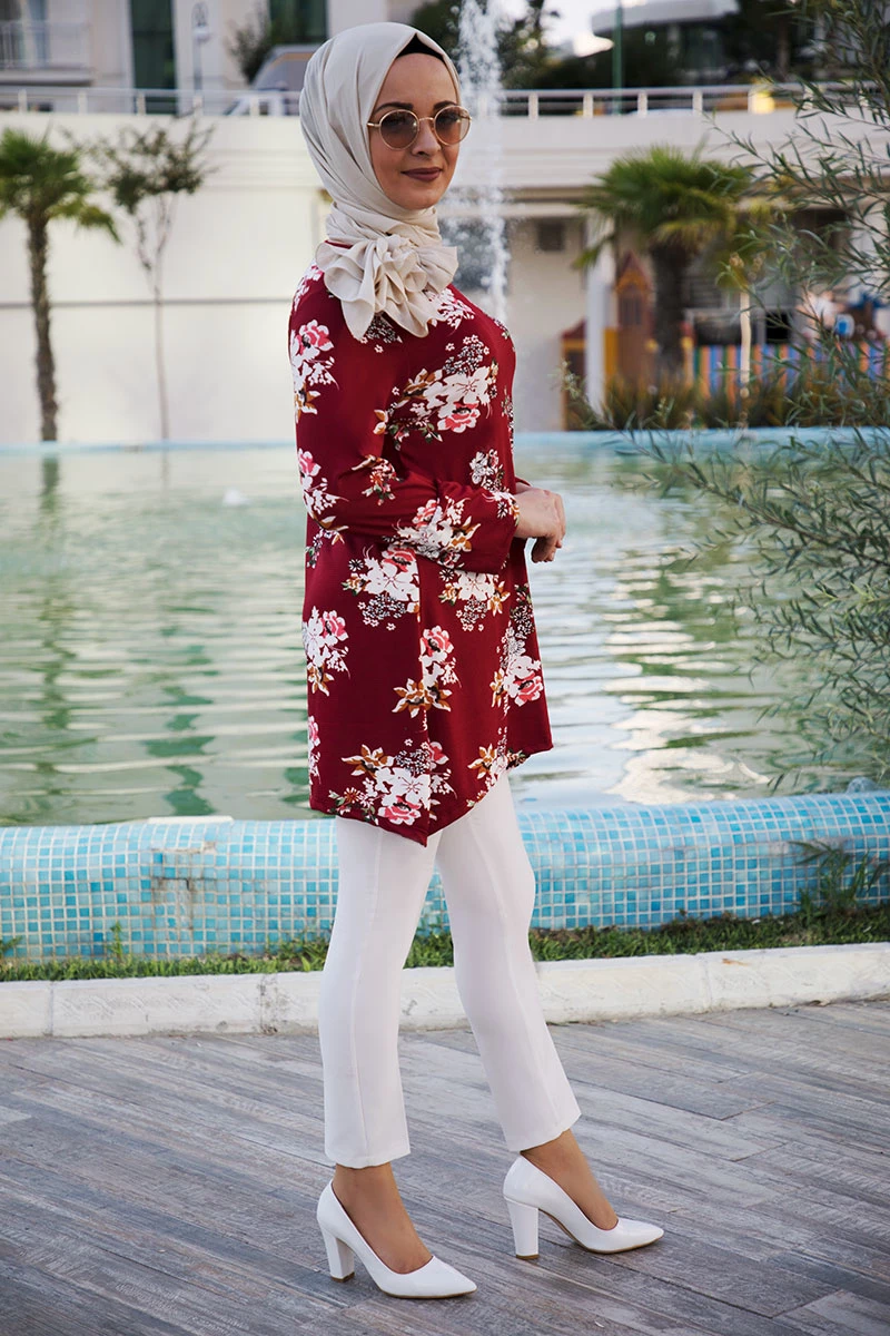 Çiçek Desenli Hilal Kesim Kolları Büzgülü Tesettür Tunik Kırmızı L-XL