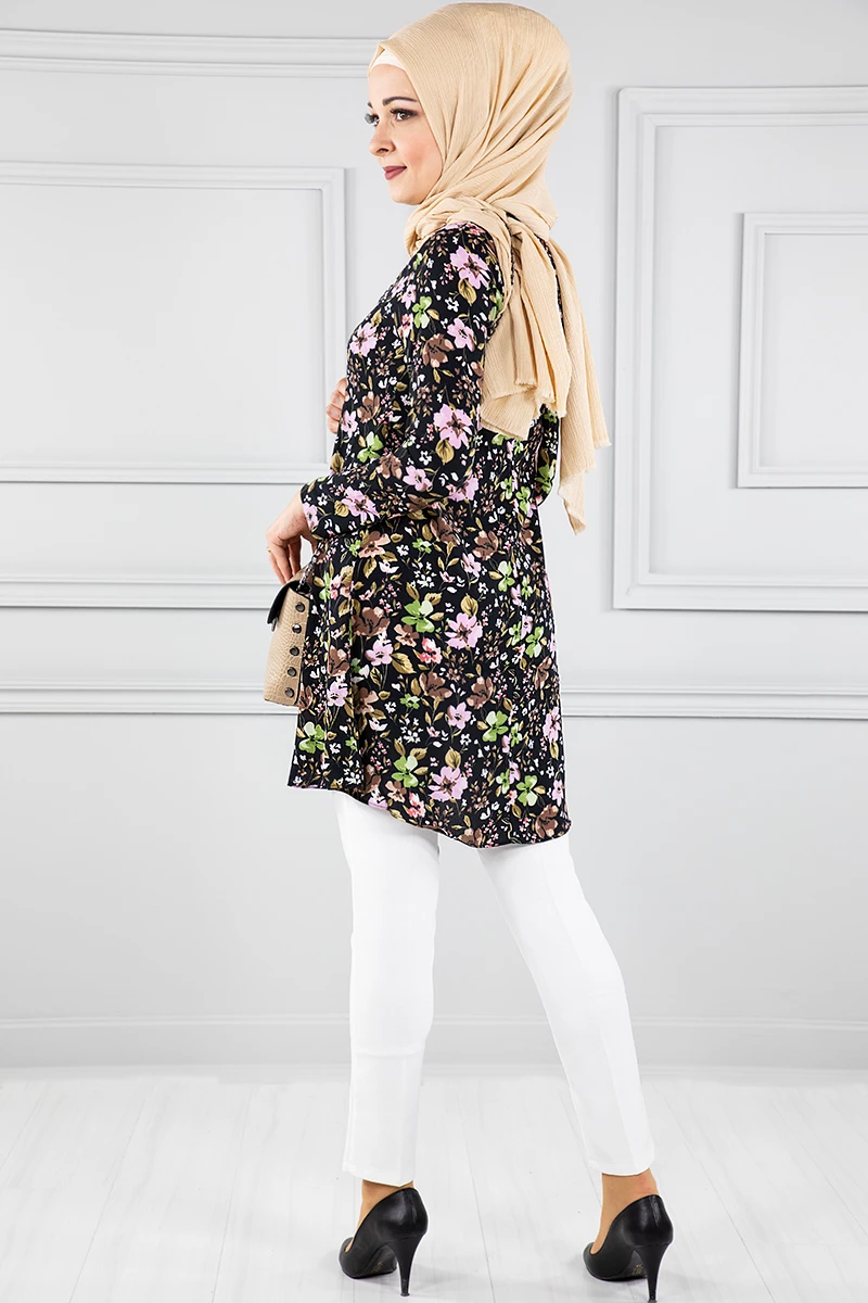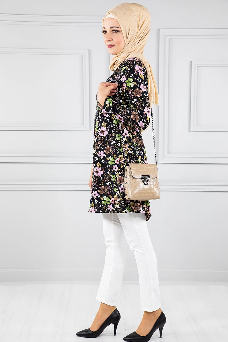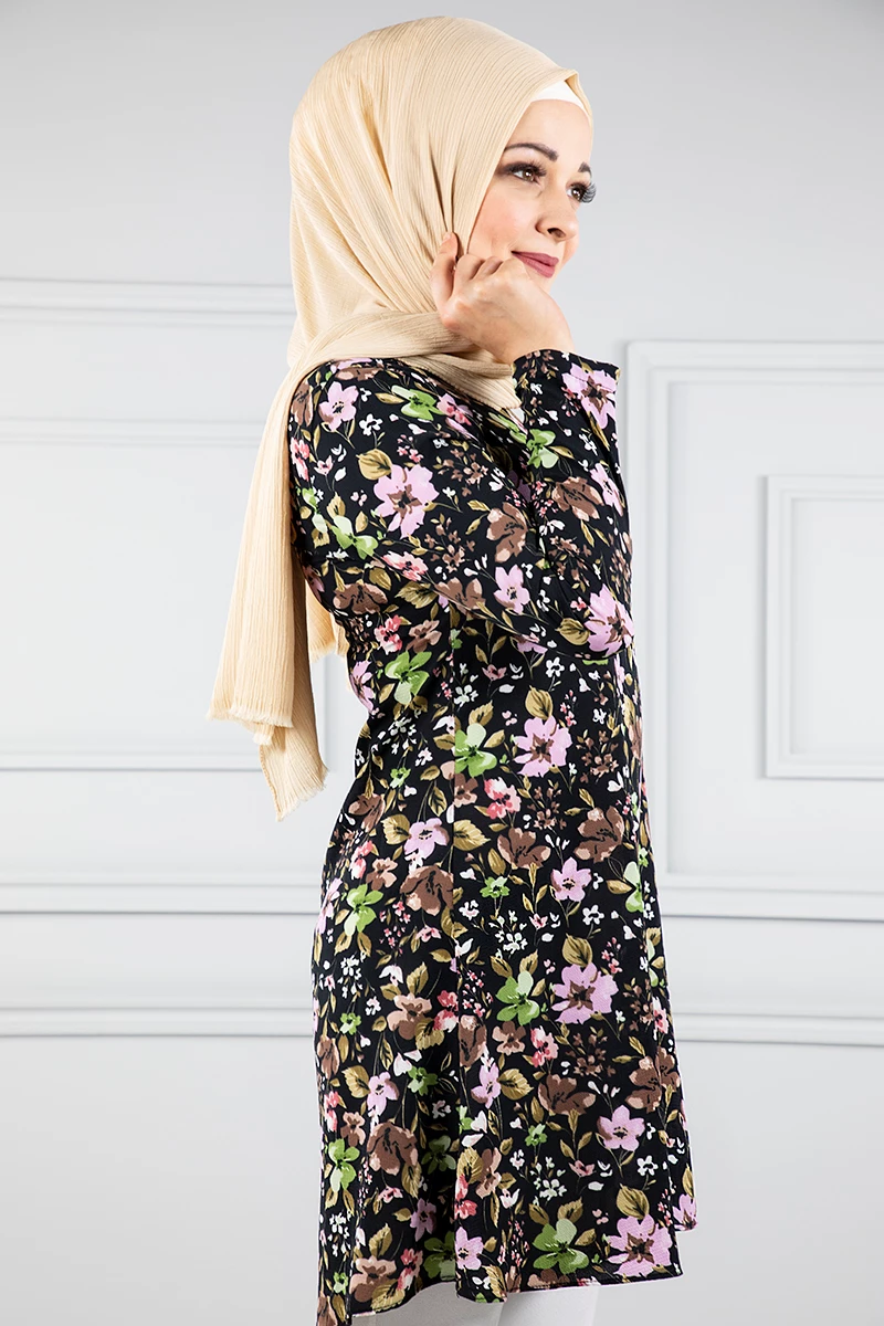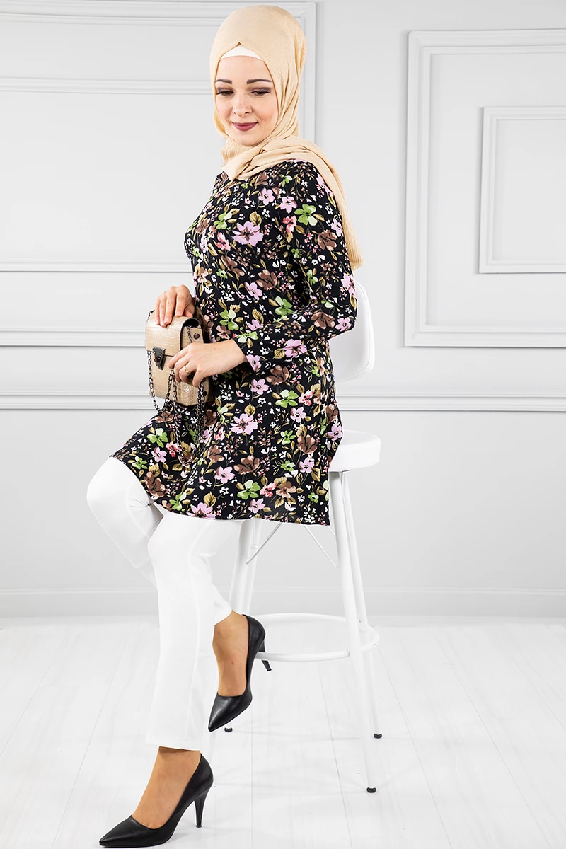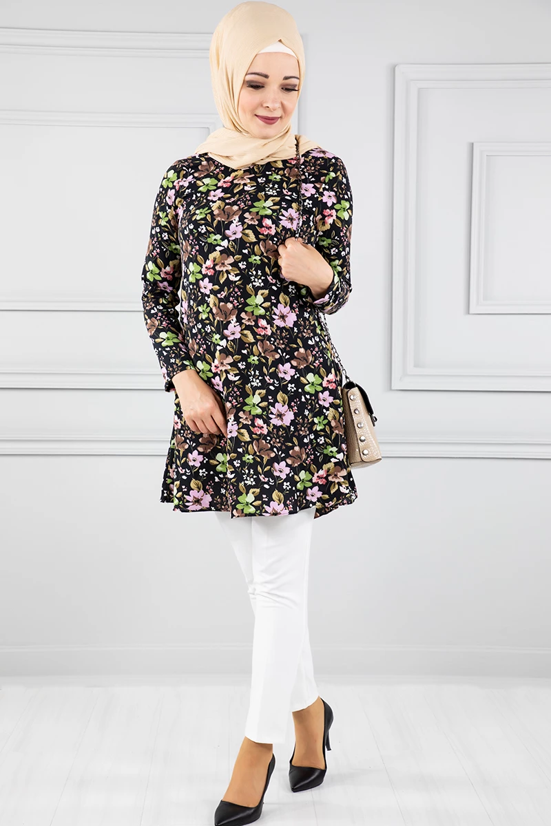 Çiçek Desenli Tesettür Tunik Siyah 38