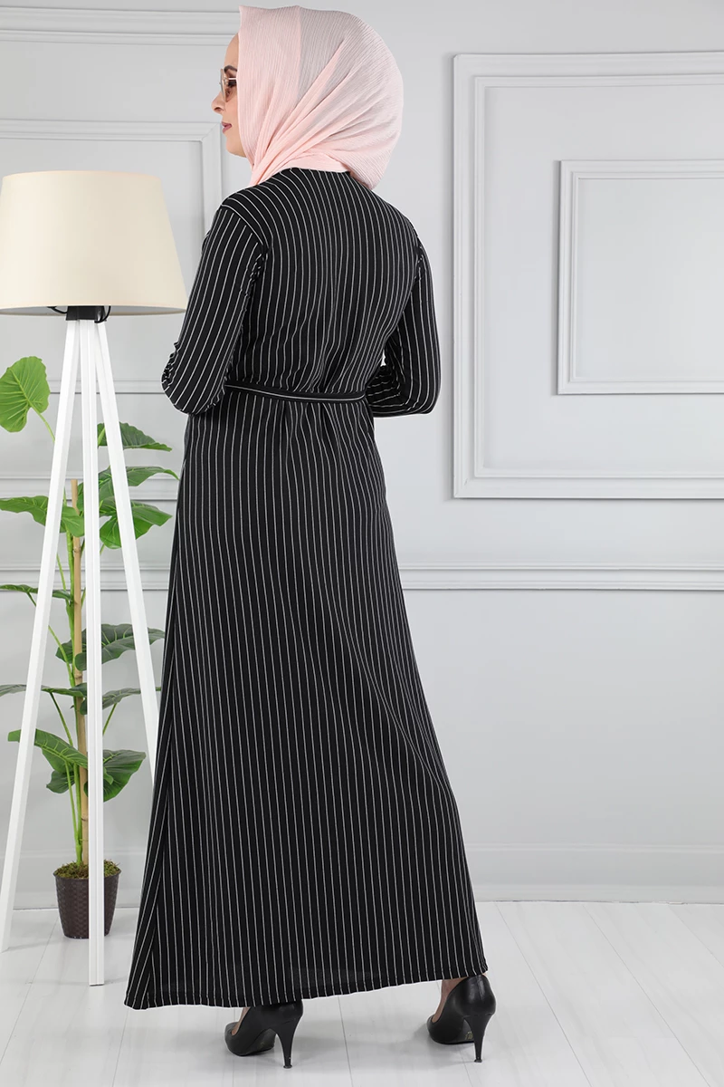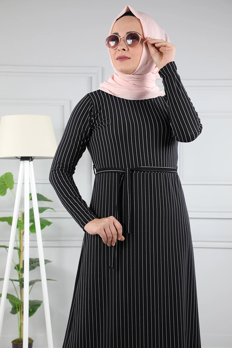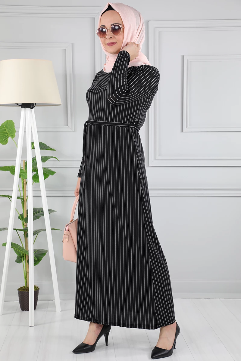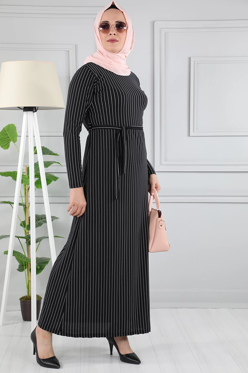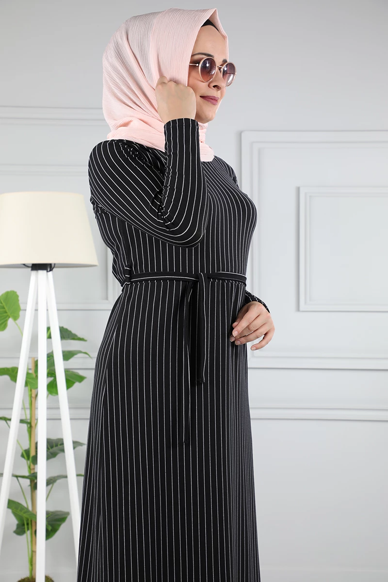 Çizgi Desenli Beli Kuşaklı Tesettür Elbise AZ1015 Siyah 12 XXL