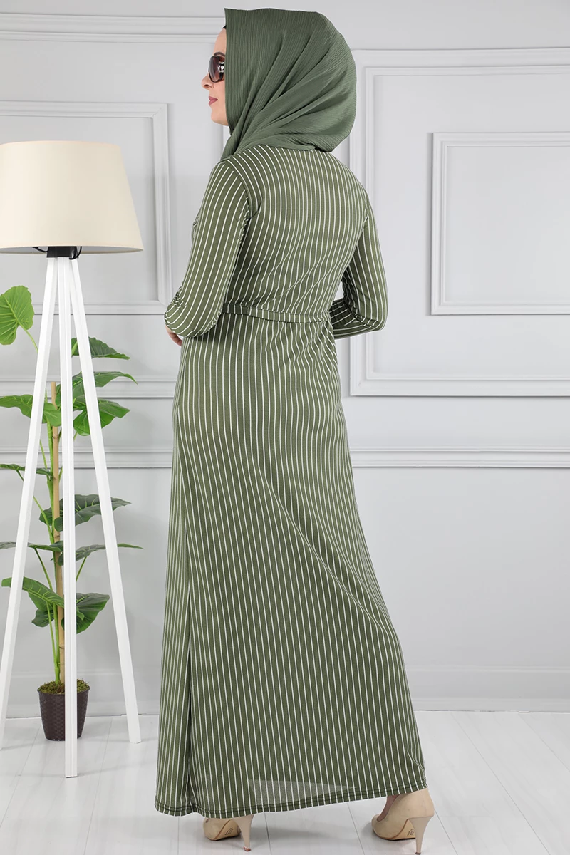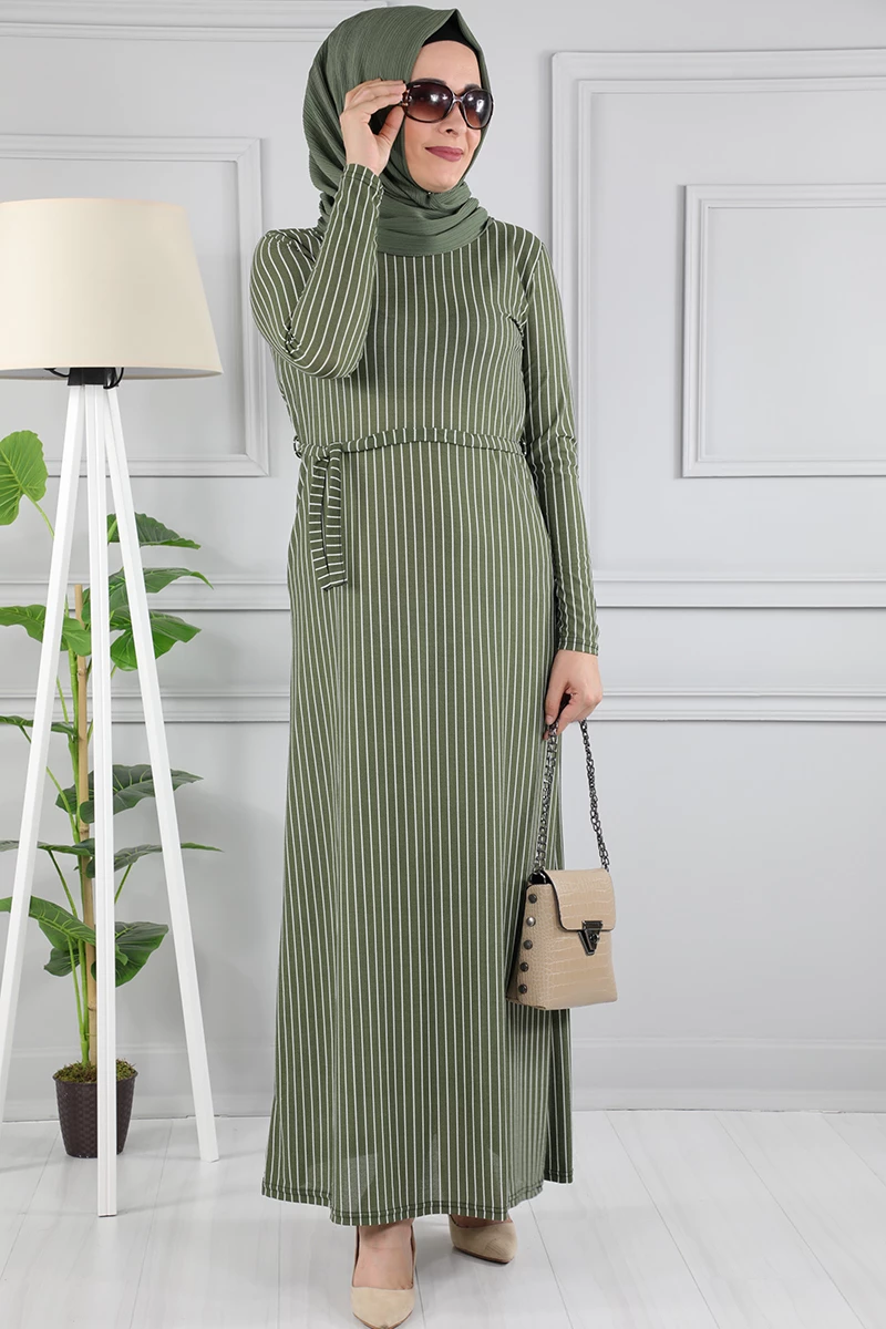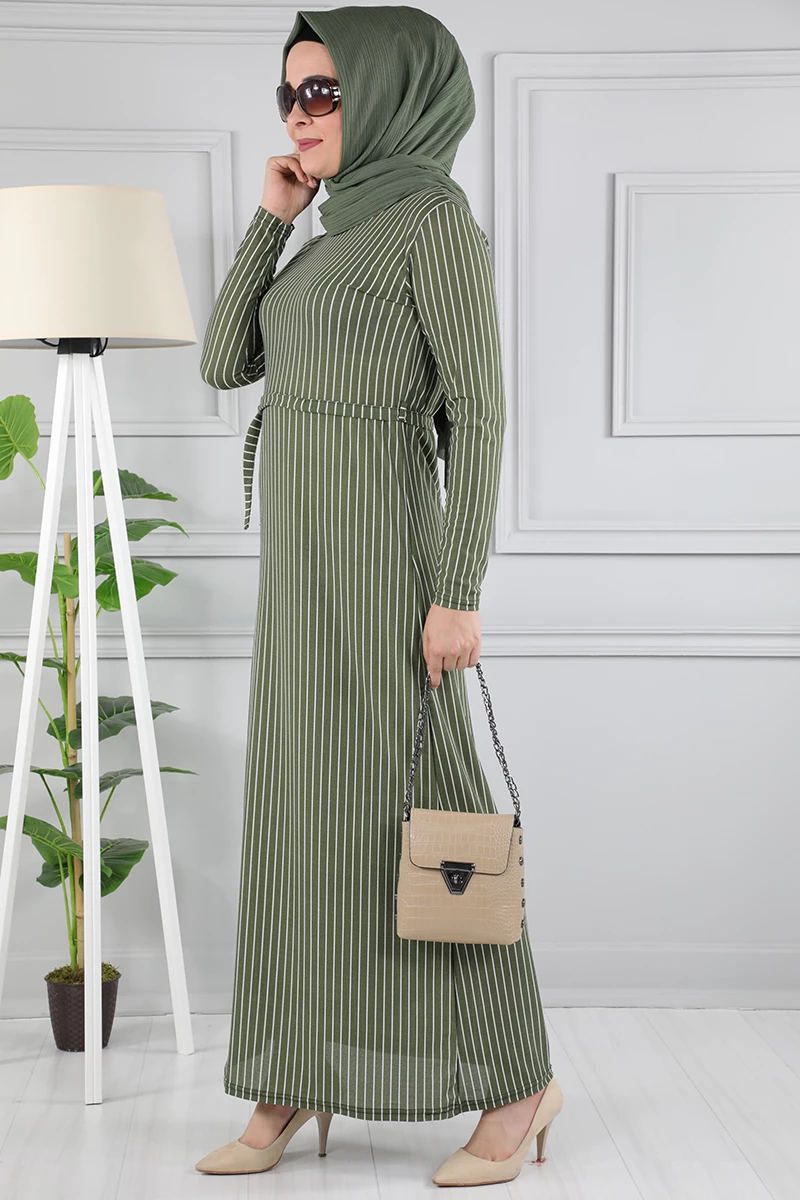 Çizgi Desenli Beli Kuşaklı Tesettür Elbise AZ1015 Yeşil XXL