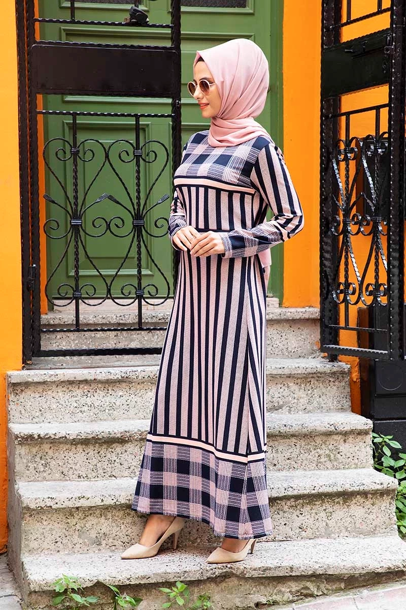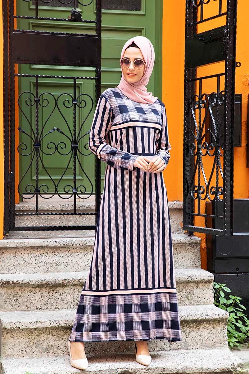 Needion - Çizgi Desenli Beli Kuşaklı Tesettür Elbise AZ1015ELGK L-XL