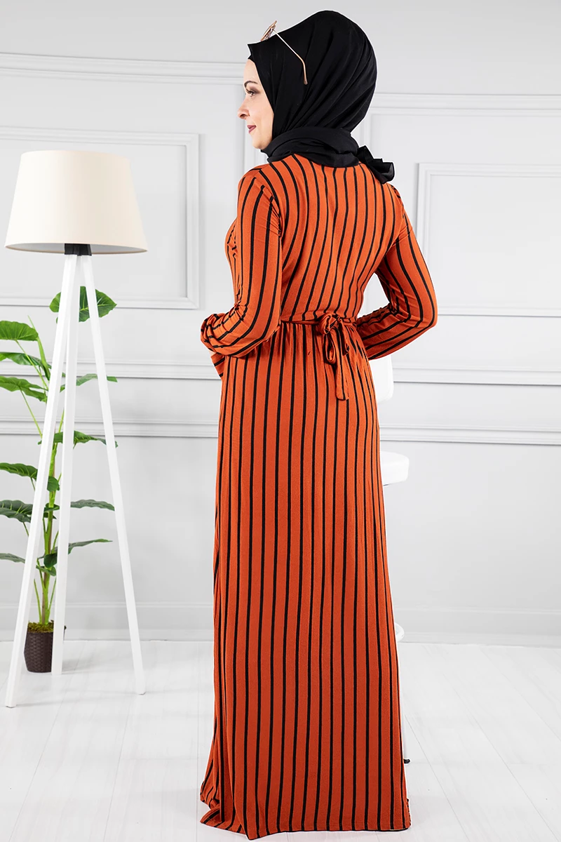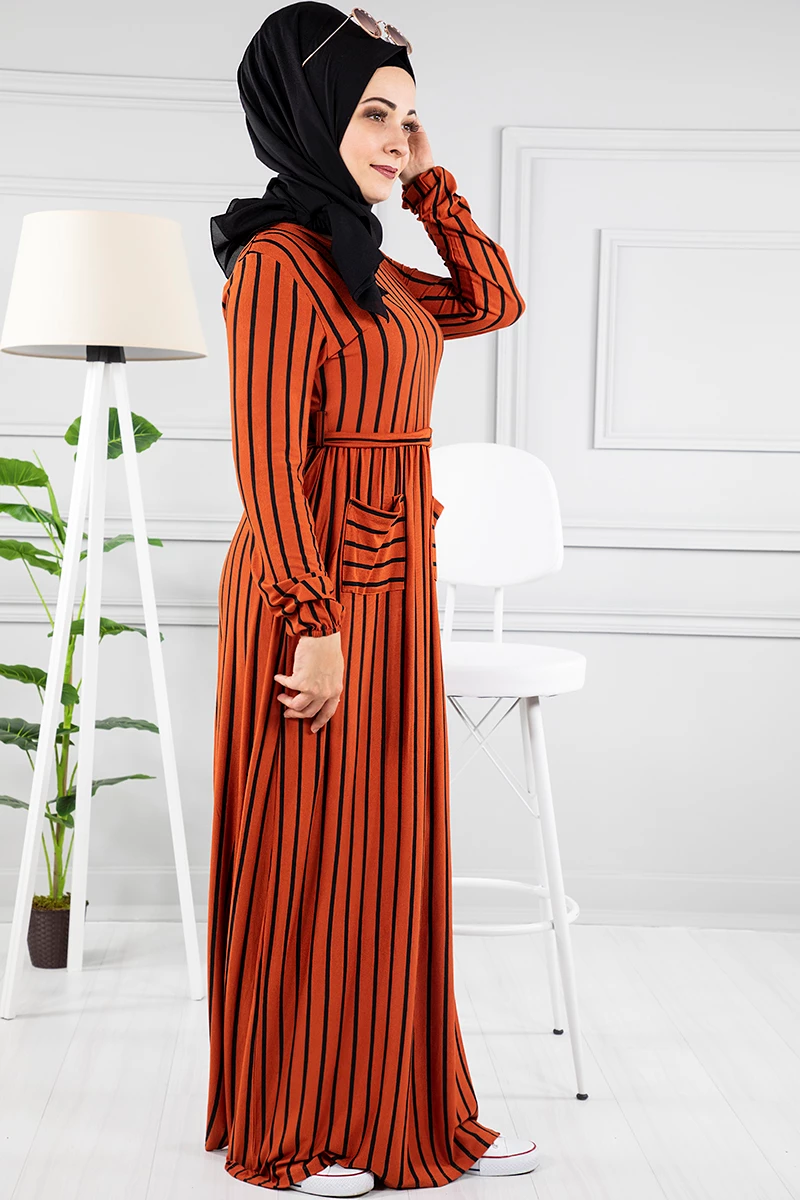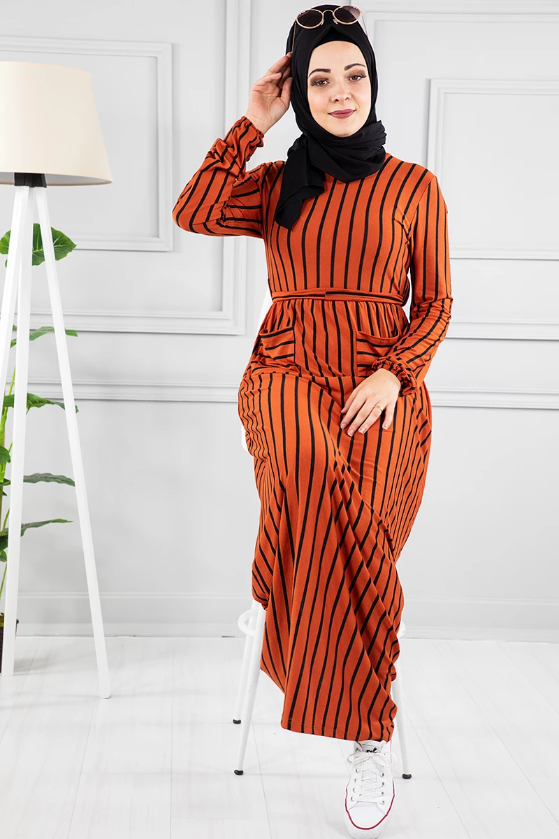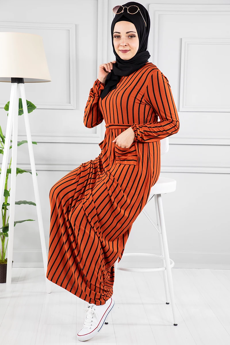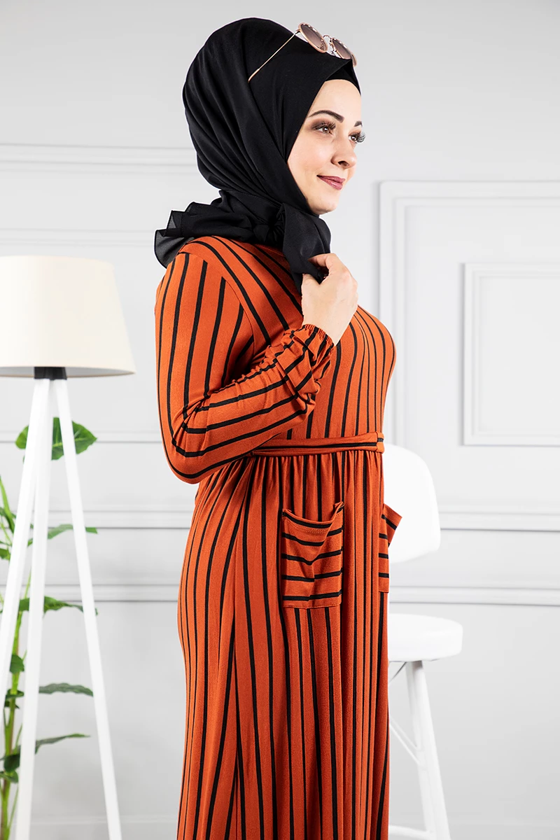 Çizgili Cepli Tesettür Elbise Lv20127 Tarçın 44