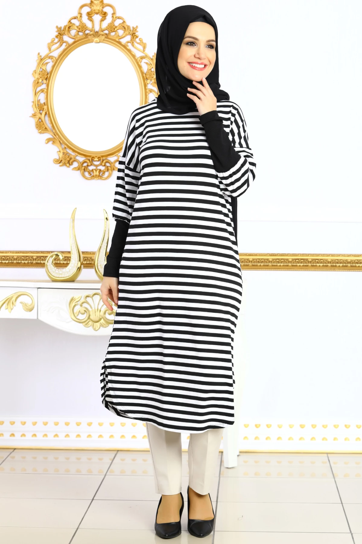 Needion - Çizgili Kolları Lastikli Uzun Tesettür Tunik Siyah tr S-M