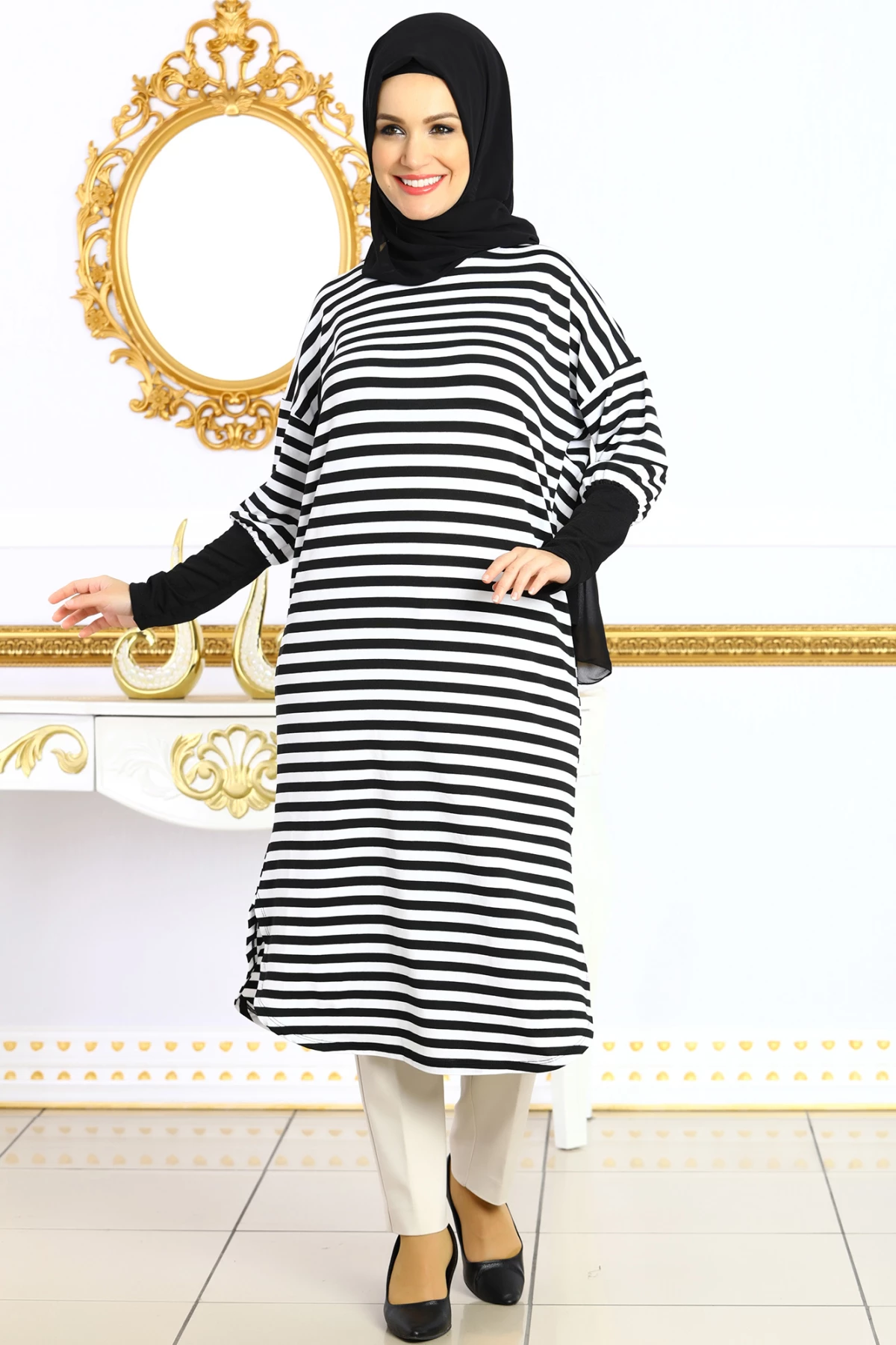 Çizgili Kolları Lastikli Uzun Tesettür Tunik Siyah tr S-M