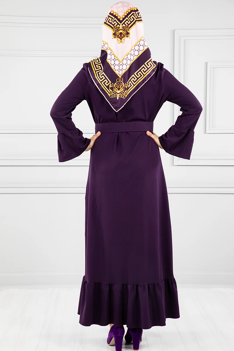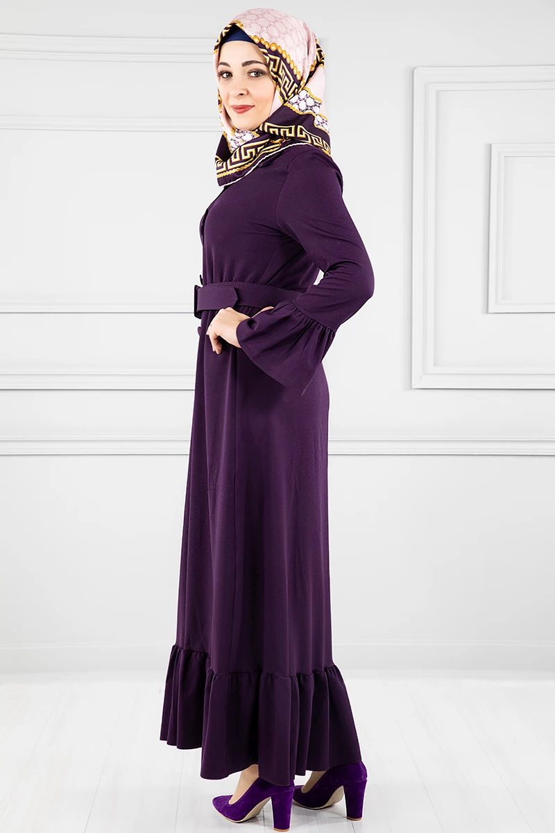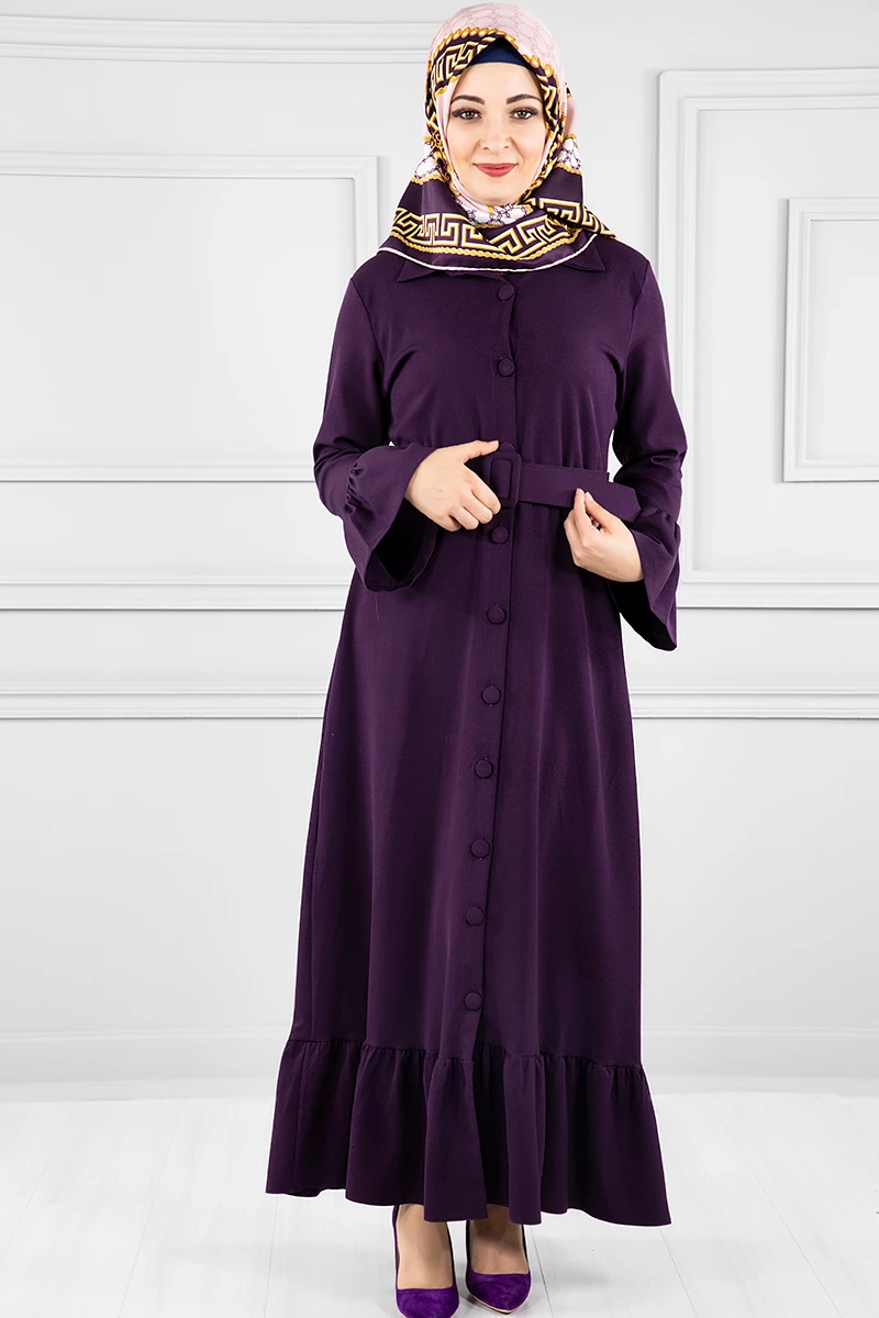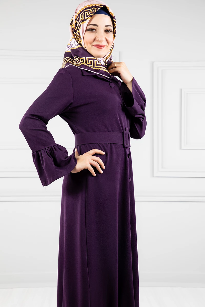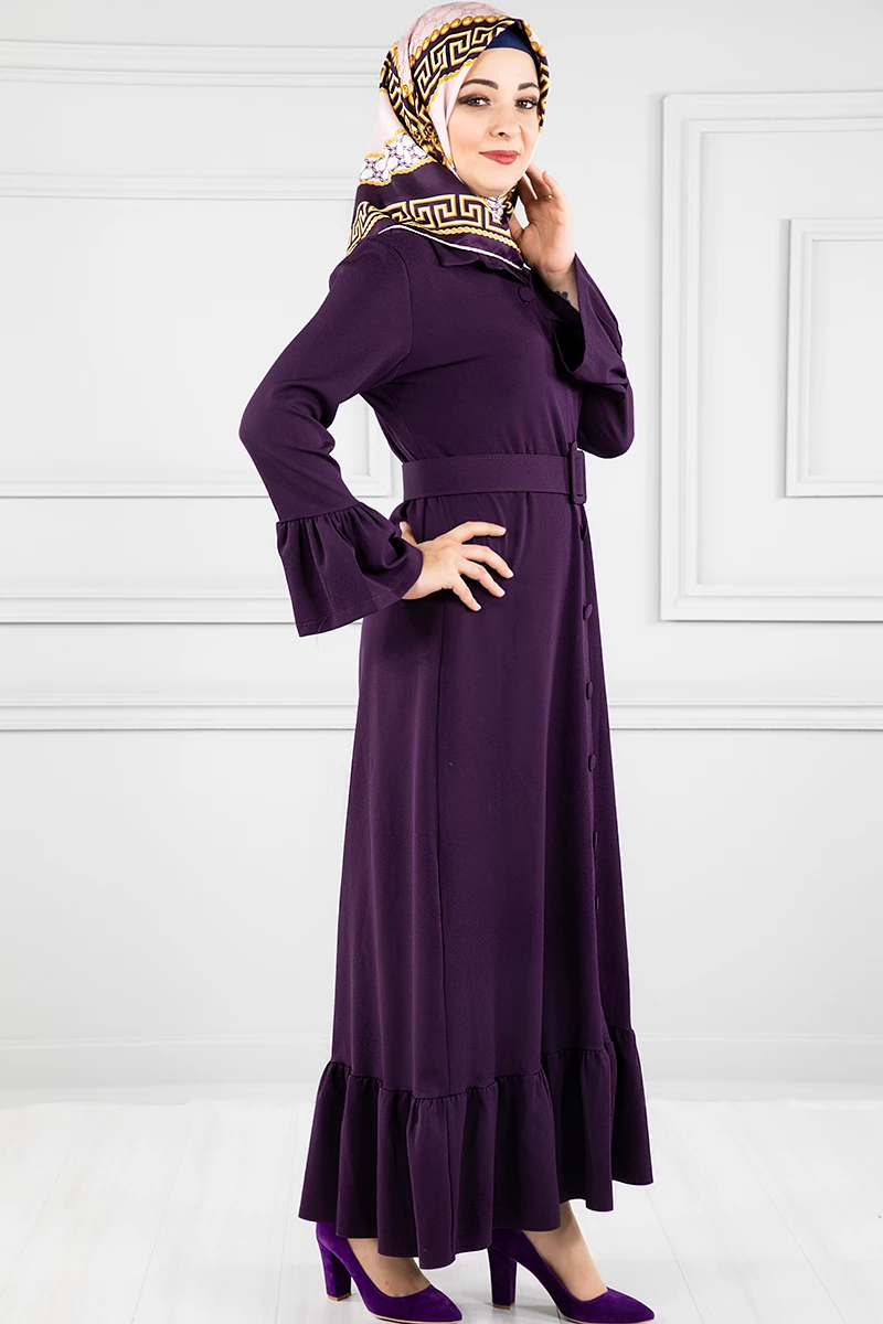 Düğmeli Volan Kollu Tesettür Elbise Mor 38