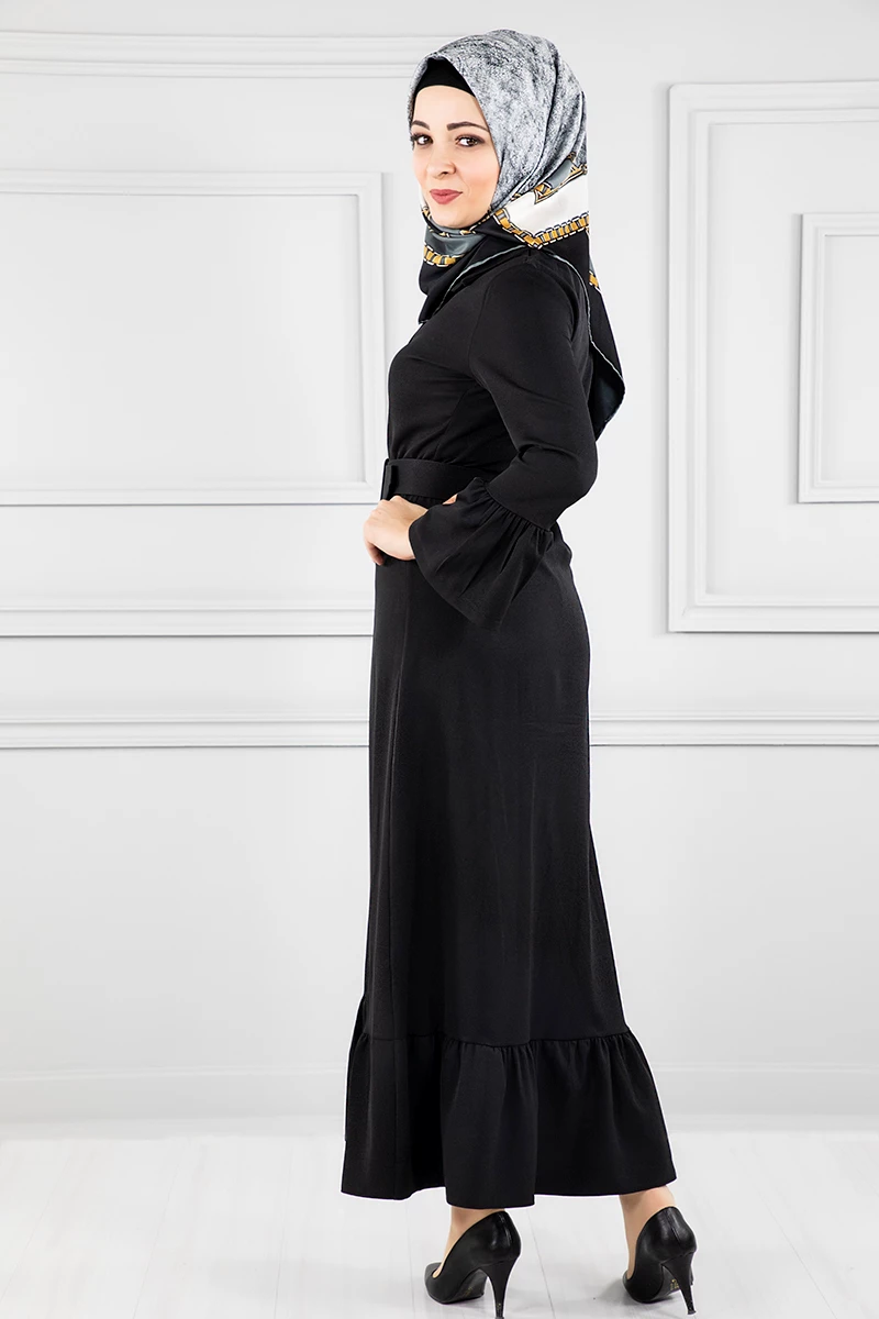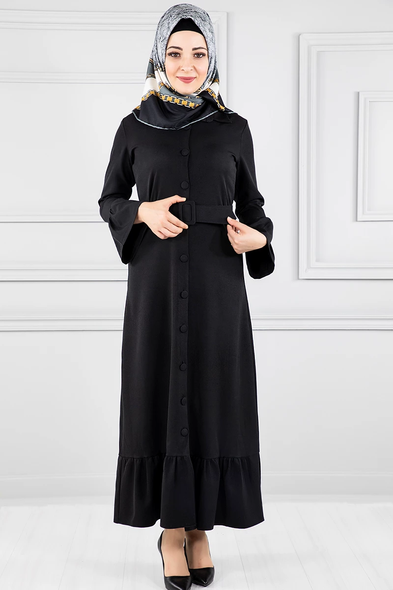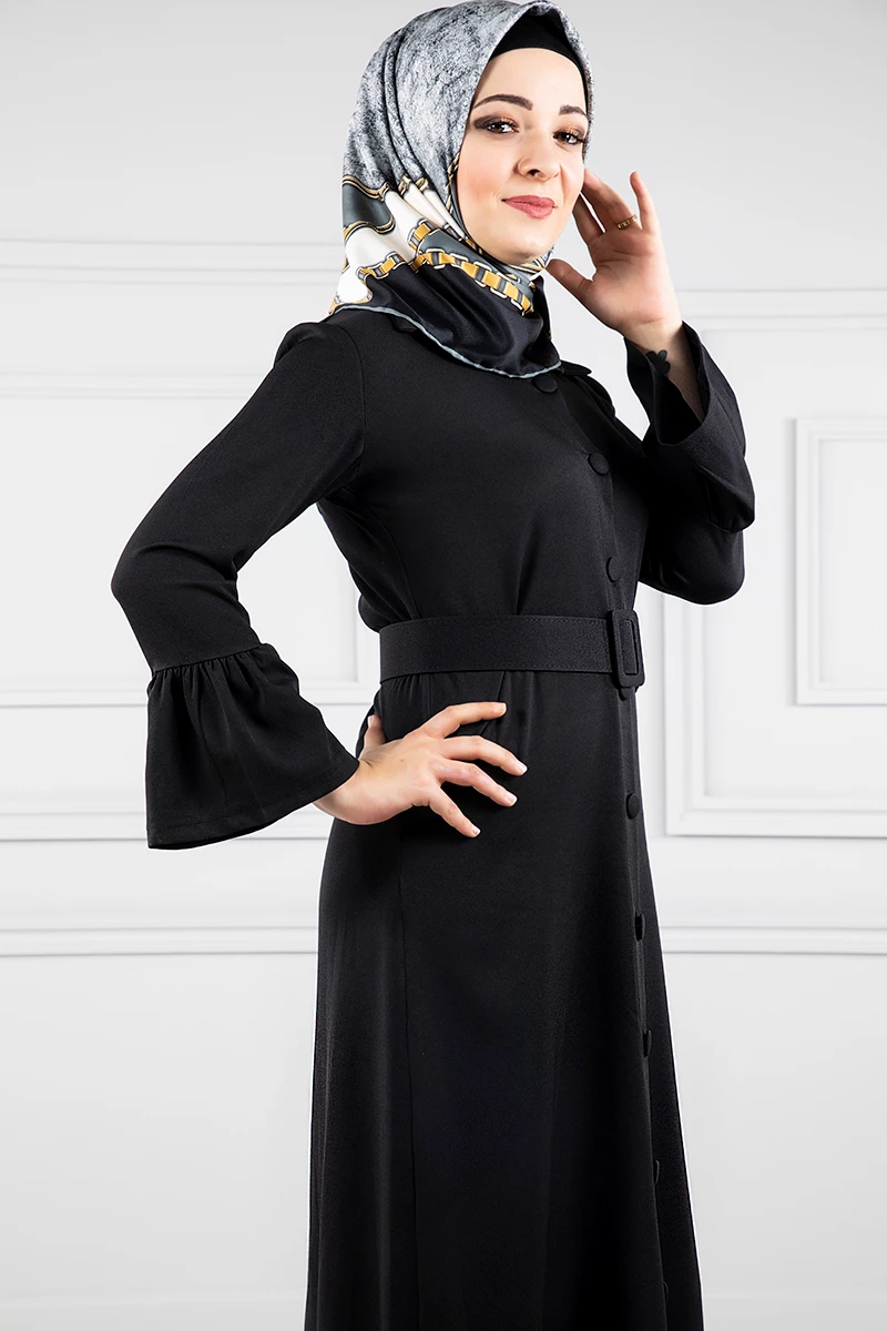 Düğmeli Volan Kollu Tesettür Elbise Siyah 38