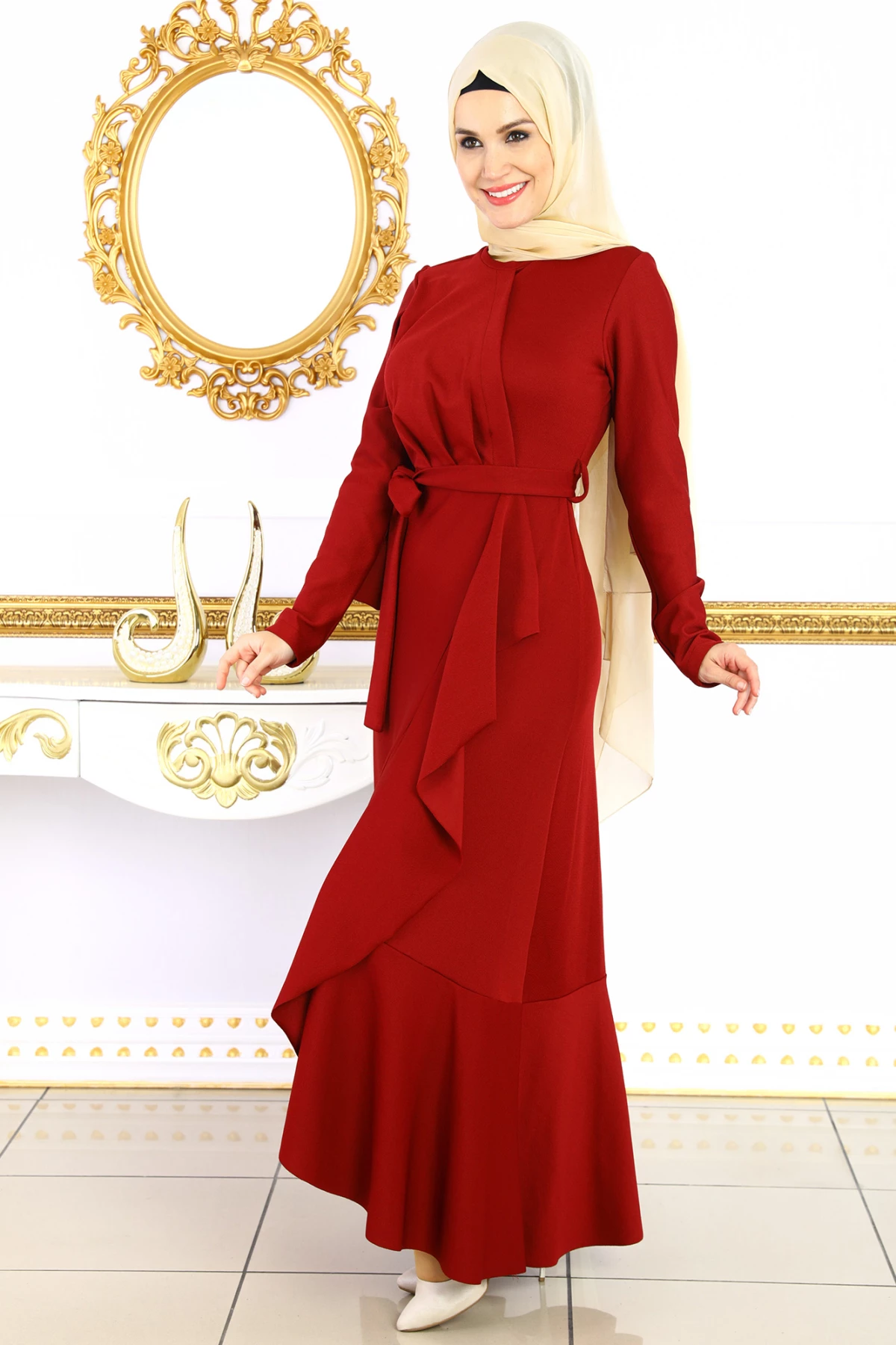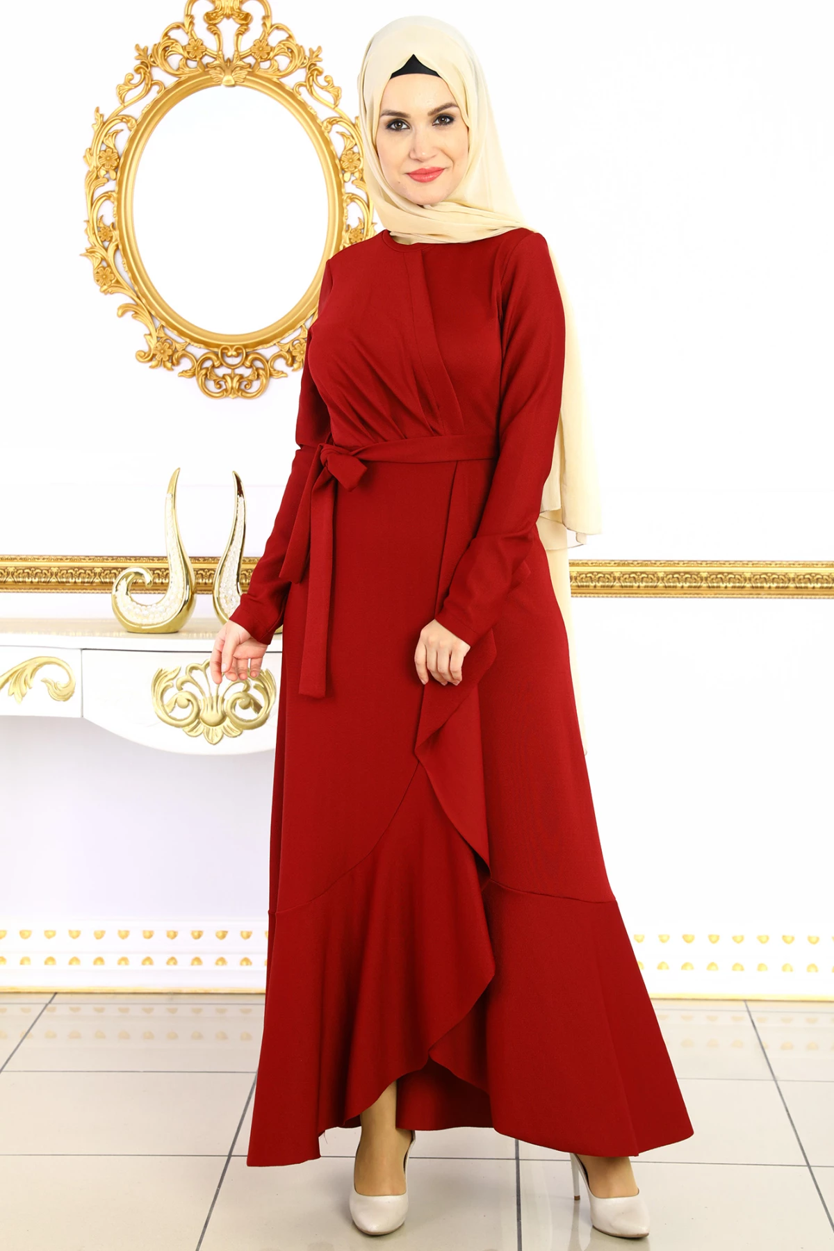 Fırfırlı Çapraz Tesettür Elbise Bordo 40
