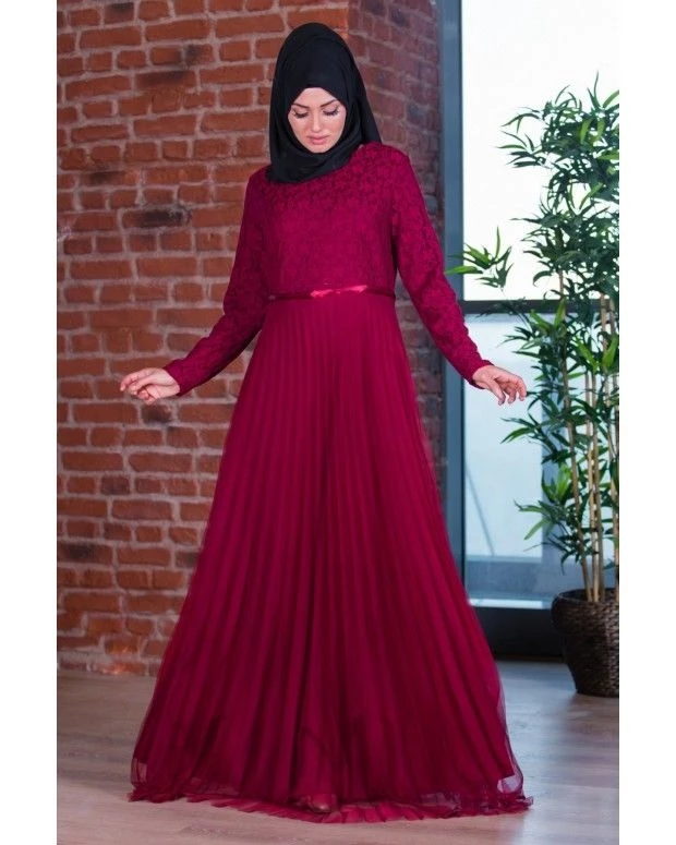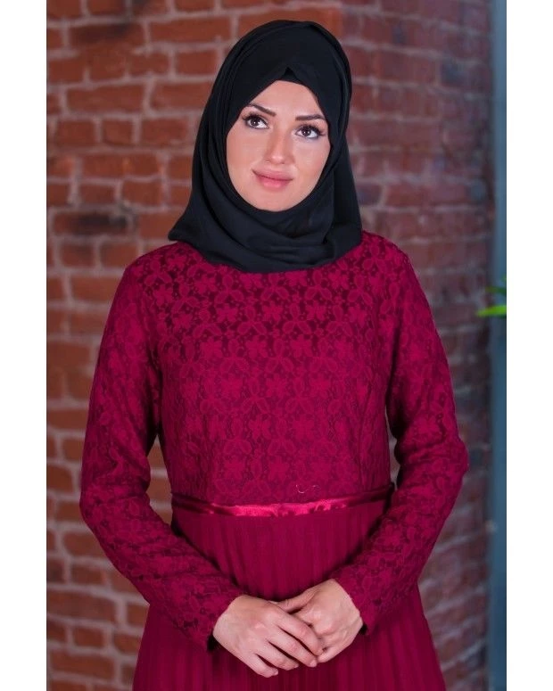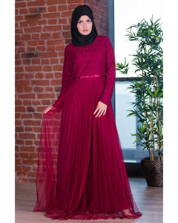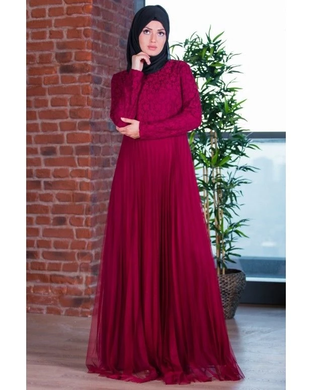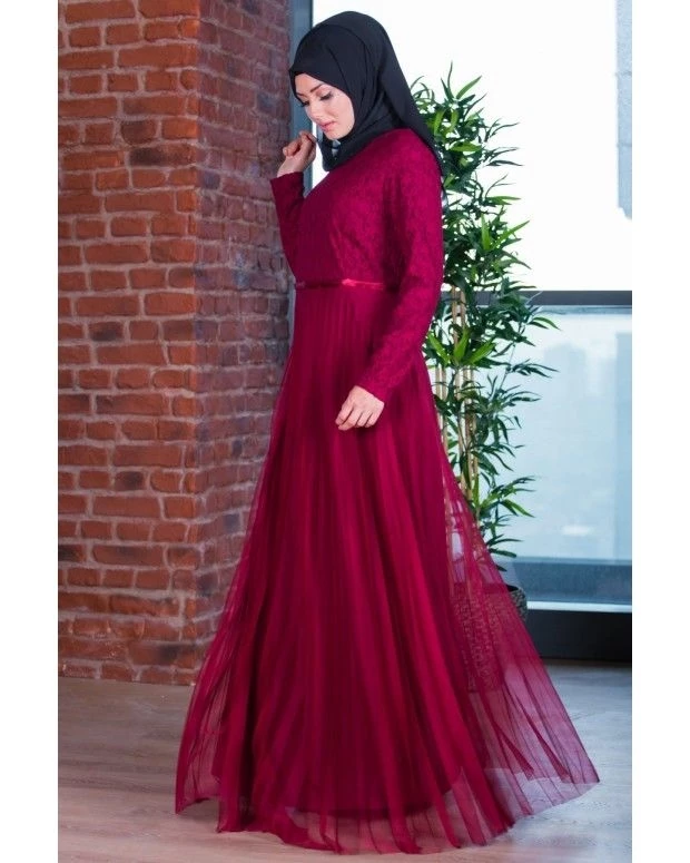 Güpür Detaylı Tüllü Abiye Elbise BORDO 20034 38