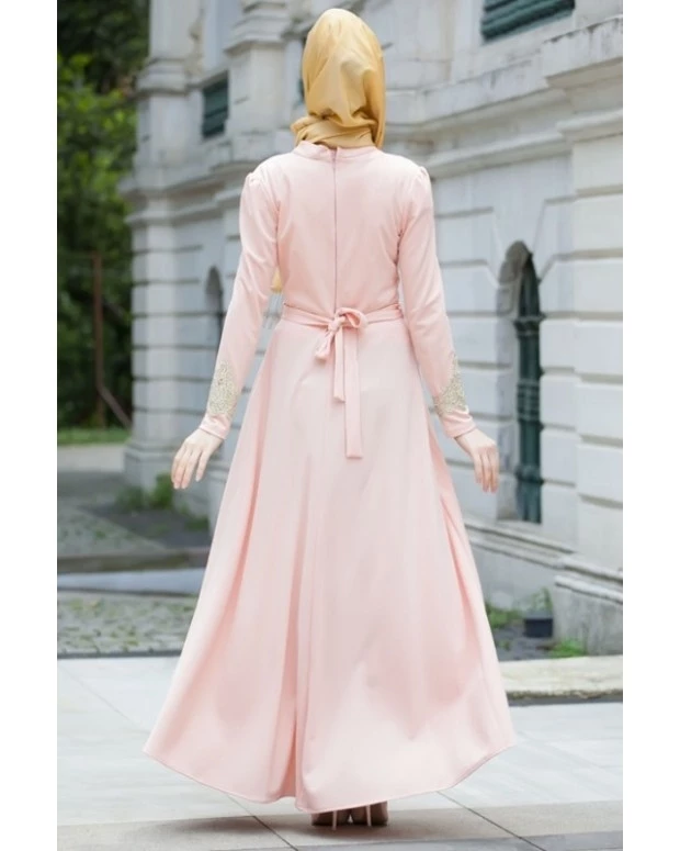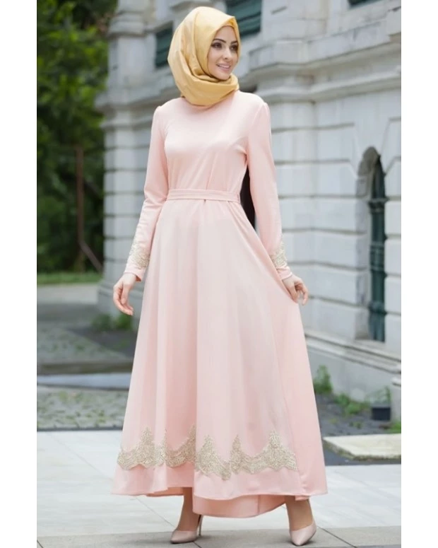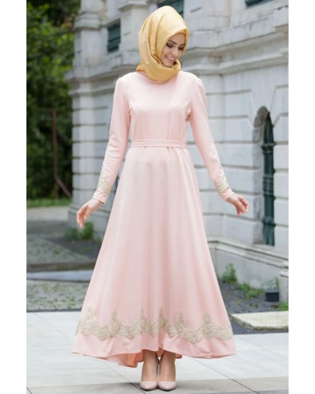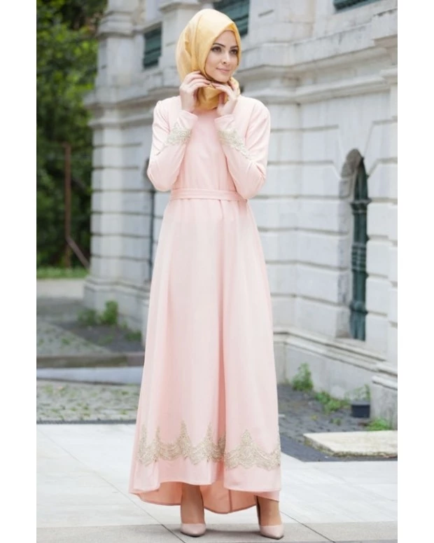 Güpürlü Kuyruklu Tesettür Abiye Elbise Pudra 3054 48