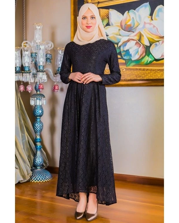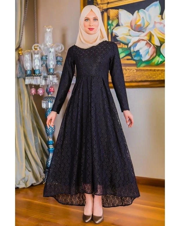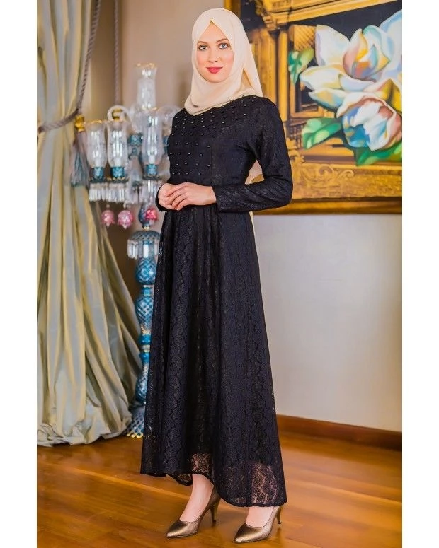 İnci Detaylı Güpürlü Tesettür Abiye Elbise 20037 Siyah 38