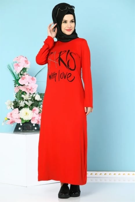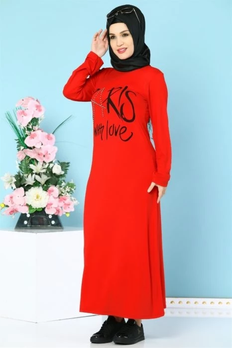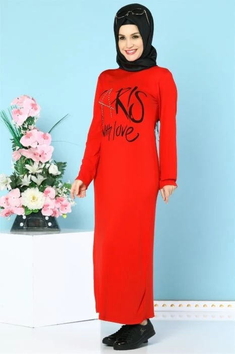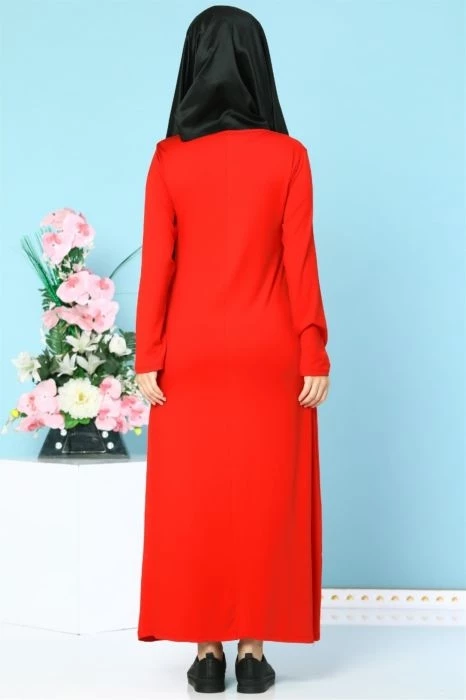 İnci İşlemeli Likralı Tesettür Elbise Kırmızı S
