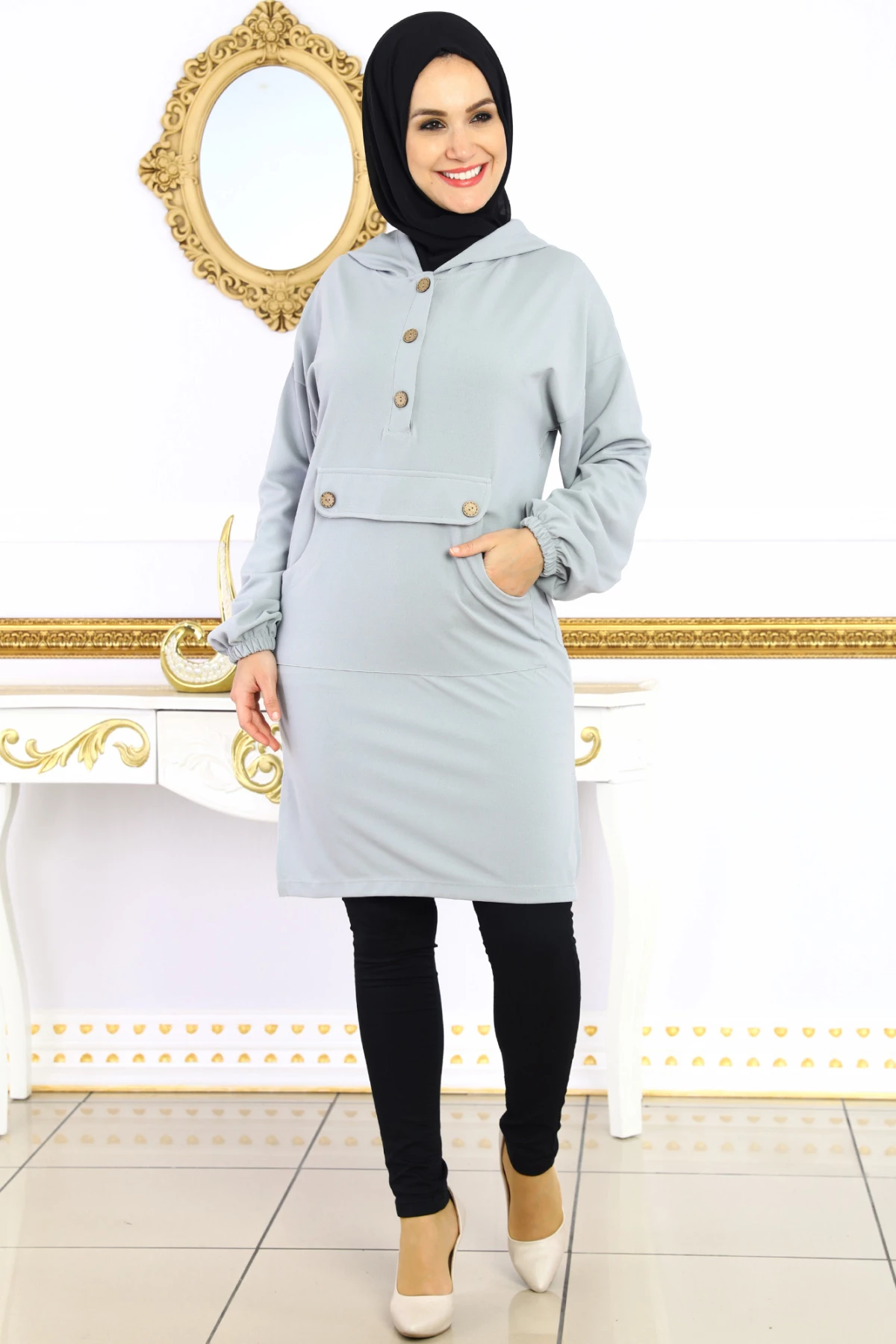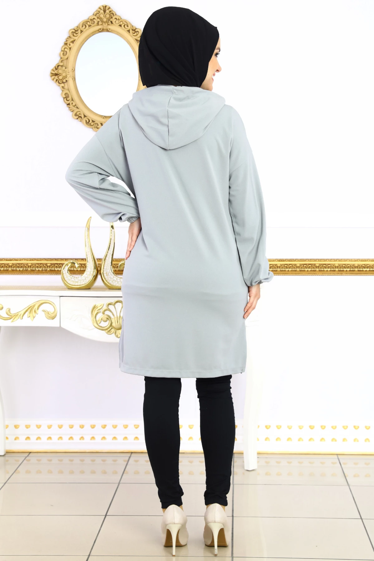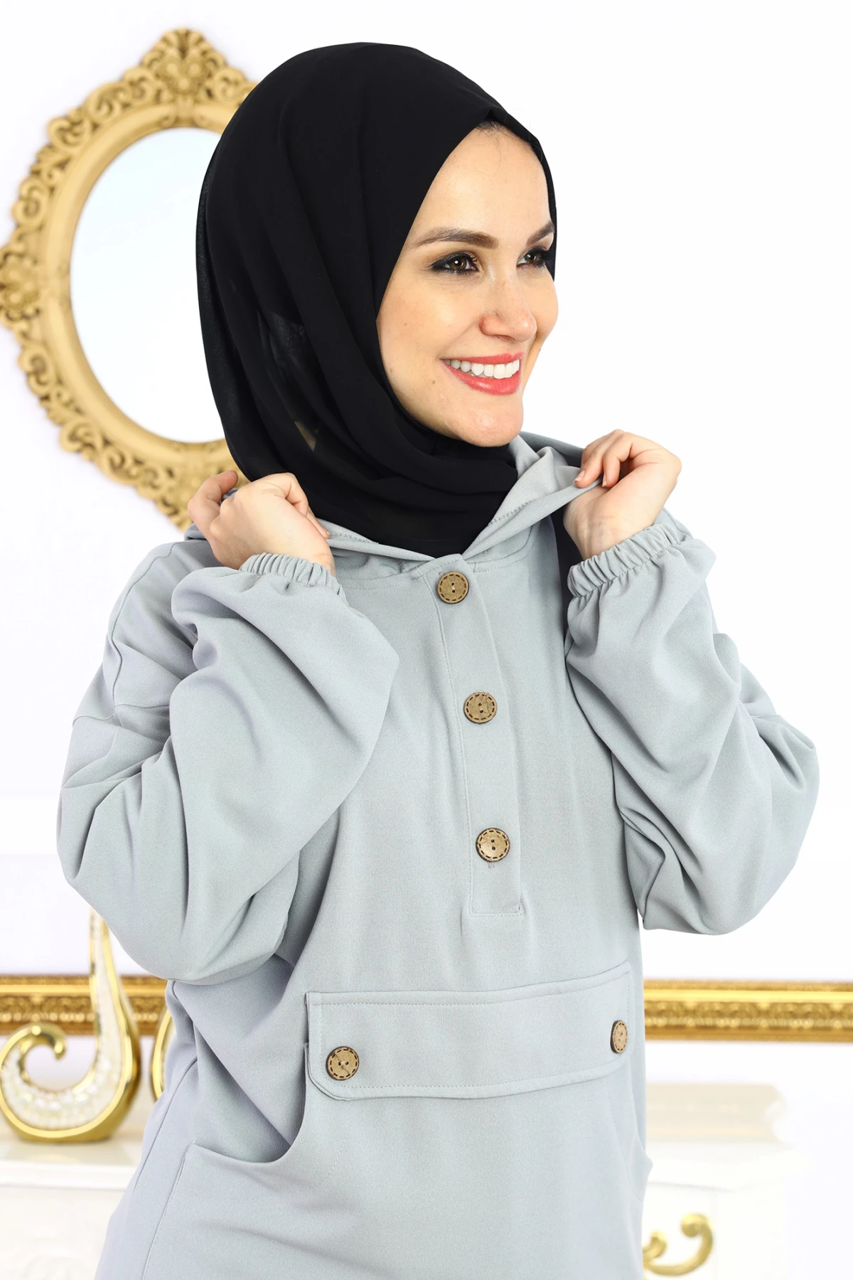 Needion - Kanguru Cepli Tesettur Tunik Gri 44