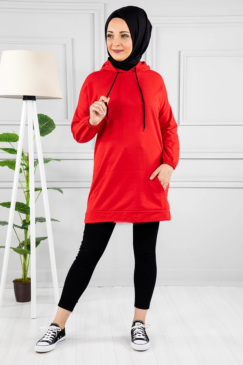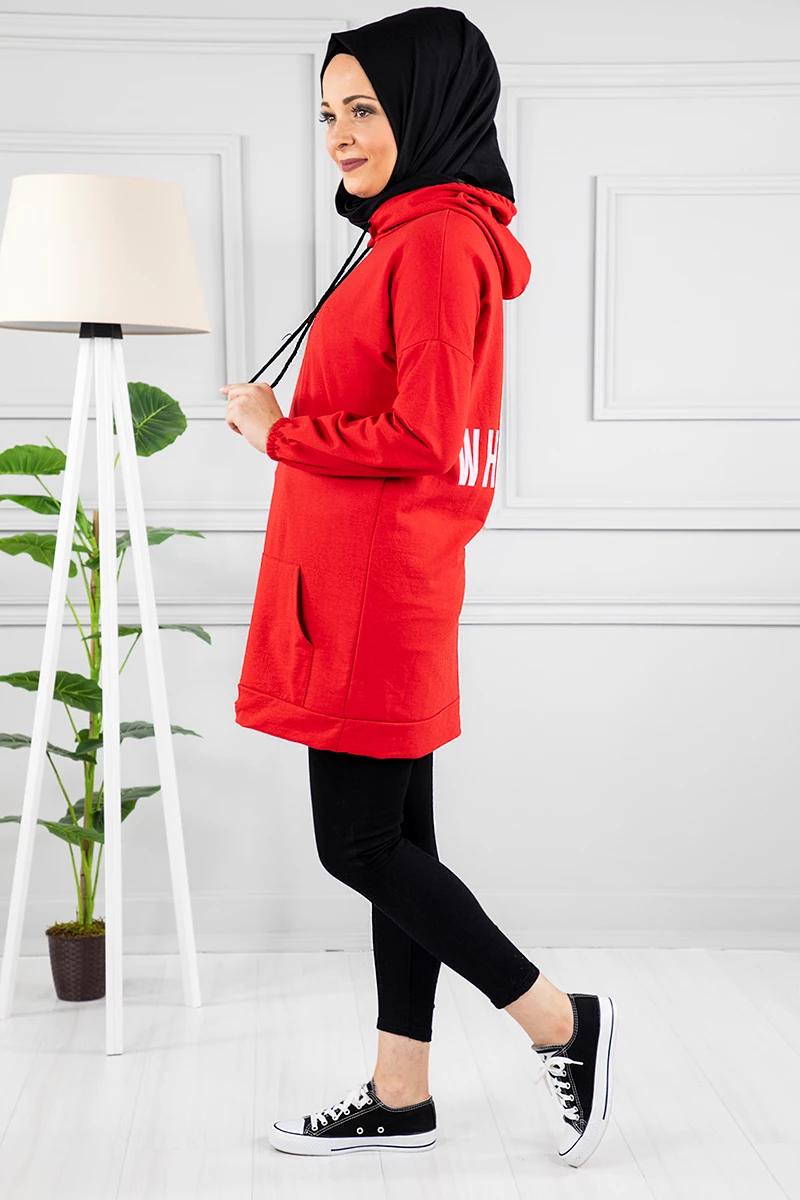 Kapşonlu Arkası Baskılı Sweat-Tunik Kırmızı STD(38-48)