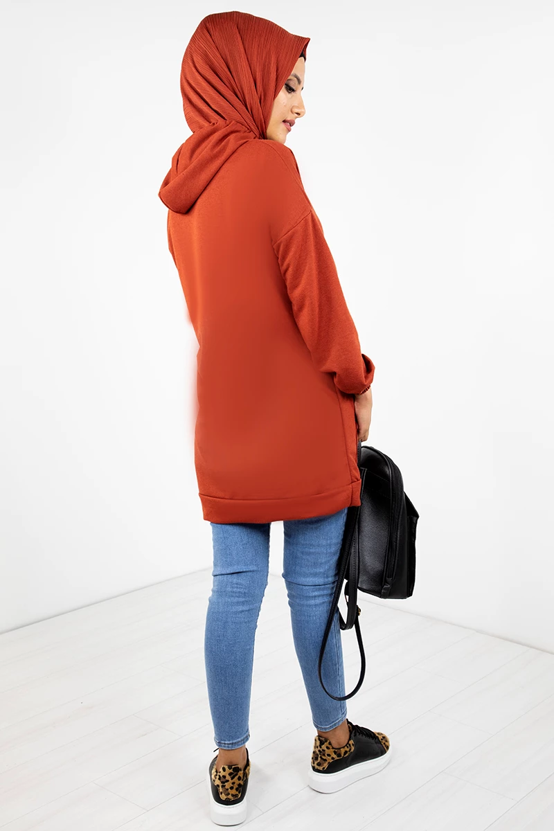 Needion - Kapşonlu Baskılı Tesettür Tunik EMR3066 Kiremit STD(36-42)