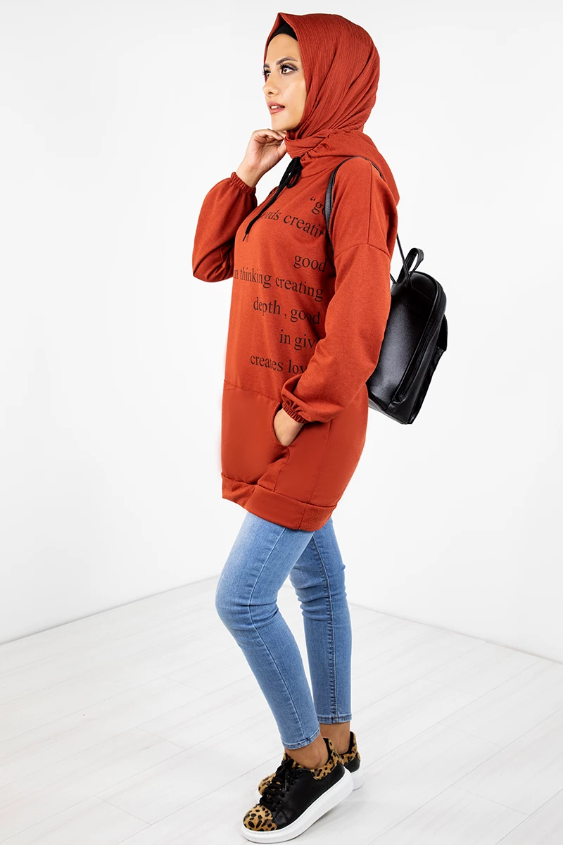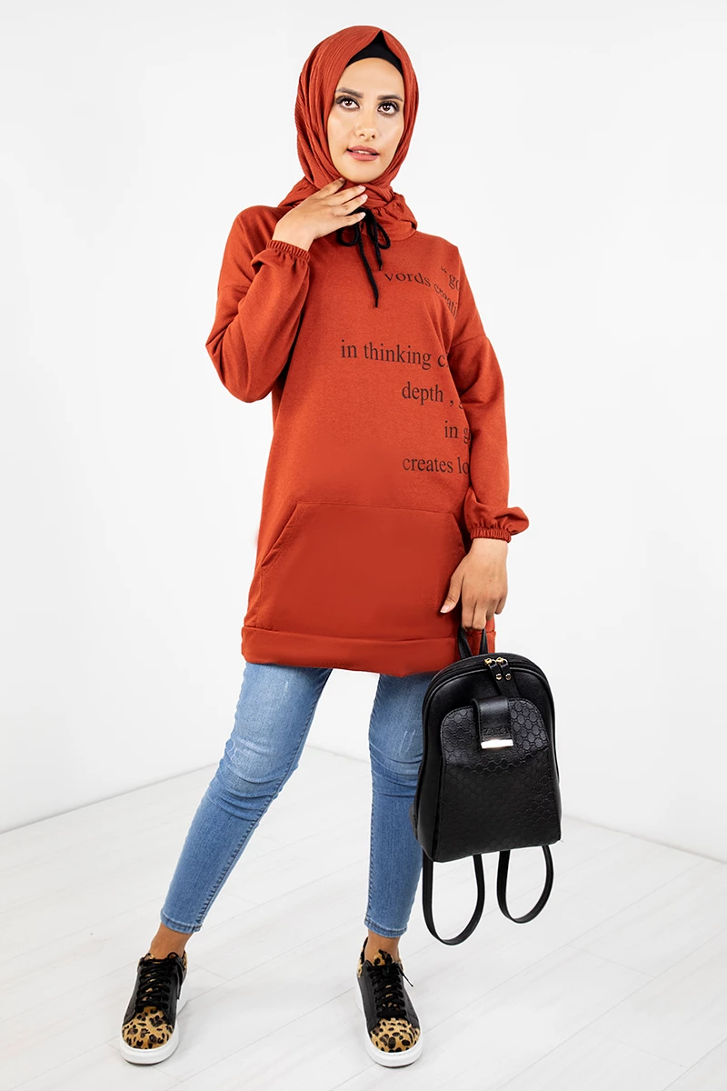 Kapşonlu Baskılı Tesettür Tunik EMR3066 Kiremit STD(36-42)