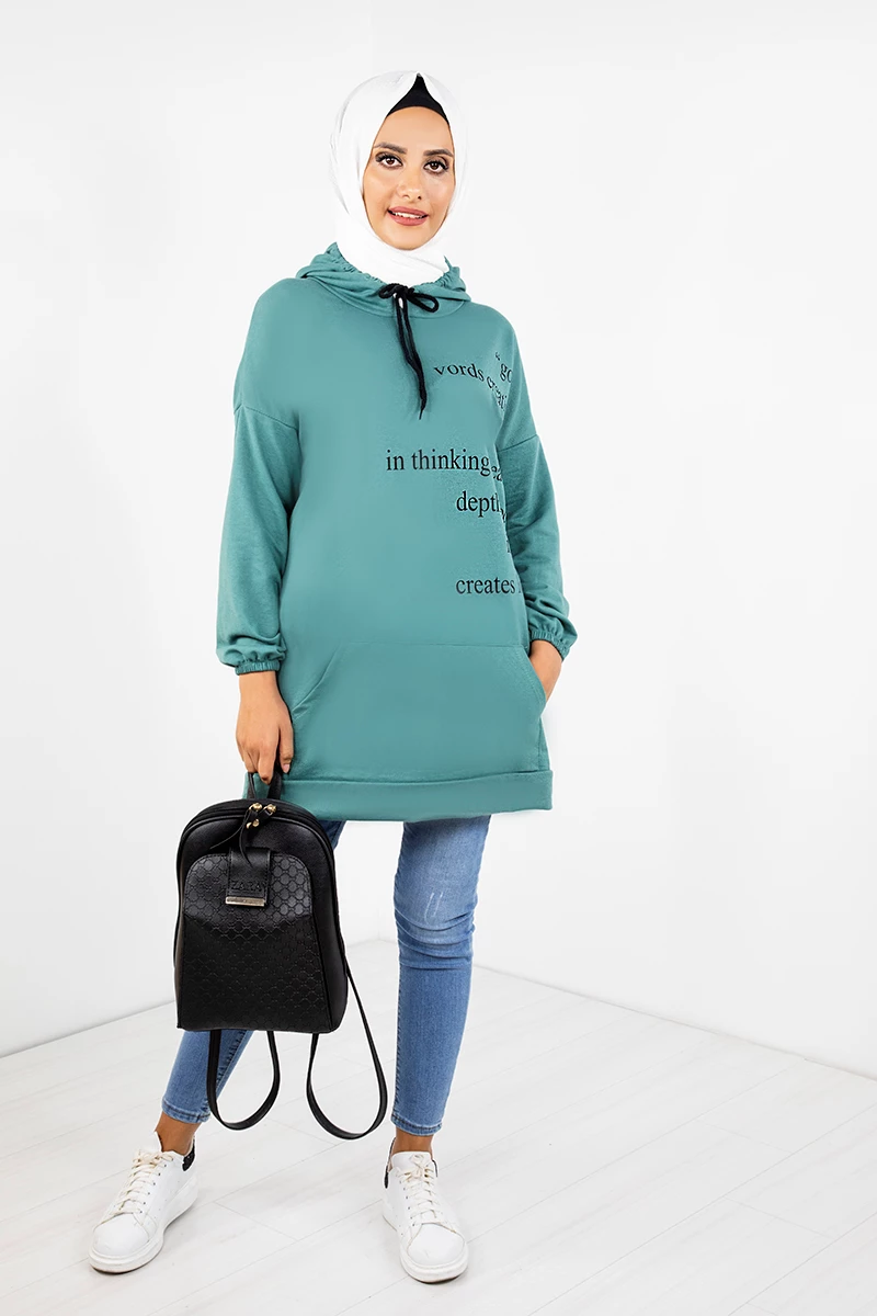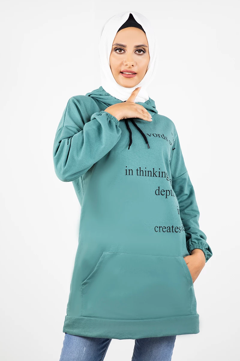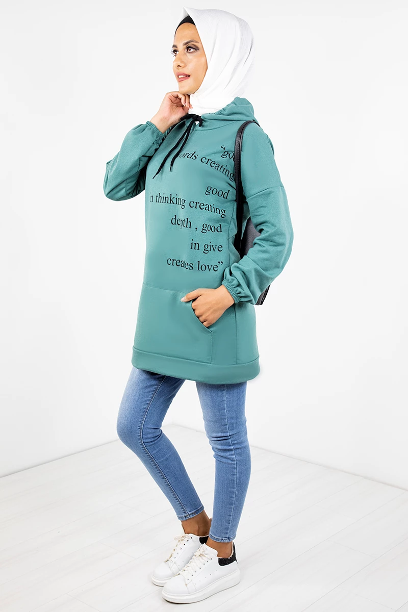 Needion - Kapşonlu Baskılı Tesettür Tunik EMR3066 Mint STD(36-42)