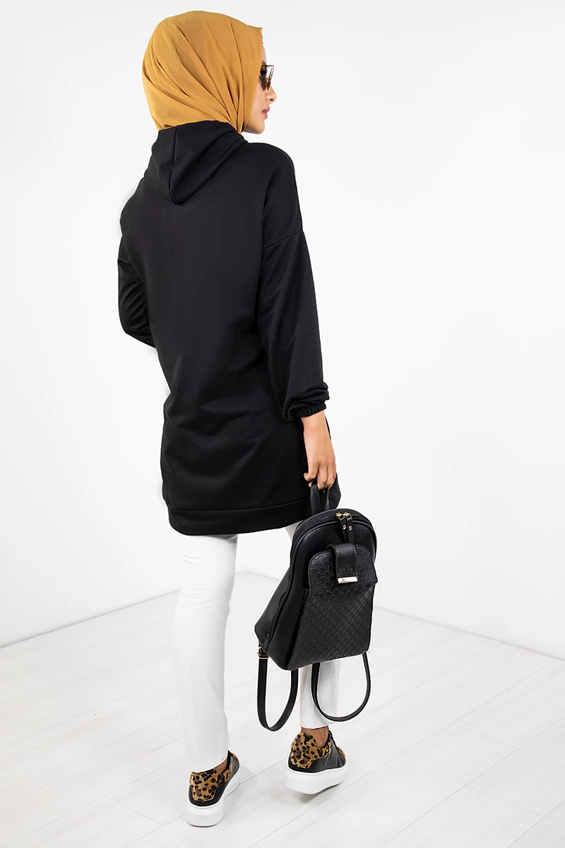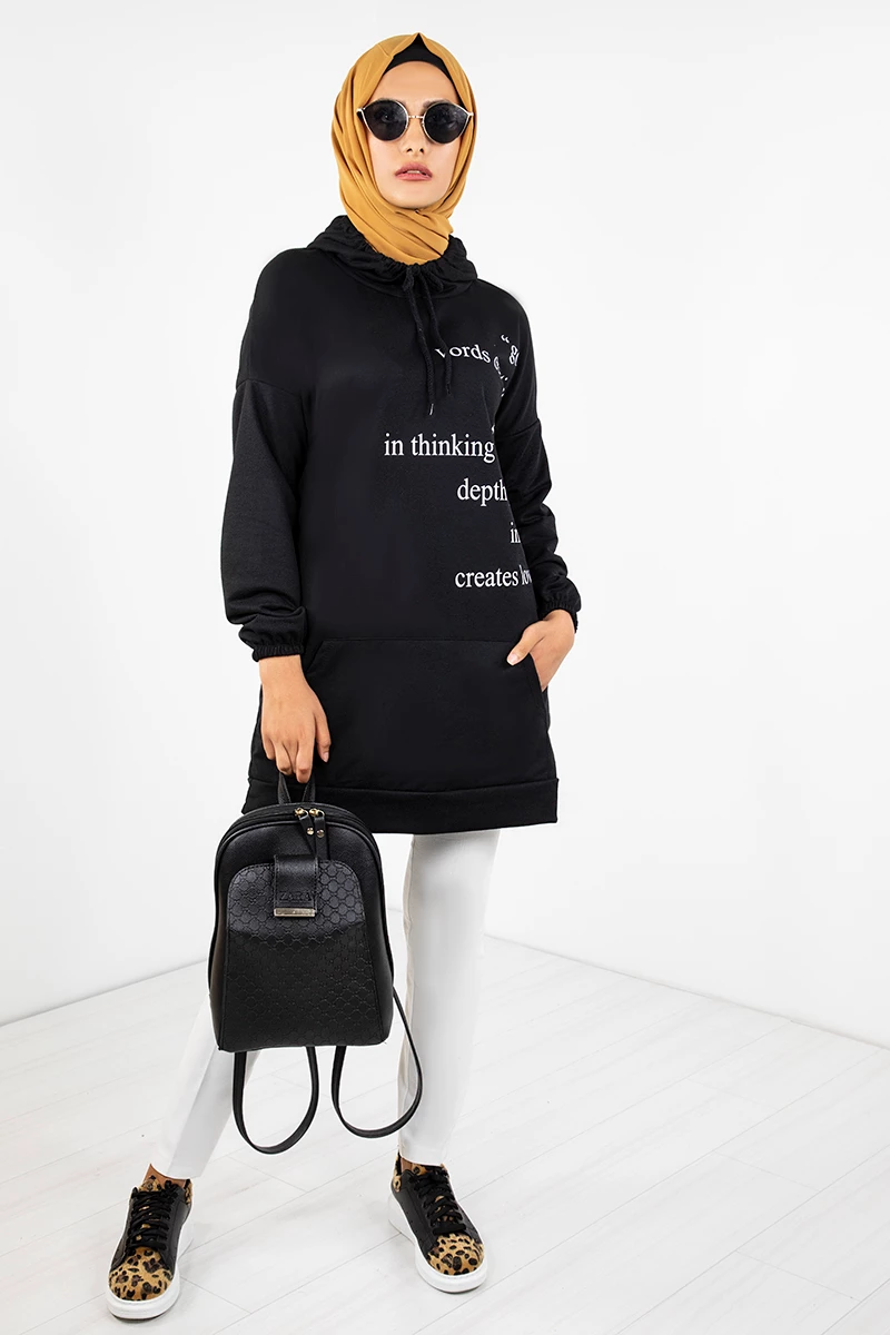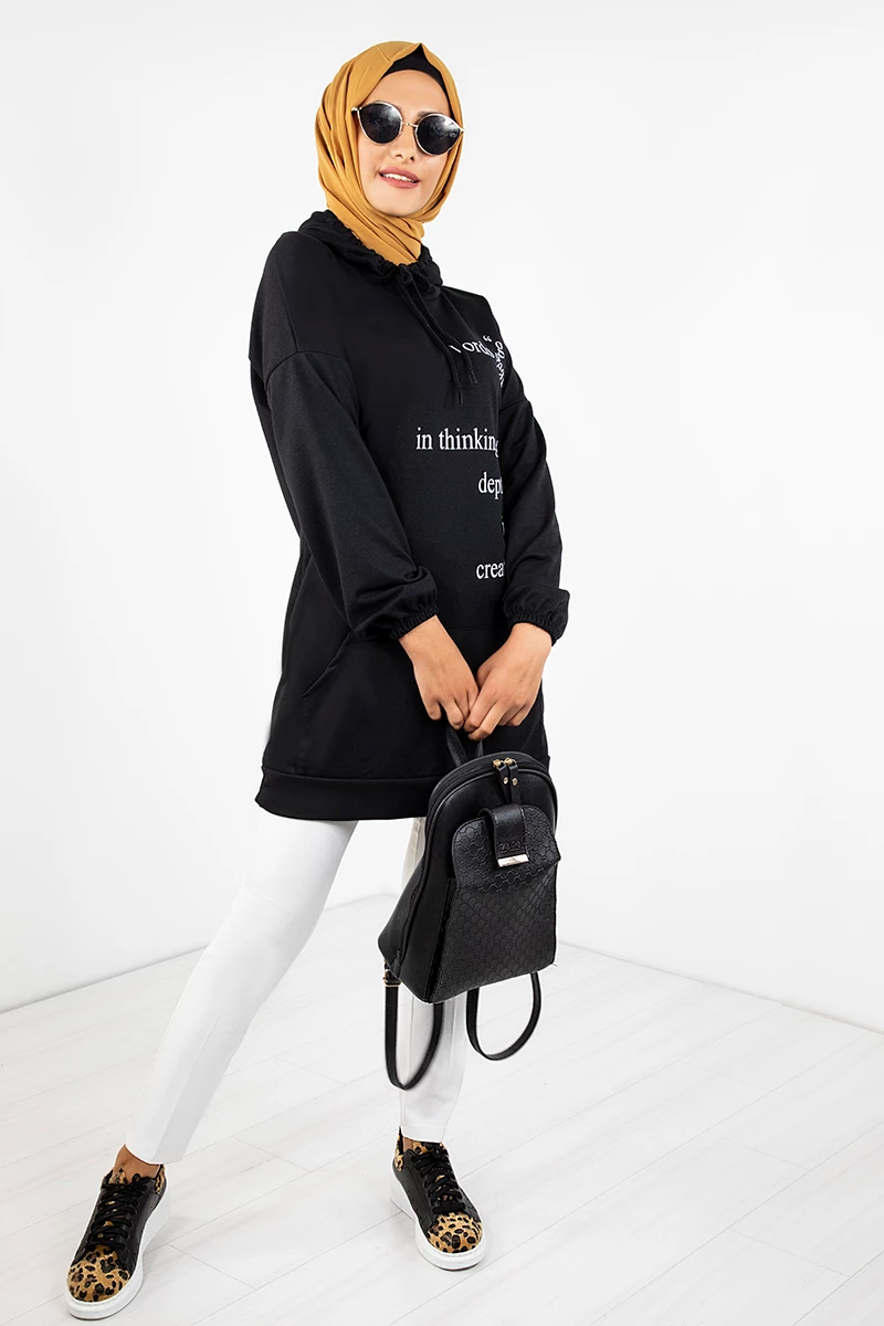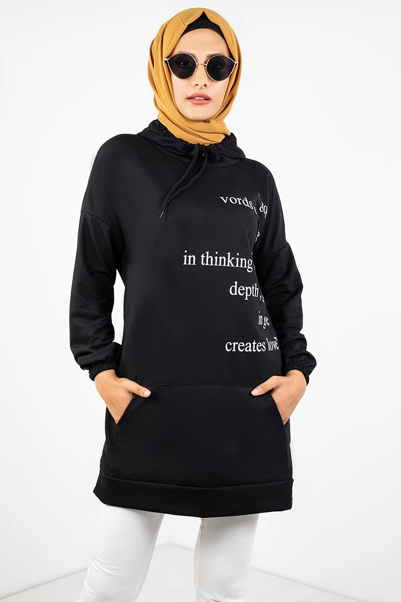 Kapşonlu Baskılı Tesettür Tunik EMR3066 Siyah STD(36-42)