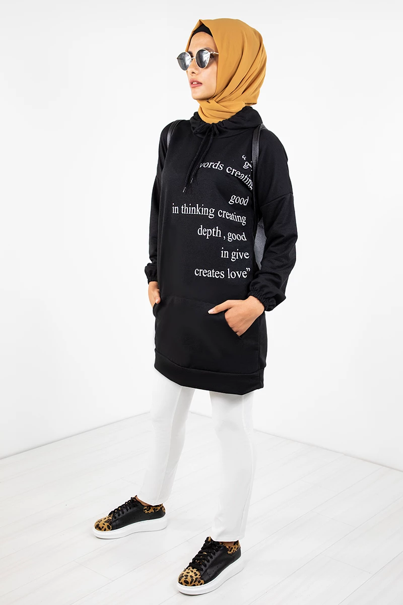 Needion - Kapşonlu Baskılı Tesettür Tunik EMR3066 Siyah STD(36-42)