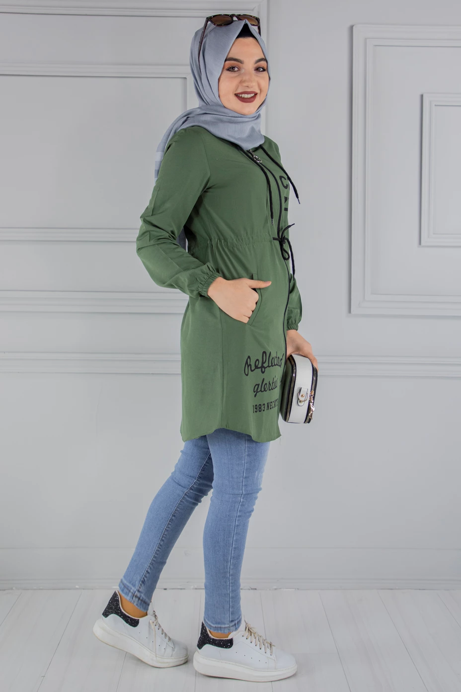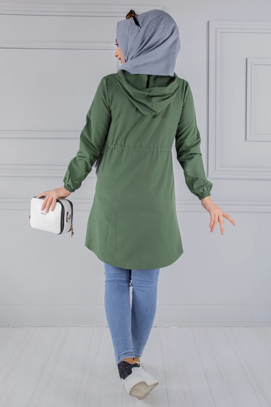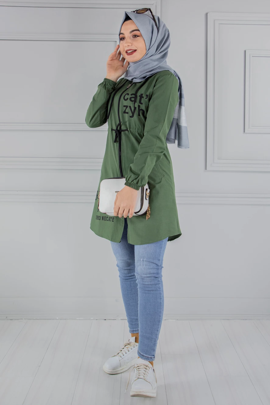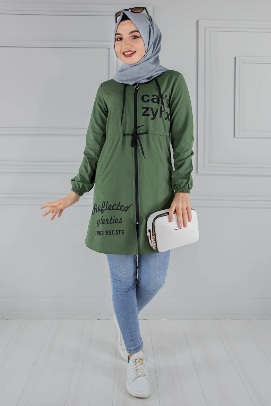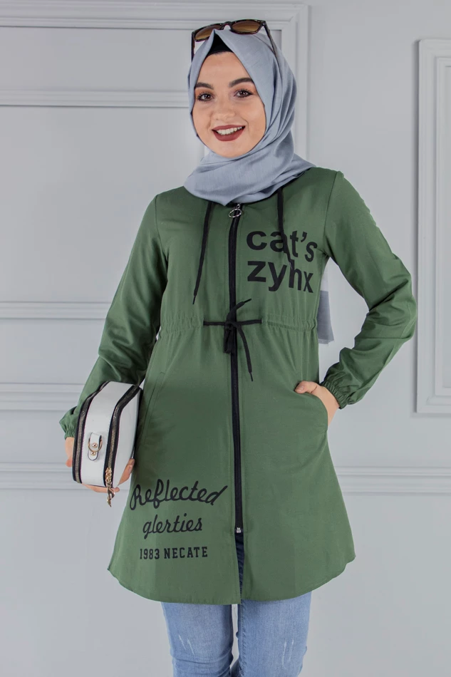 Kapşonlu Fermuarlı Tesettür Kap Haki 46