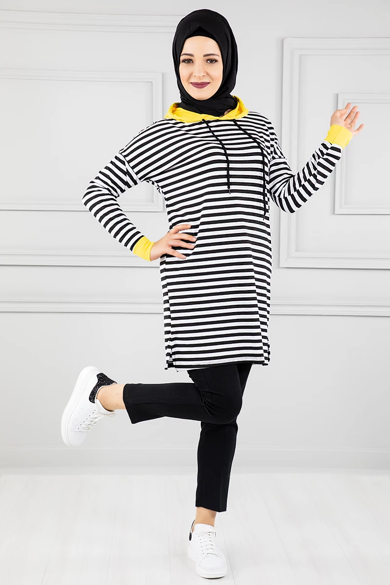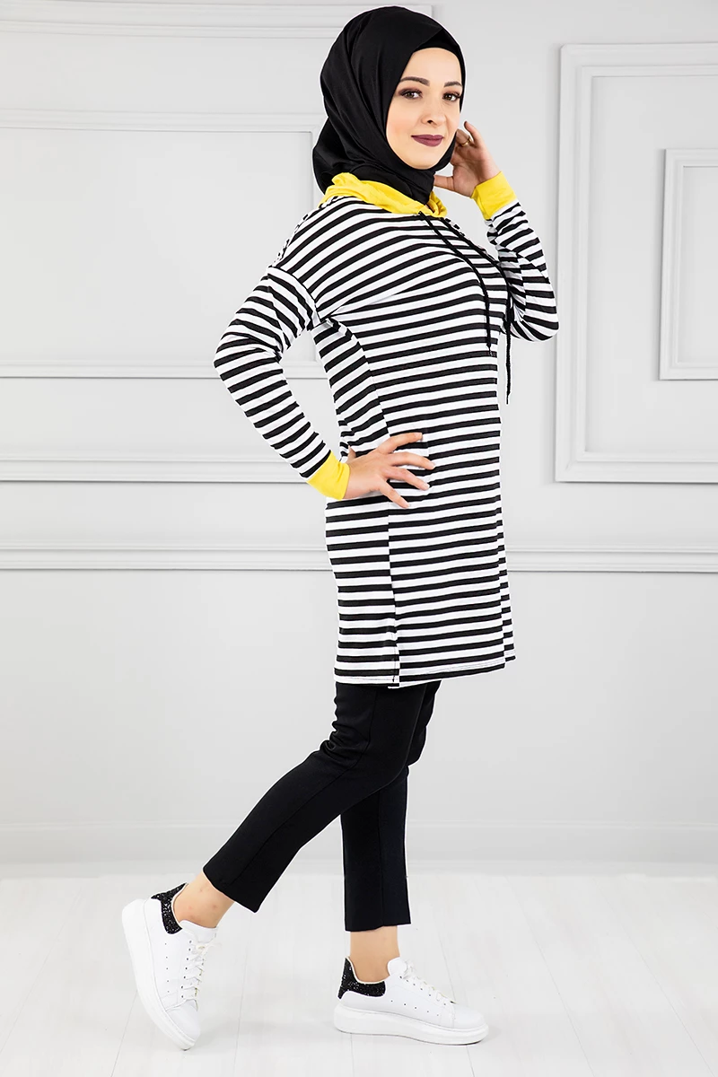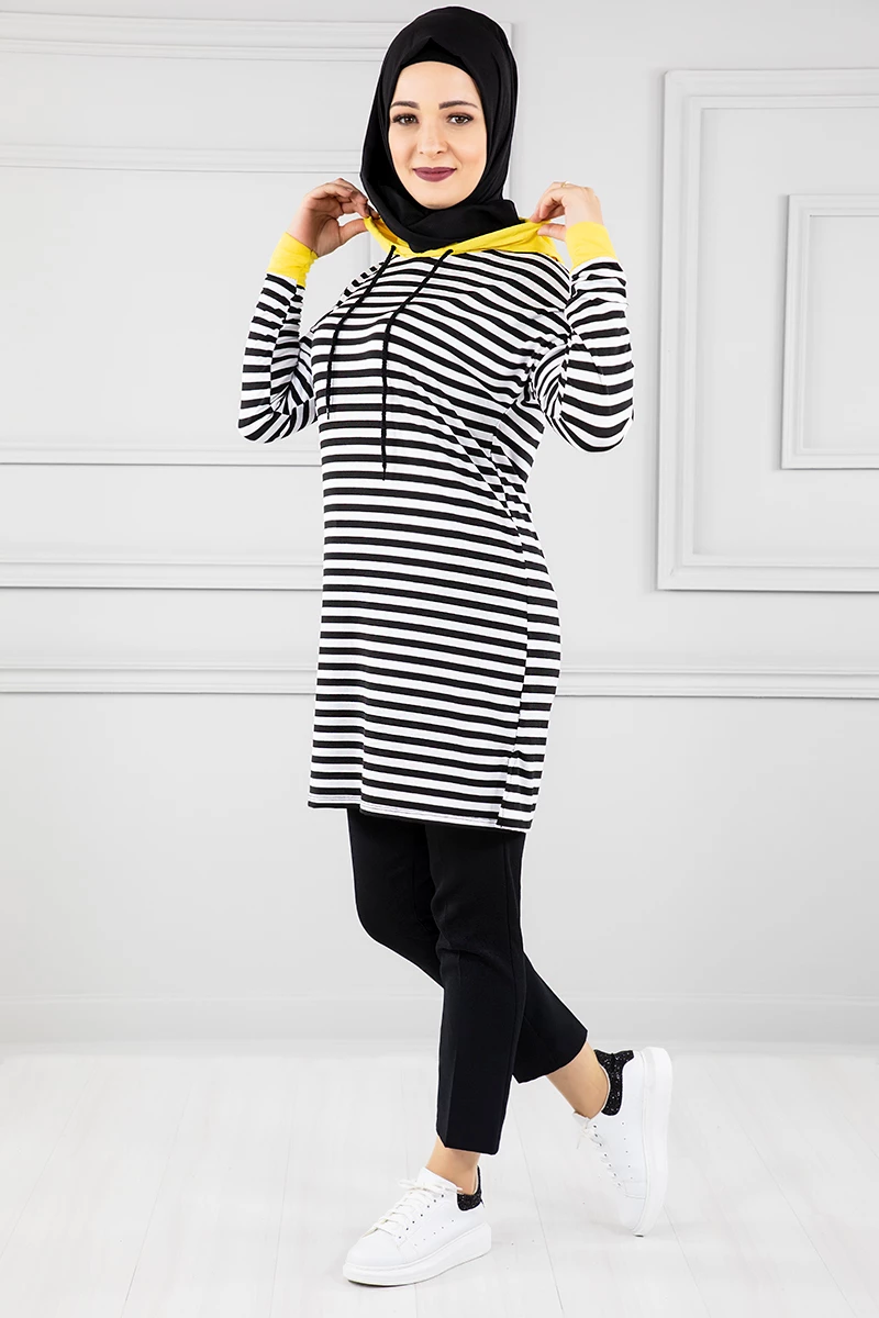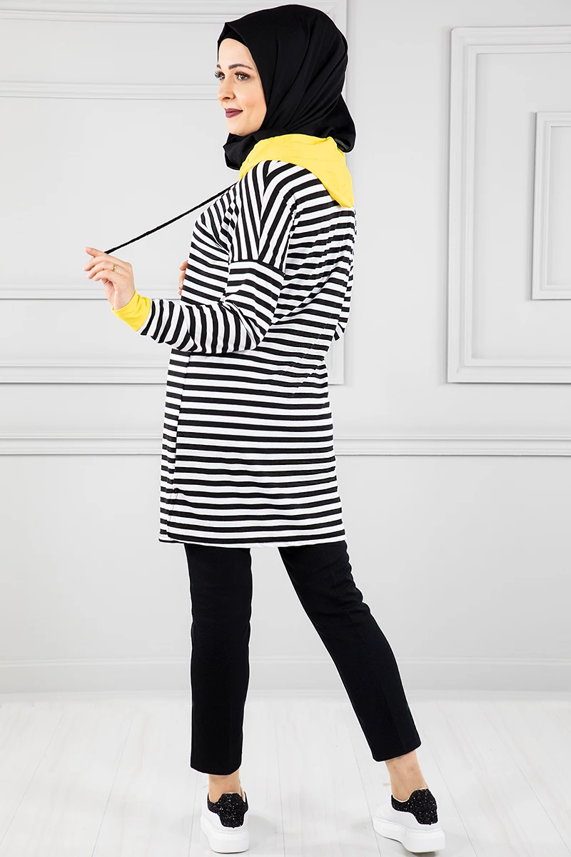 Needion - Kapşonlu Zebra Desenli Tesettür Tunik Sarı STD(36-44)