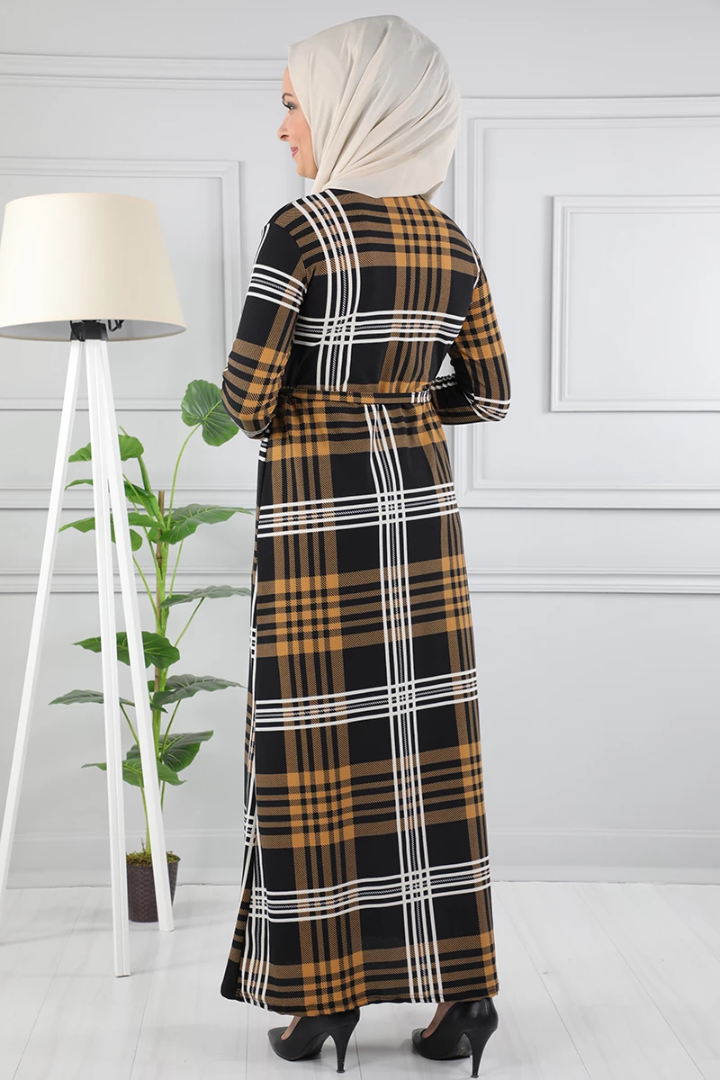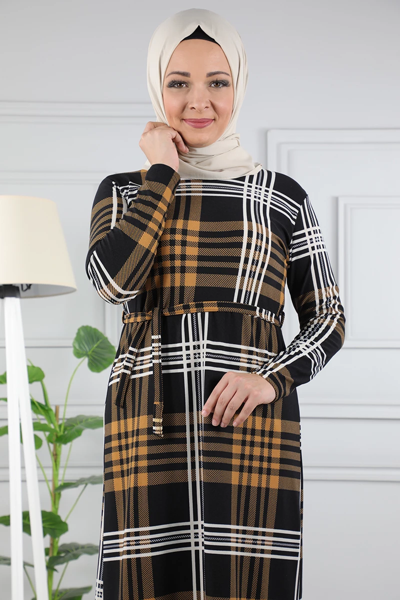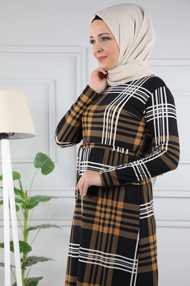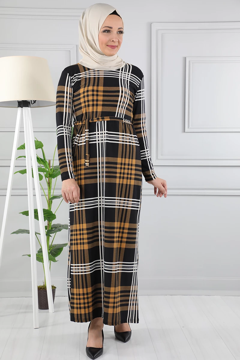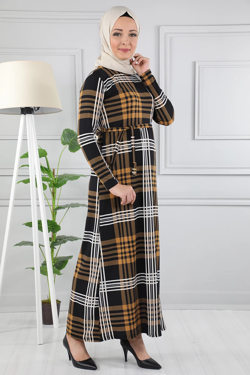 Kare Desenli Beli Kuşaklı Tesettür Elbise AZ1017 Taba L