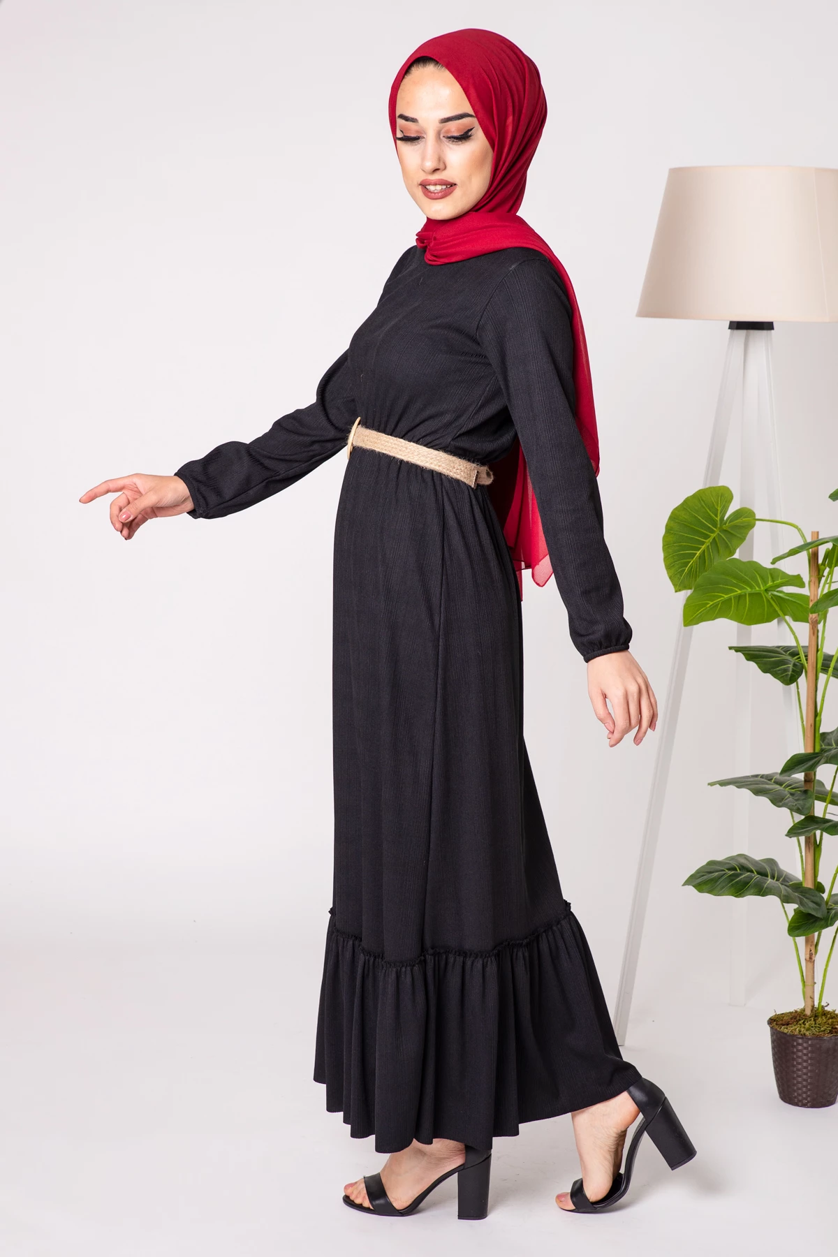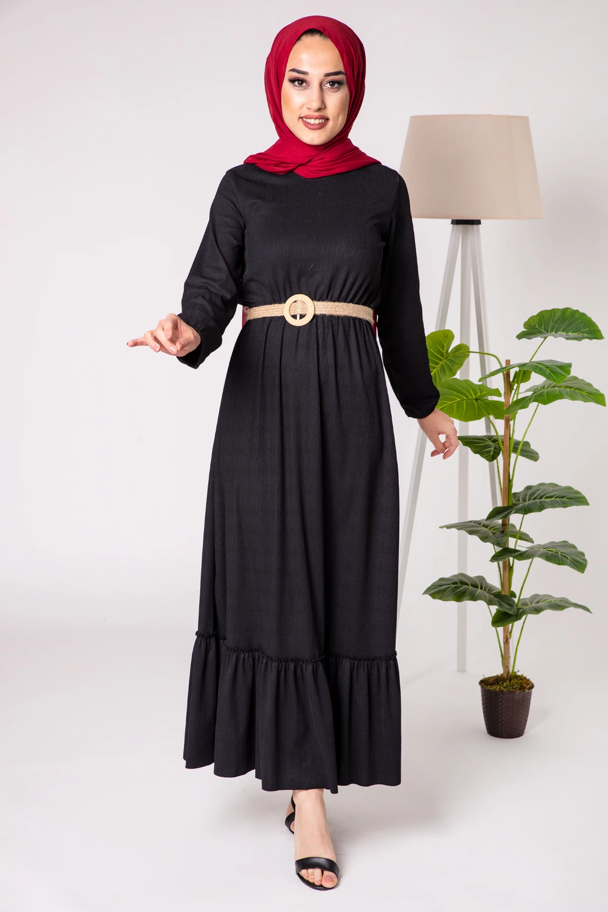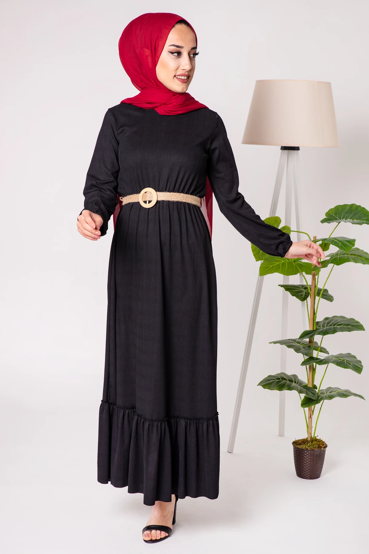 Needion - Kemerli Bisiklet Yaka Tesettür Elbise Siyah BRT1001SH S