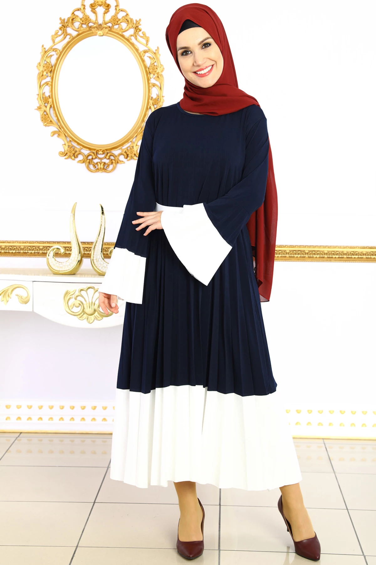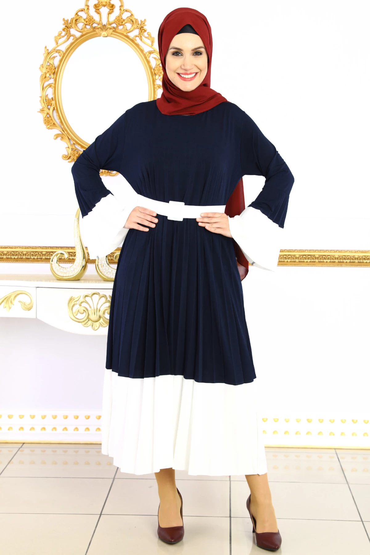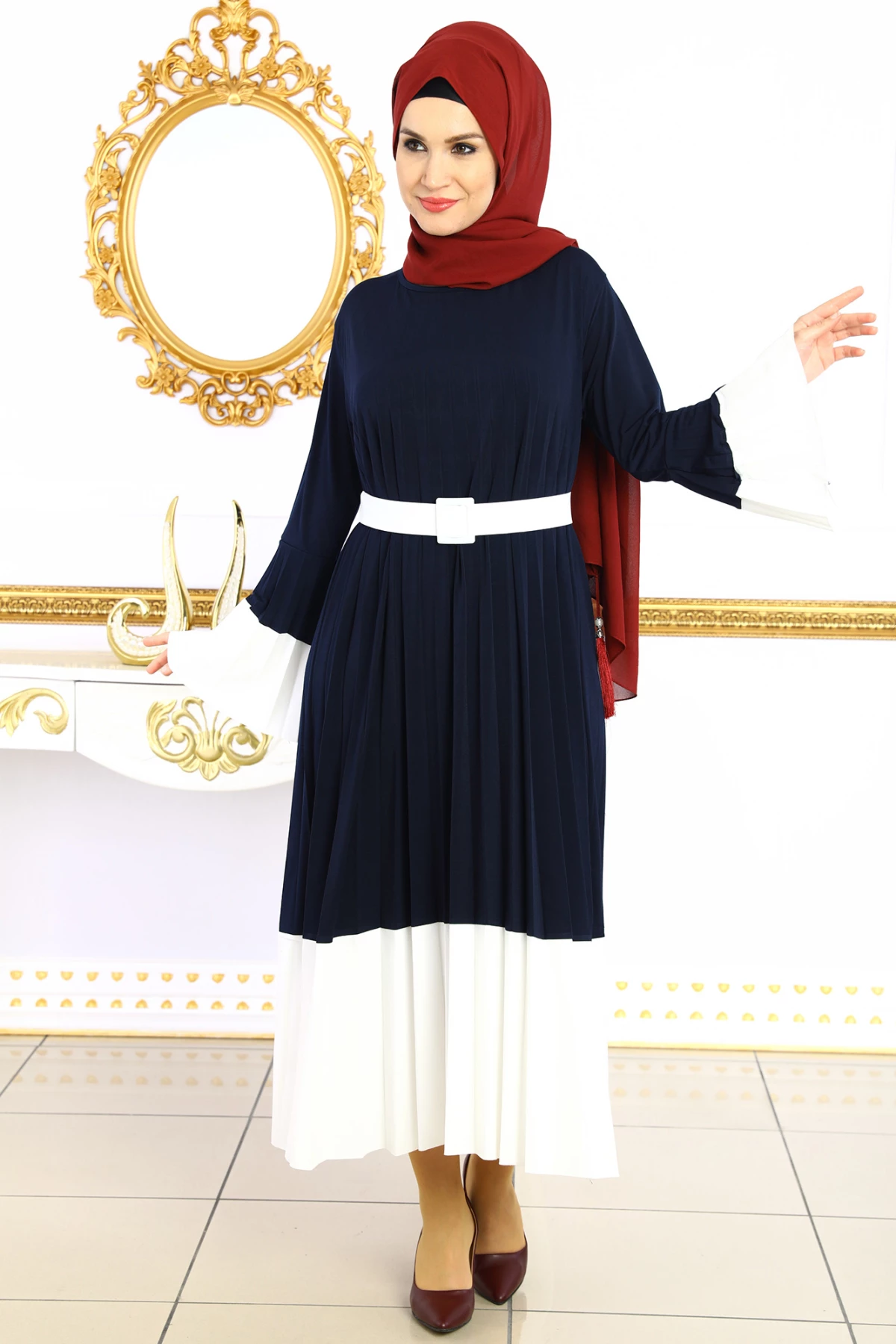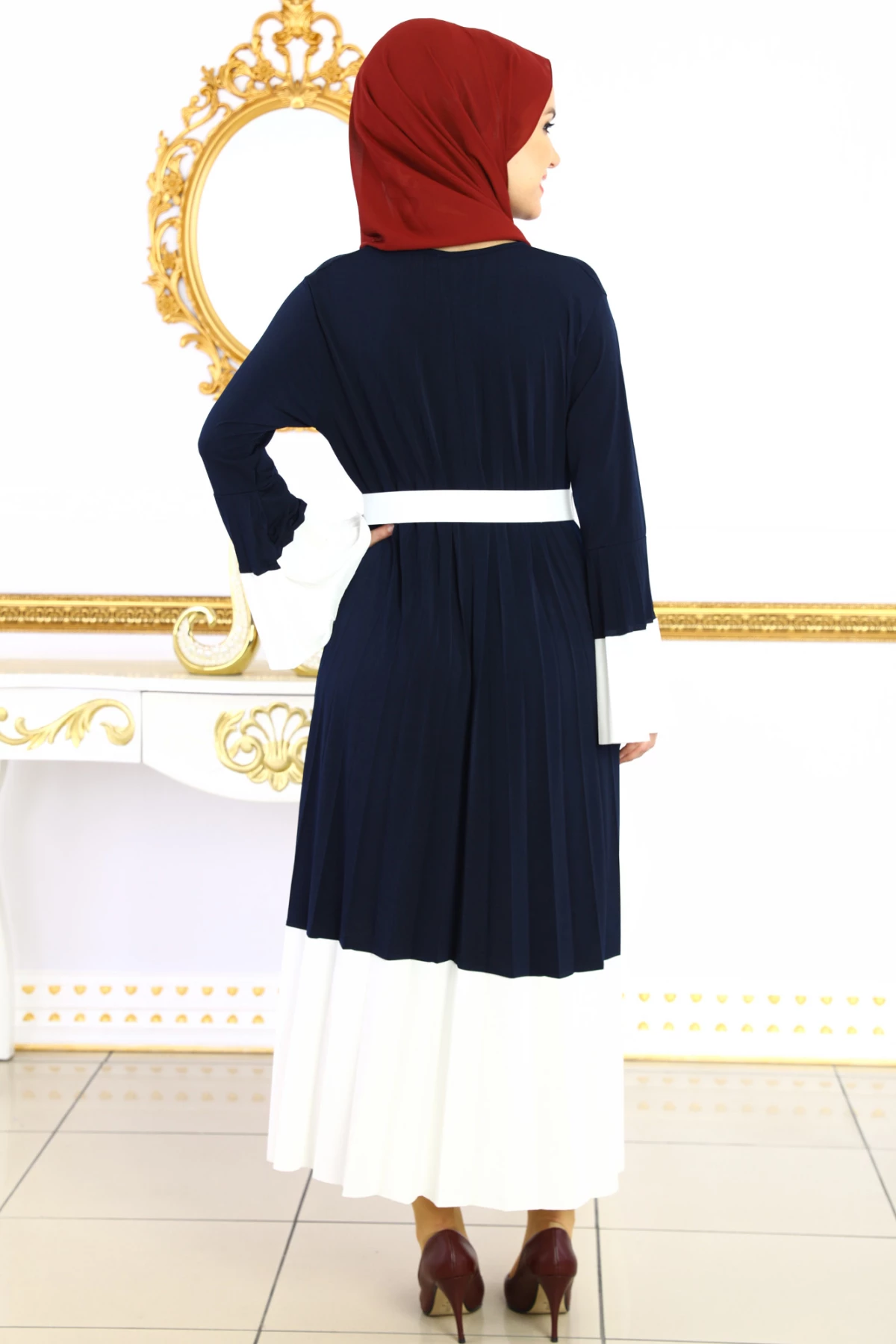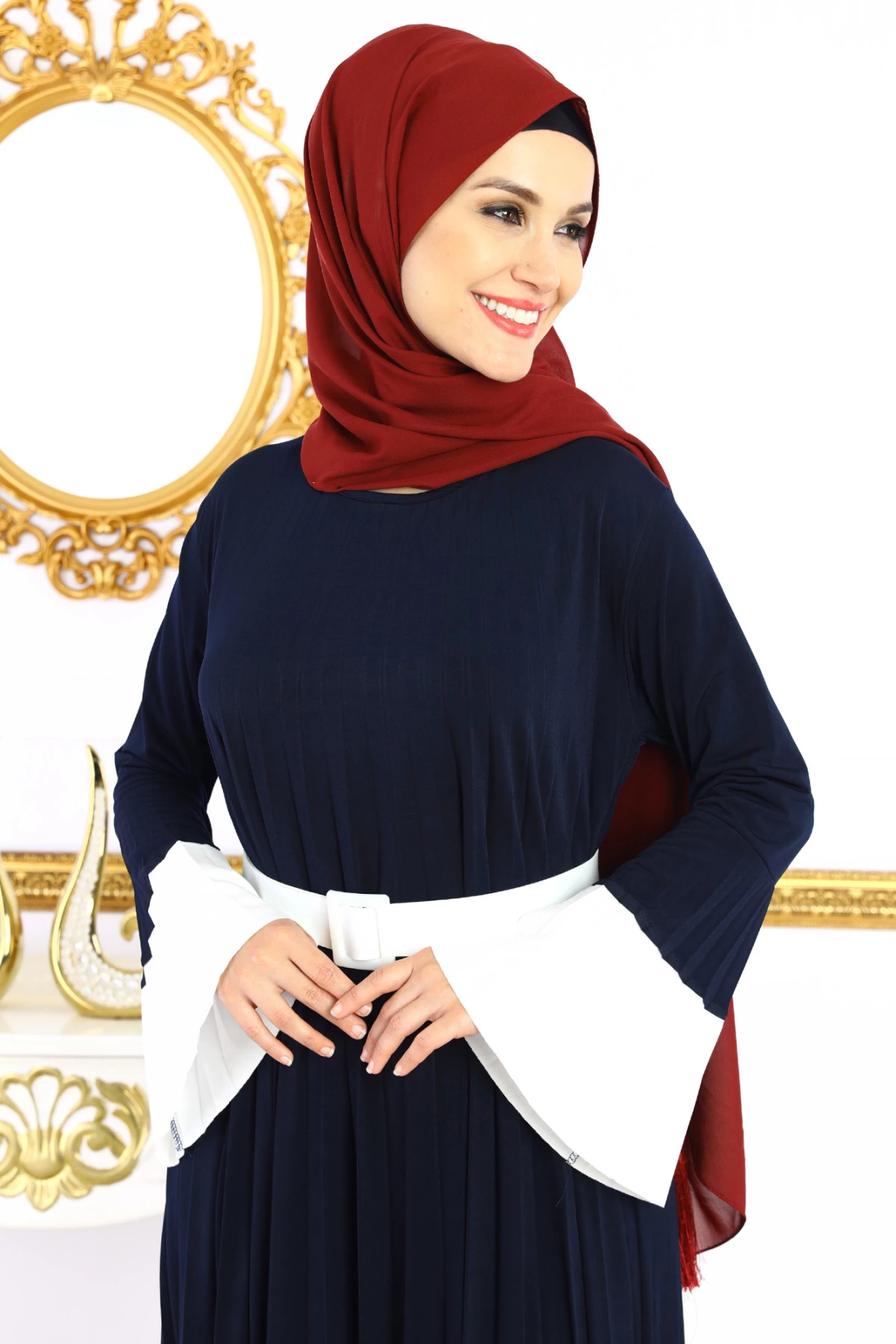 Needion - Kemerli Piliseli Tesettür Elbise Lacivert STD(36-44)