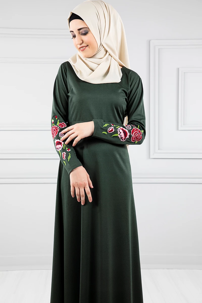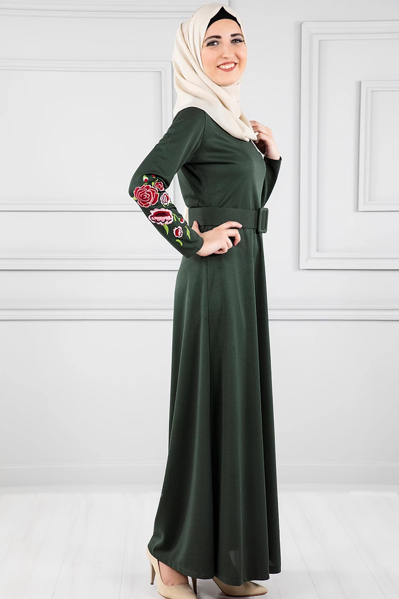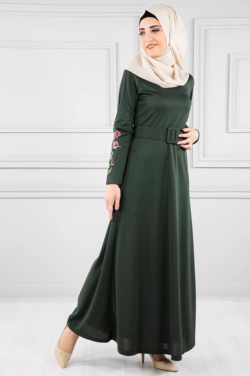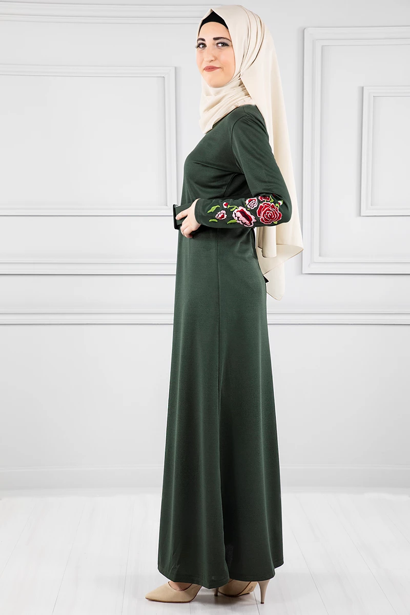 Kloş Nakışlı Tesettür Elbise Haki 42