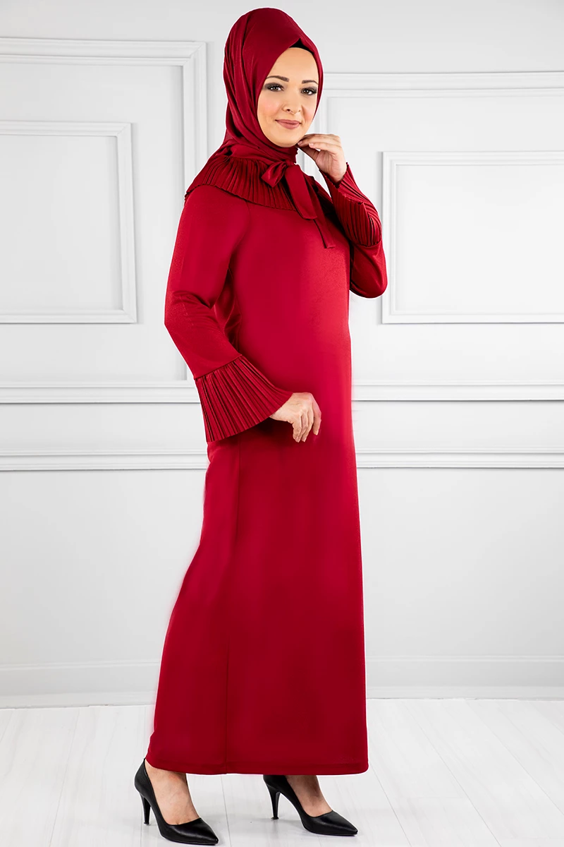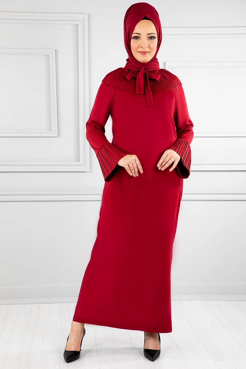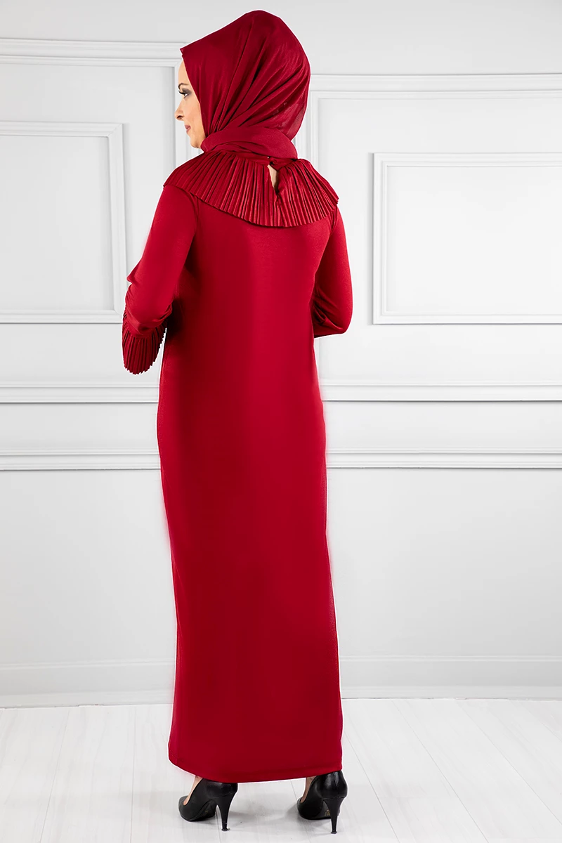 Kol Ve Yaka Piliseli Tesettür Elbise Bordo 38