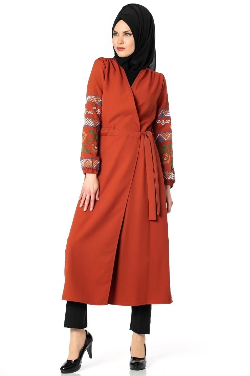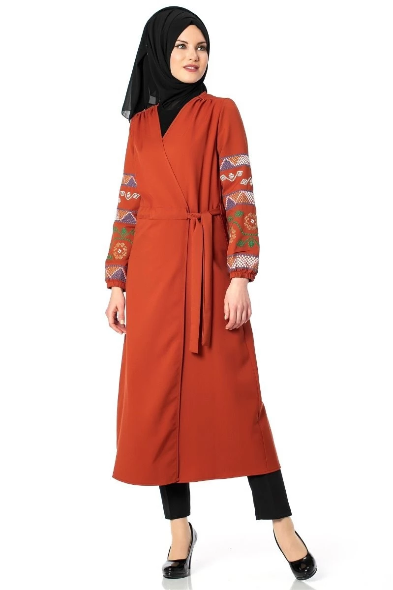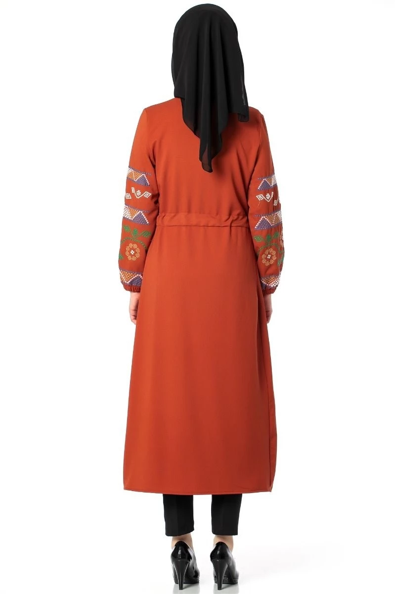 Kolları Nakışlı Trenç Tesettür Kap Tunik Kiremit 38