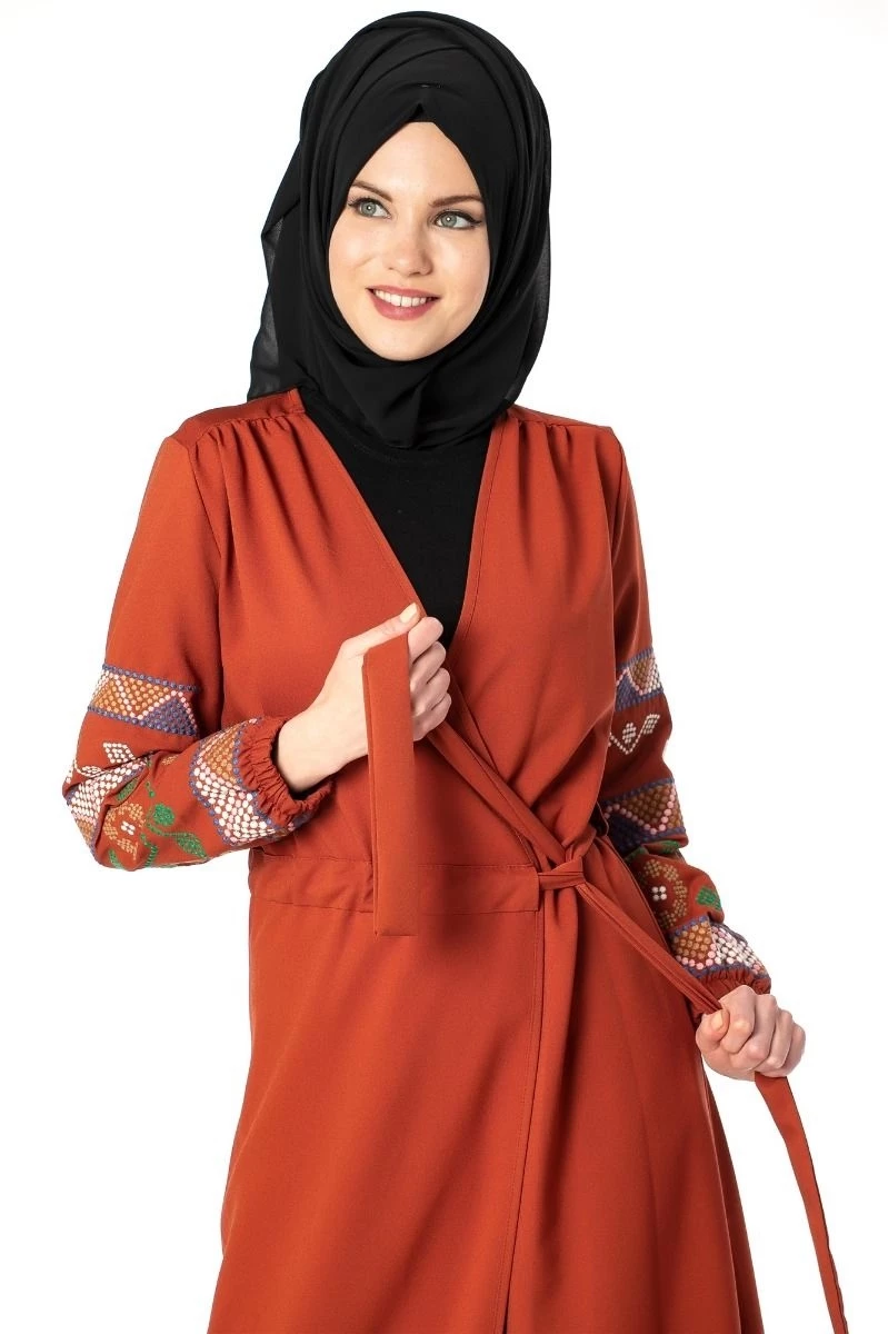 Needion - Kolları Nakışlı Trenç Tesettür Kap Tunik Kiremit 38