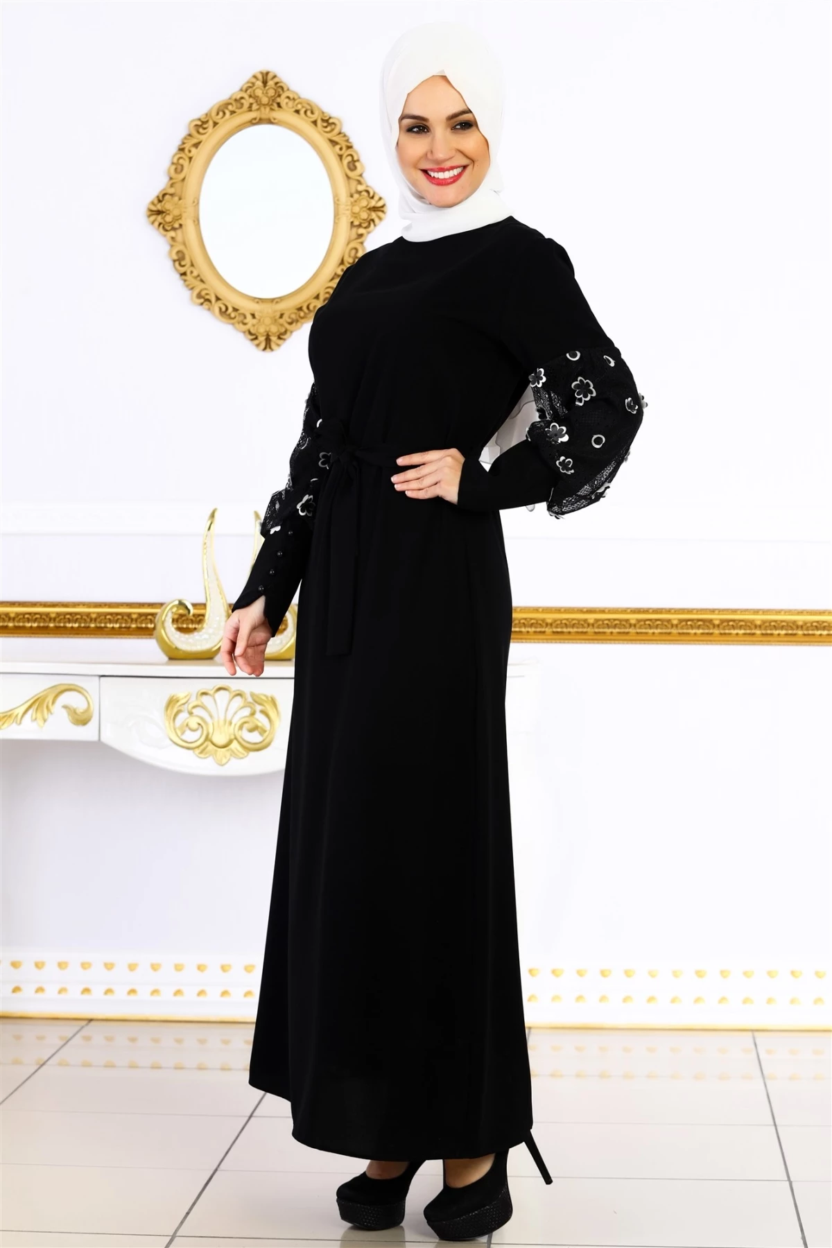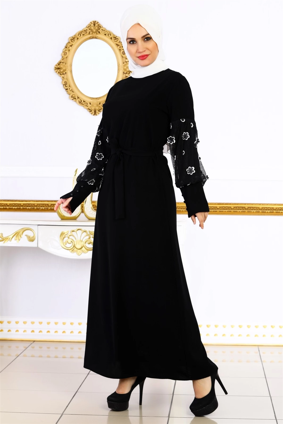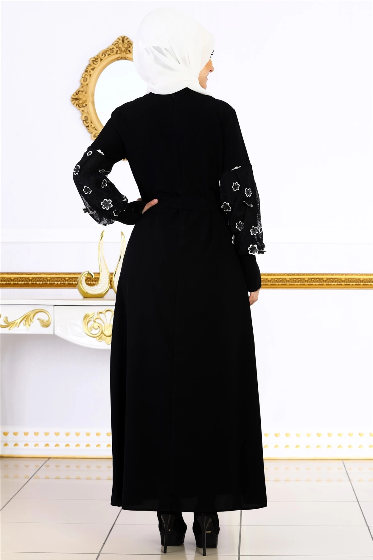 Needion - Kolları Papatya Desenli Tesettür Ferace Elbise Siyah 38