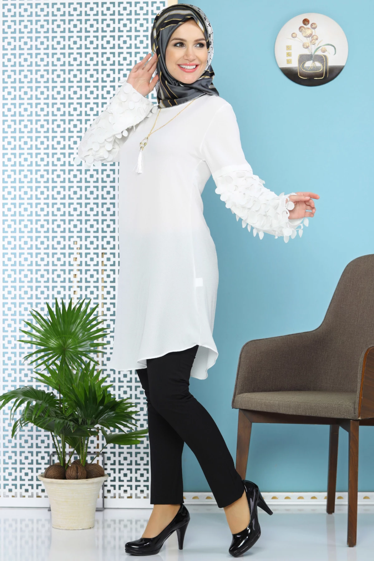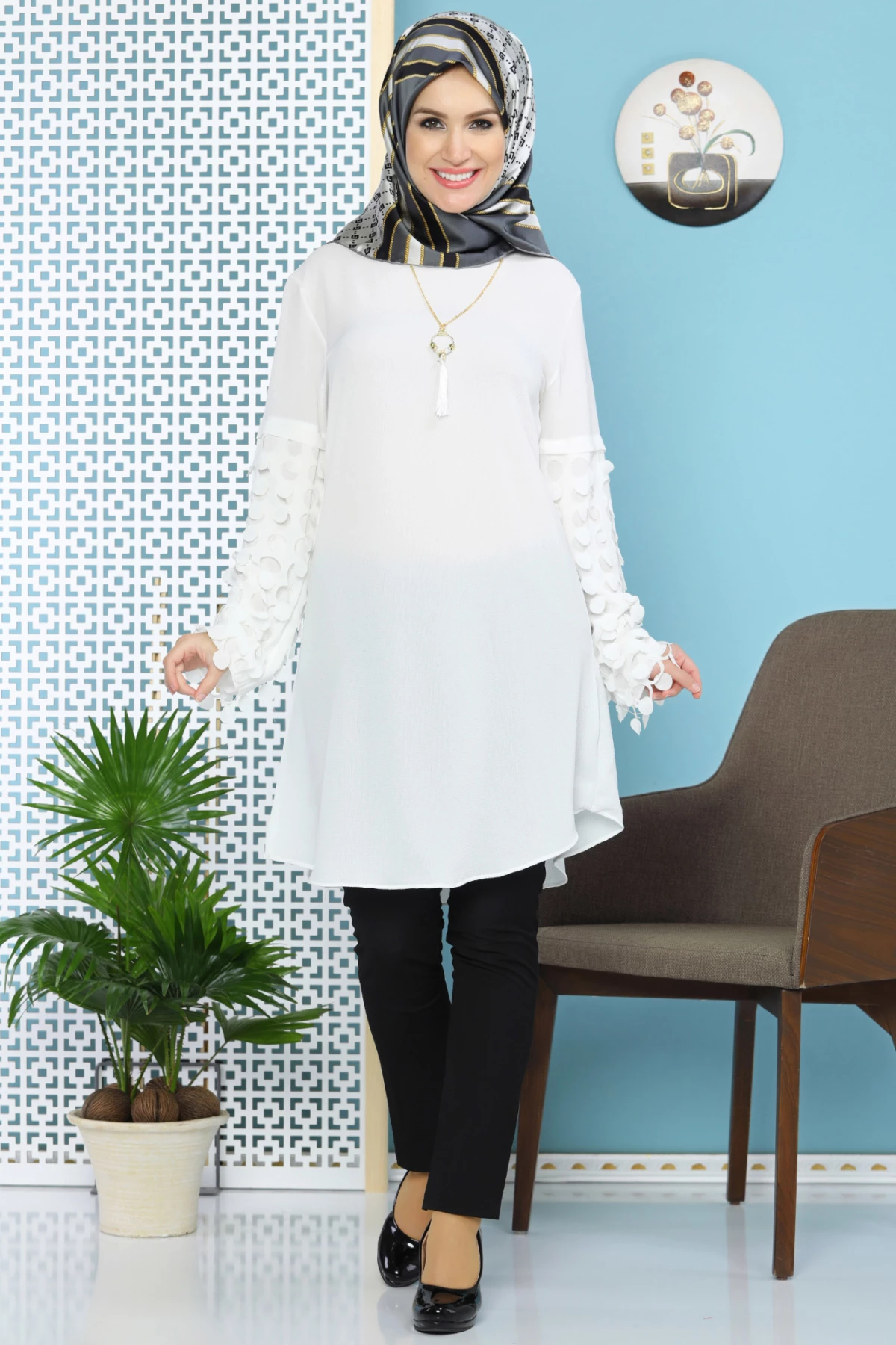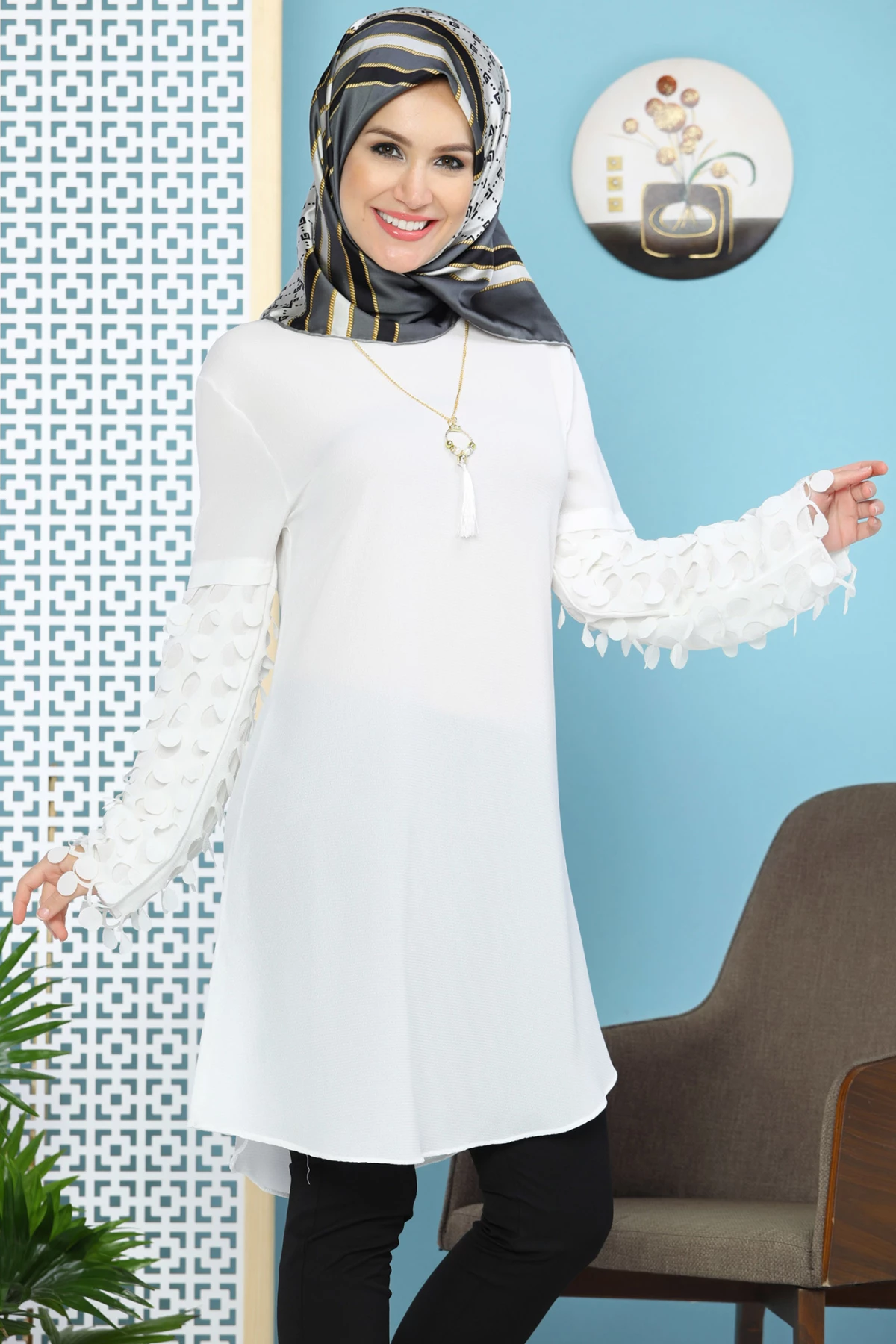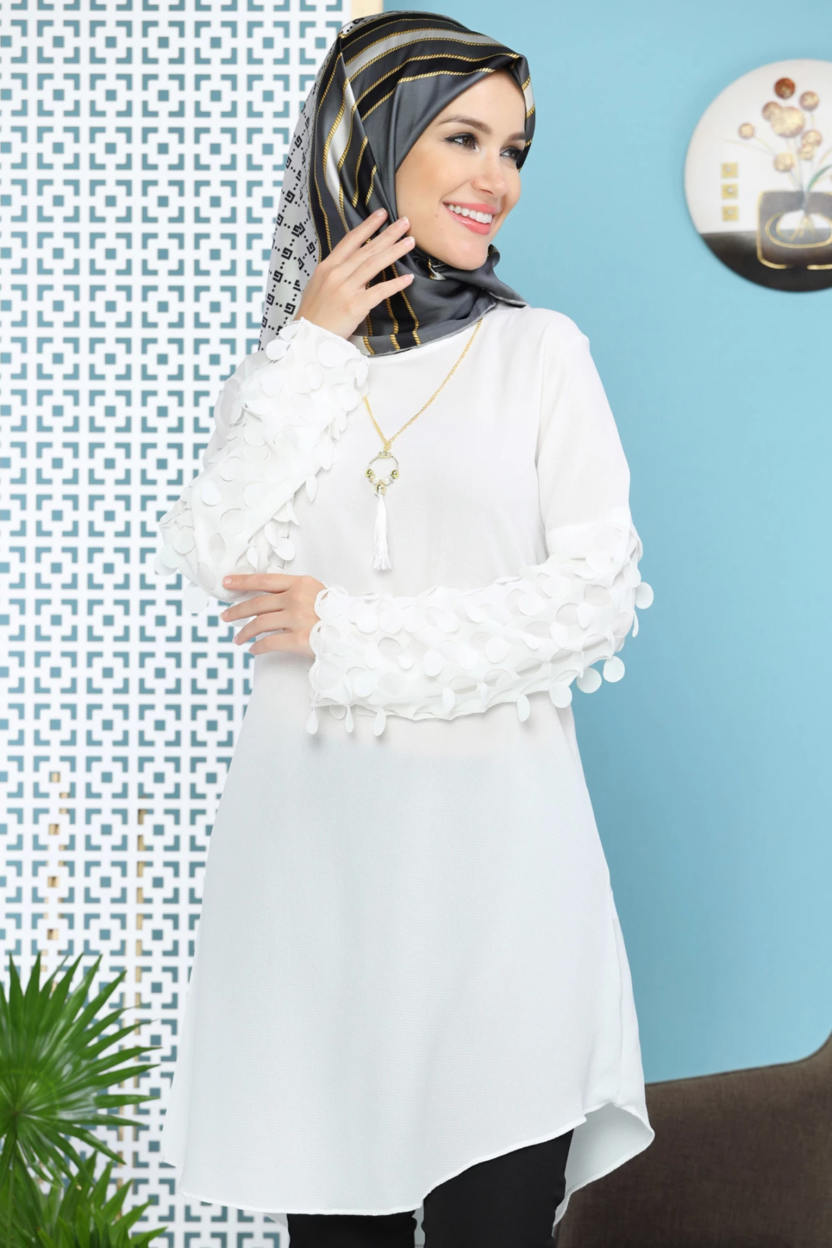 Kolu Lazer Kesimli Kolyeli Tesettür Tunik Beyaz tr S