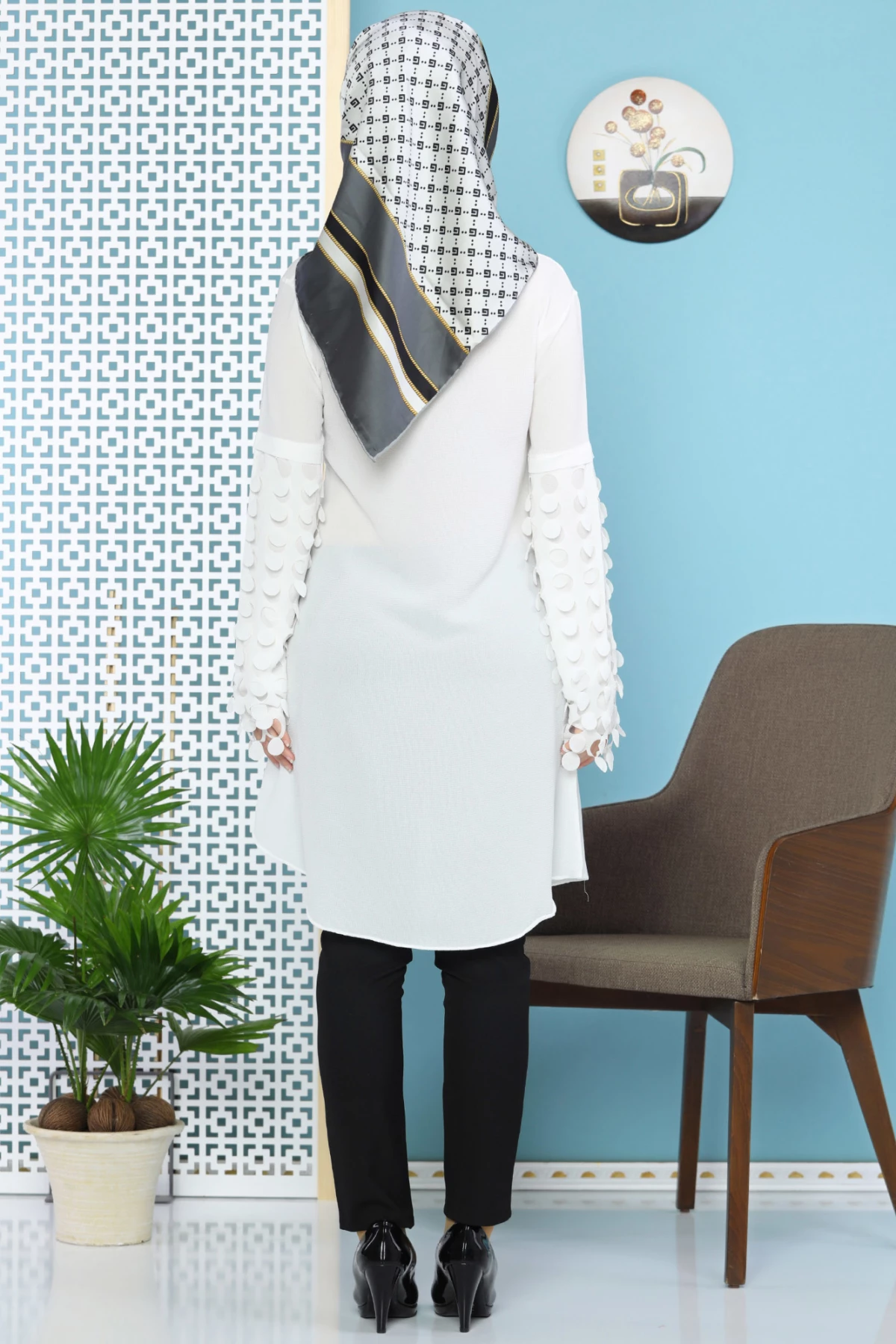 Needion - Kolu Lazer Kesimli Kolyeli Tesettür Tunik Beyaz tr S