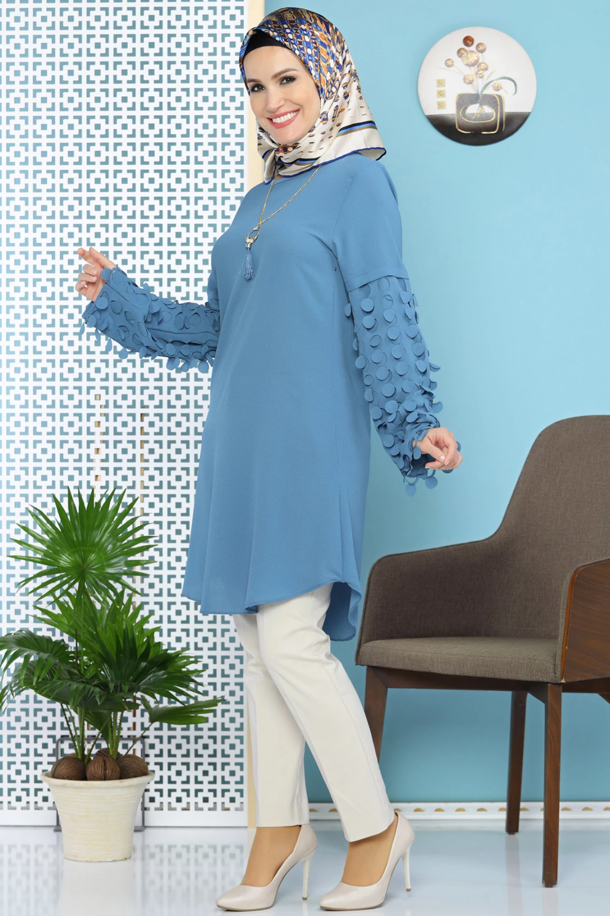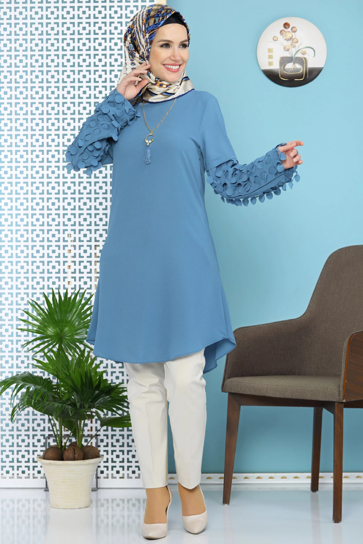 Kolu Lazer Kesimli Kolyeli Tesettür Tunik İndigo tr S