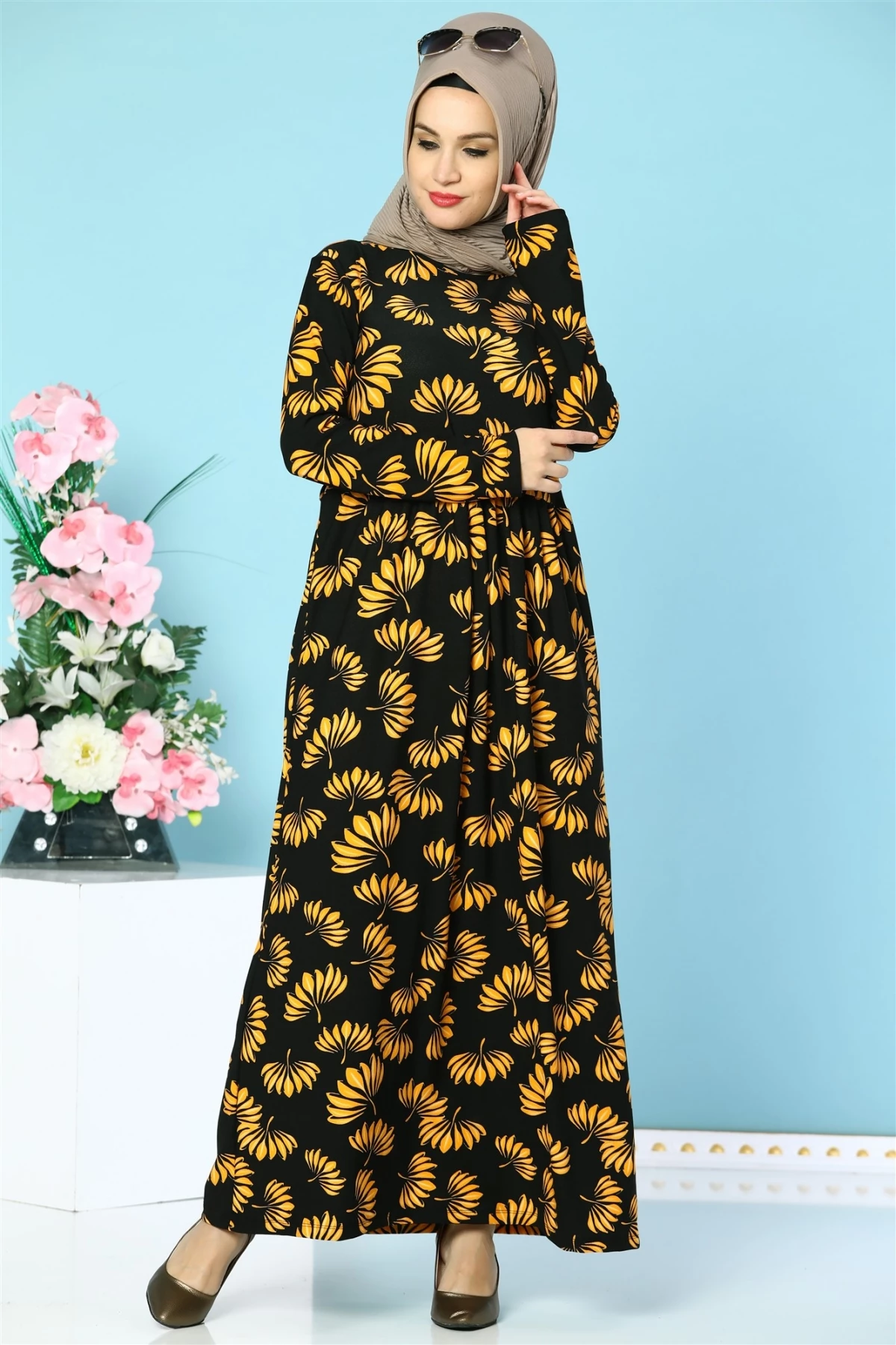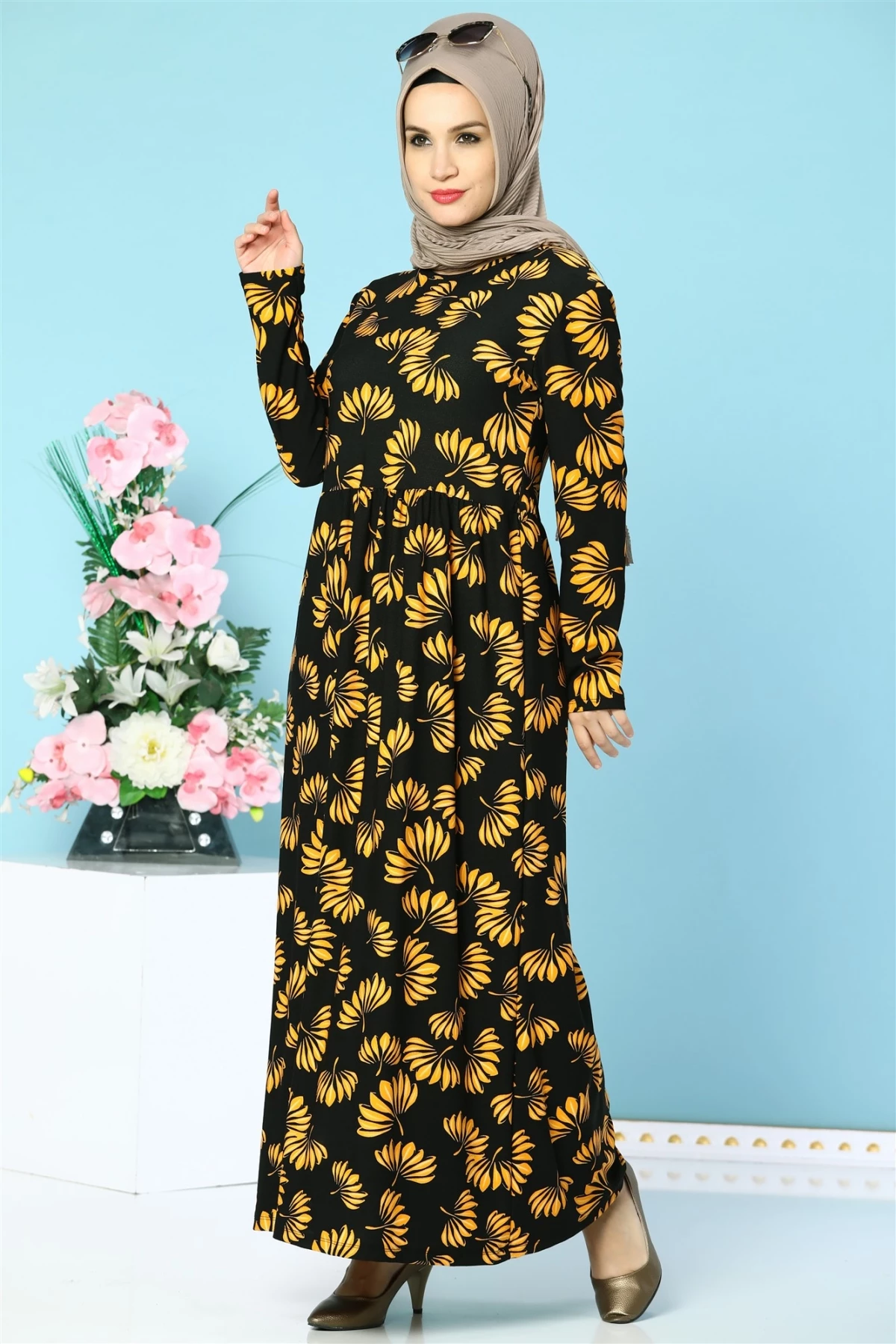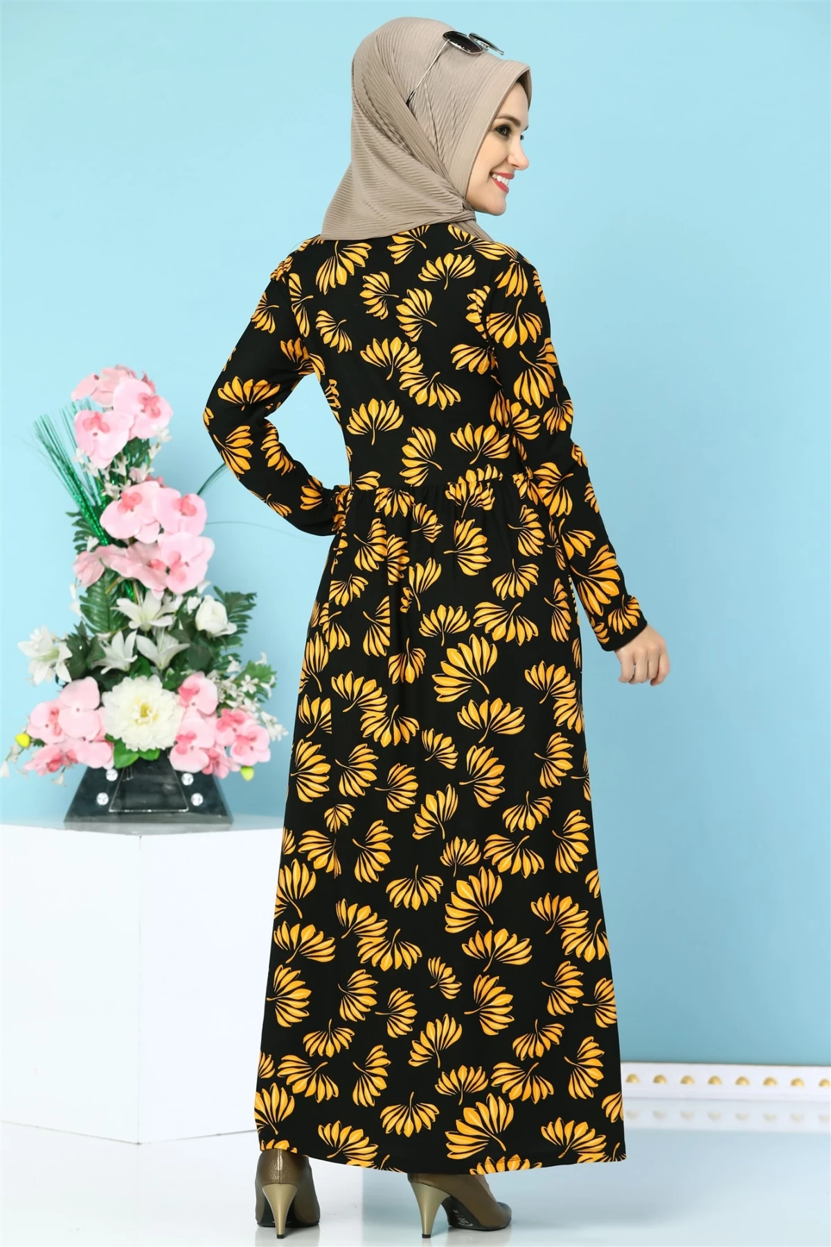 Kuşaklı Etnik Desenli Tesettür Elbise Siyah S-M