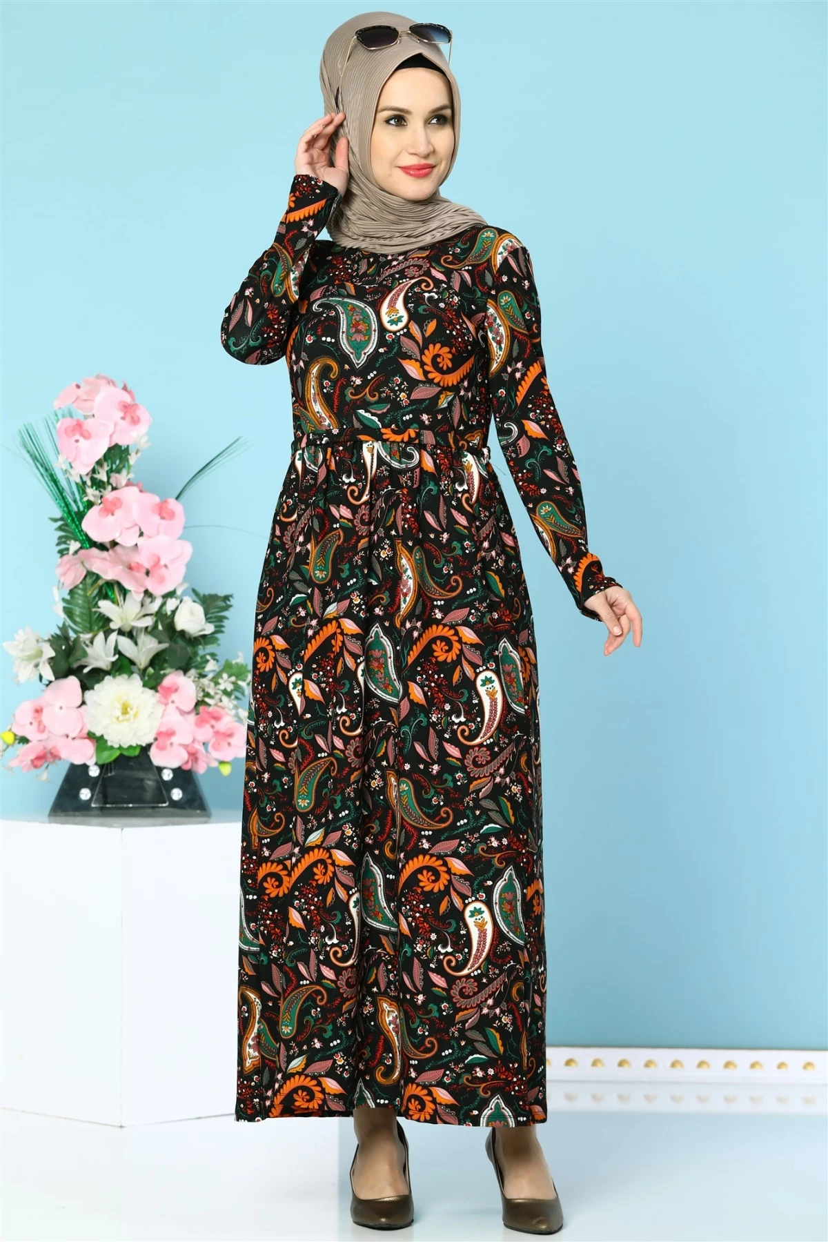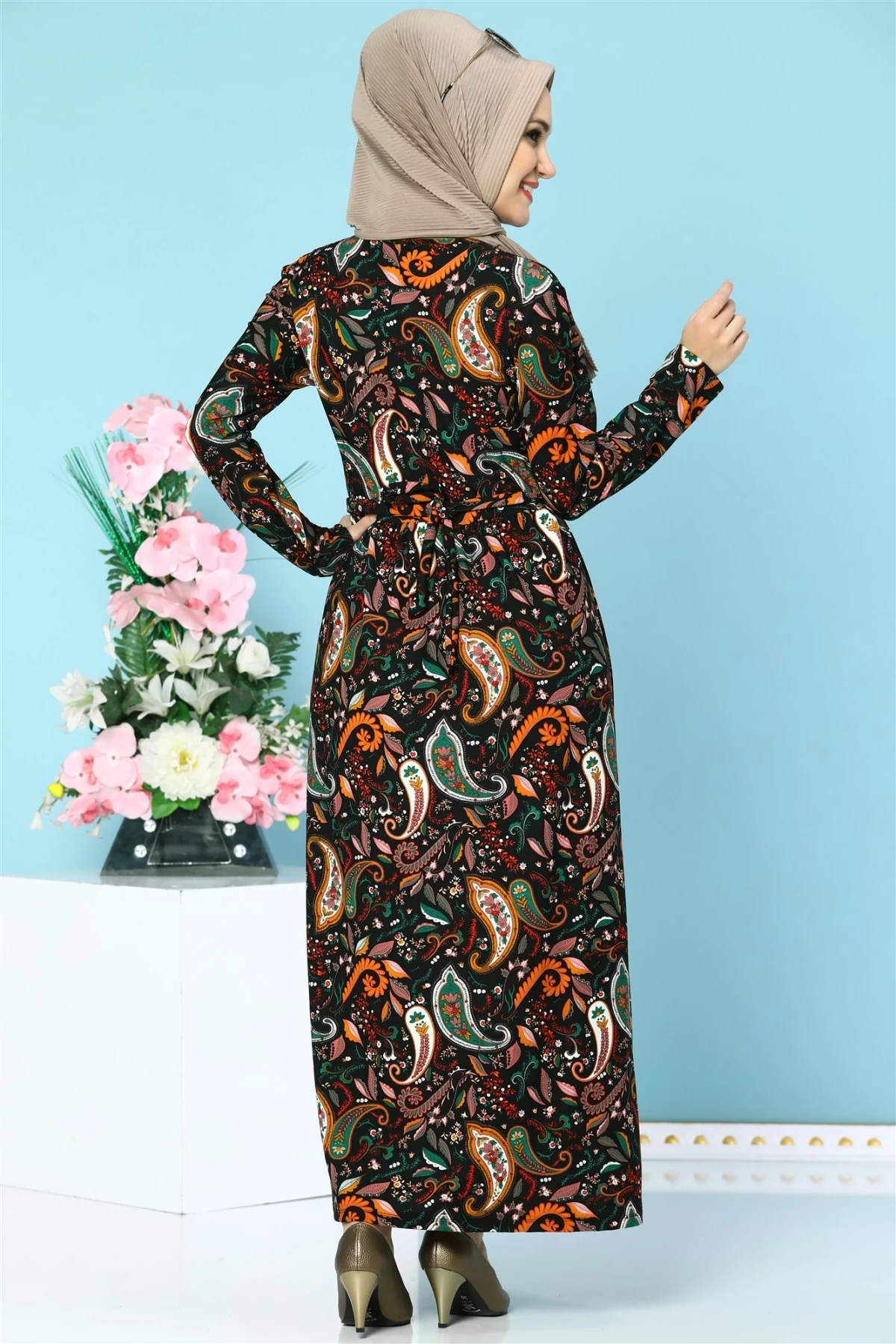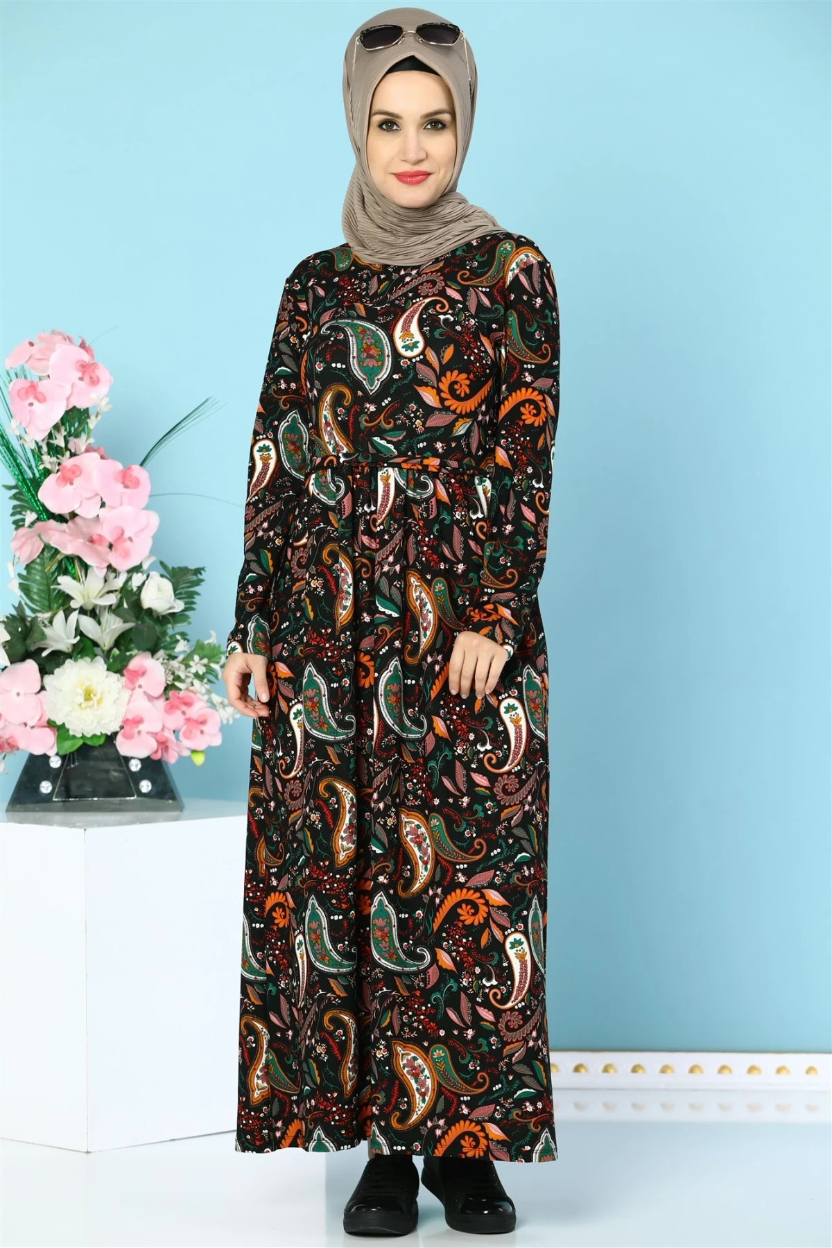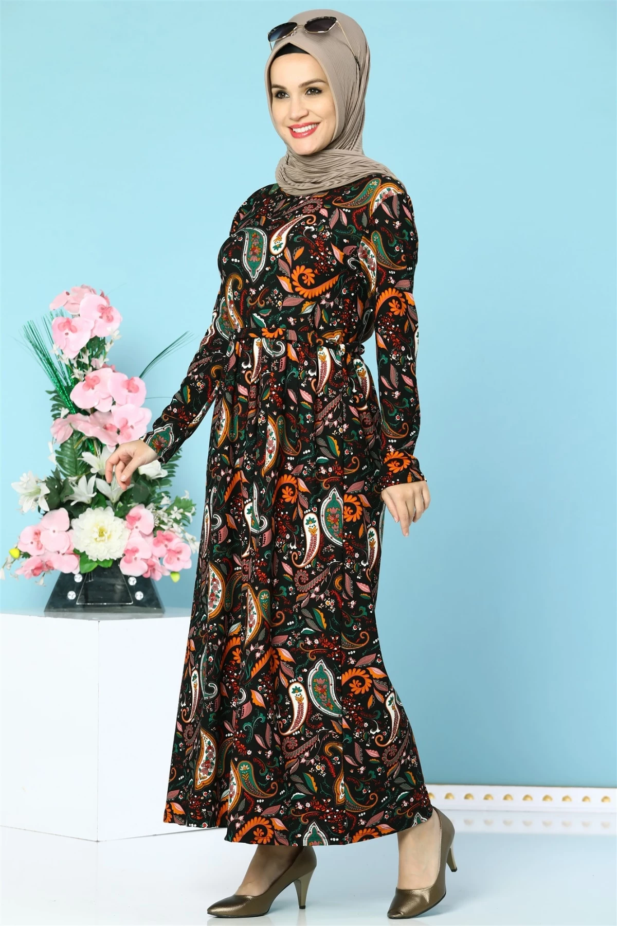 Kuşaklı Etnik Desenli Tesettür Elbise Turuncu S-M