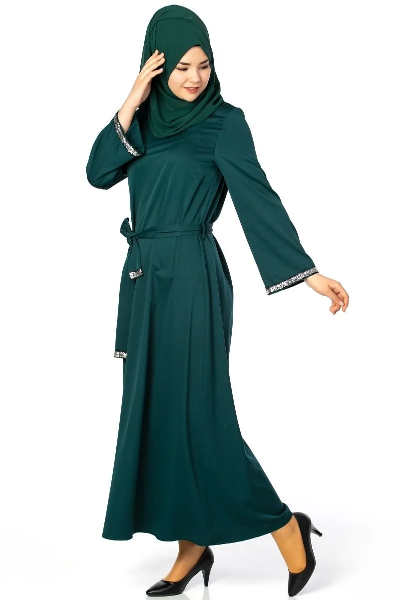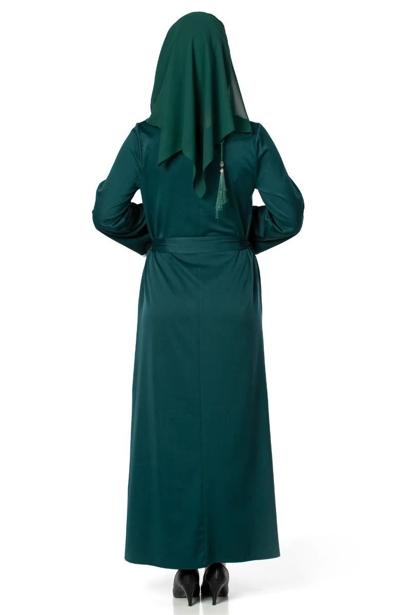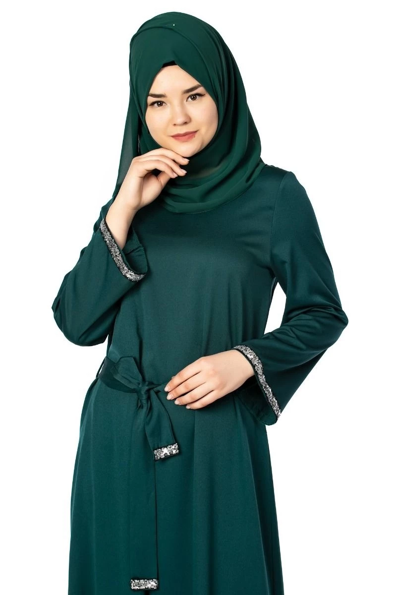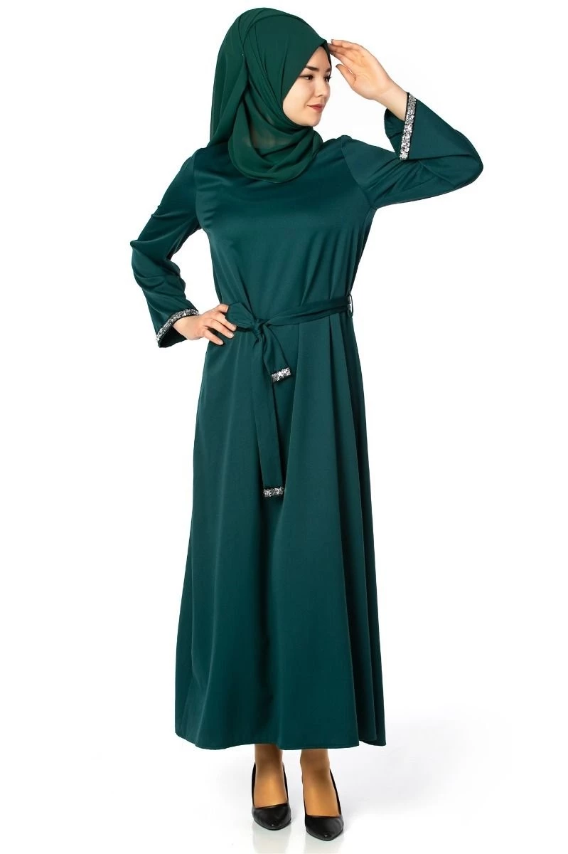 Kuşaklı Tesettür Abıye Elbise Zumrut 36