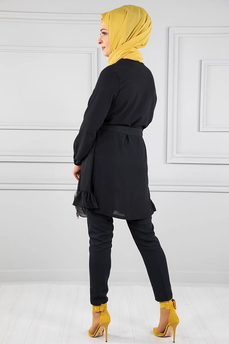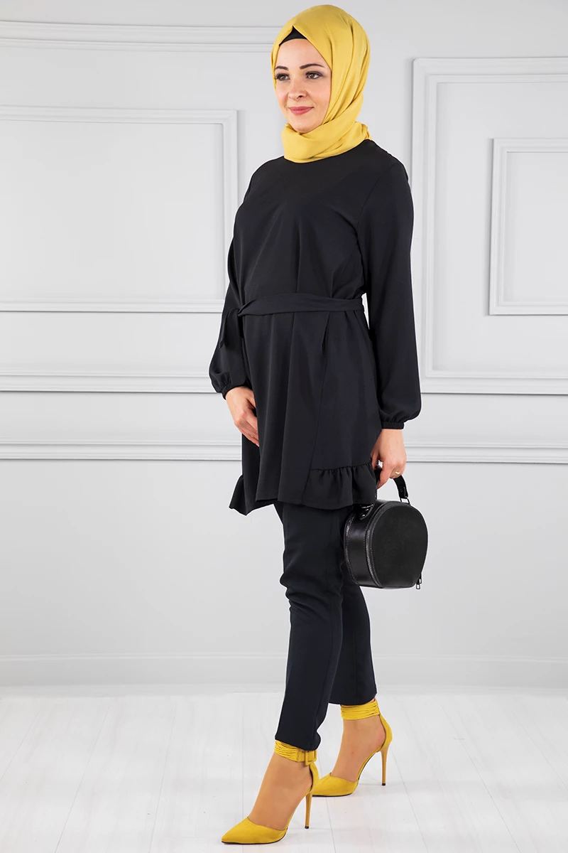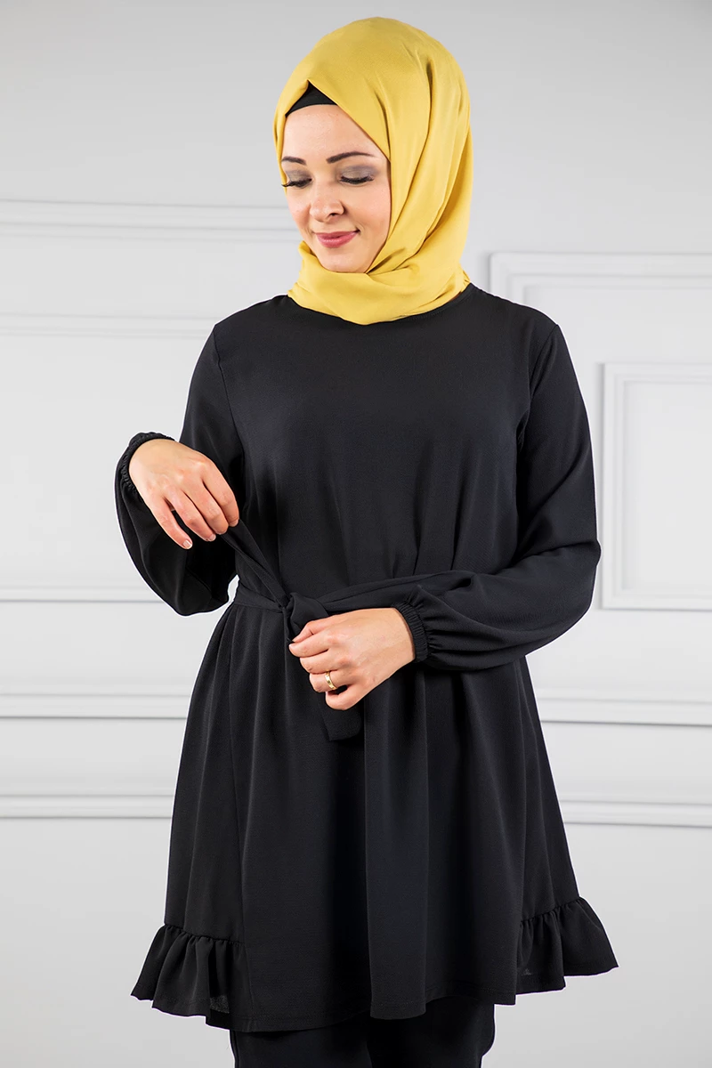 Needion - Kuşaklı Tesettür Tunik Siyah L