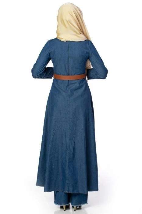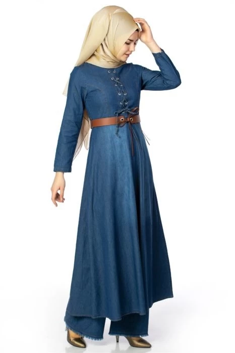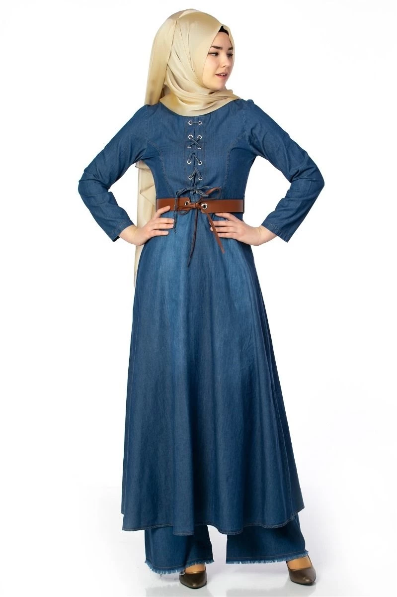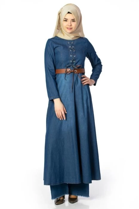 Önü Geçmeli Kemerli Kot Tesettür Elbise Lacivert 38