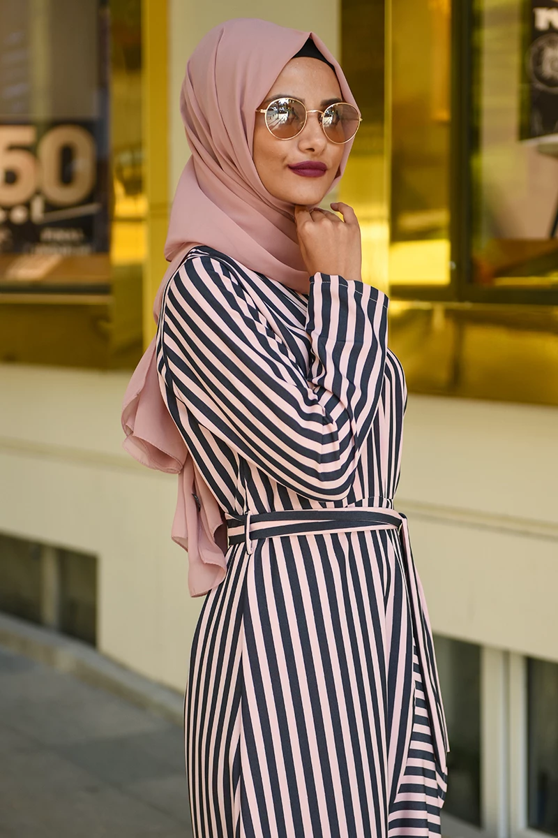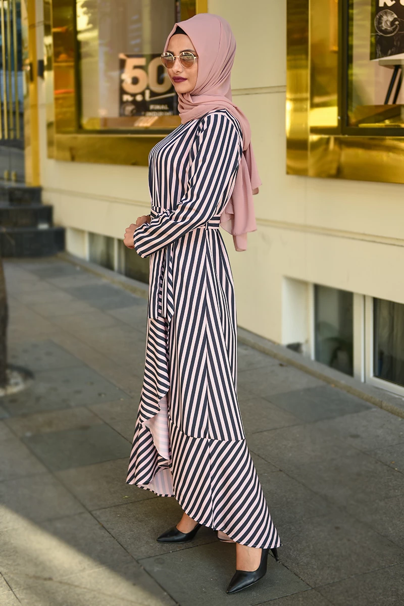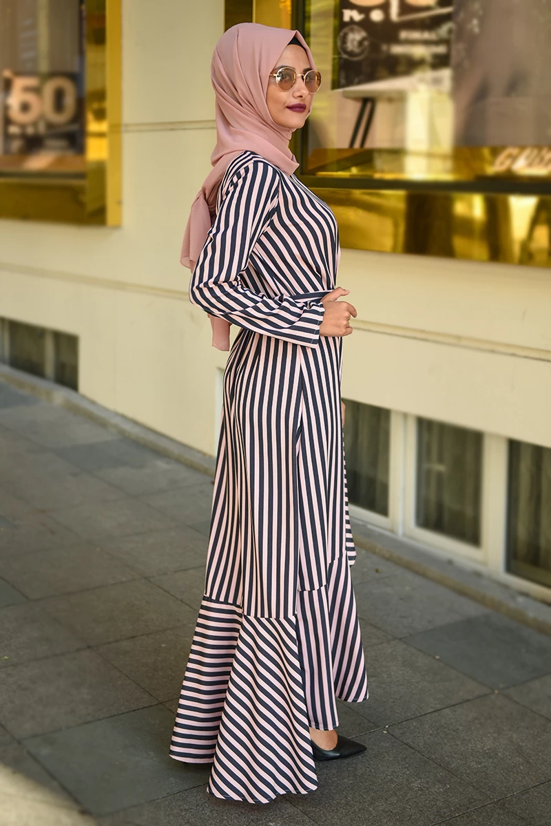 Pile Detay Çizgili Tesettür Elbise MN2159 Pudra 52