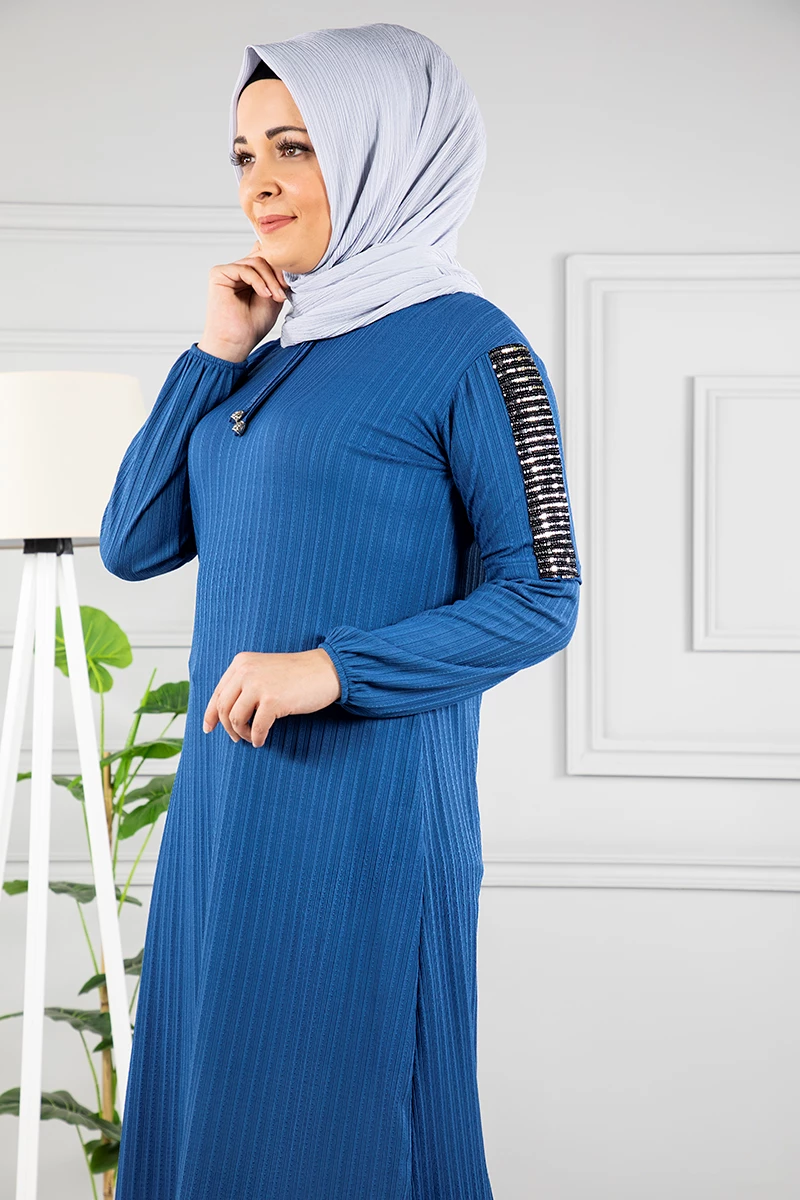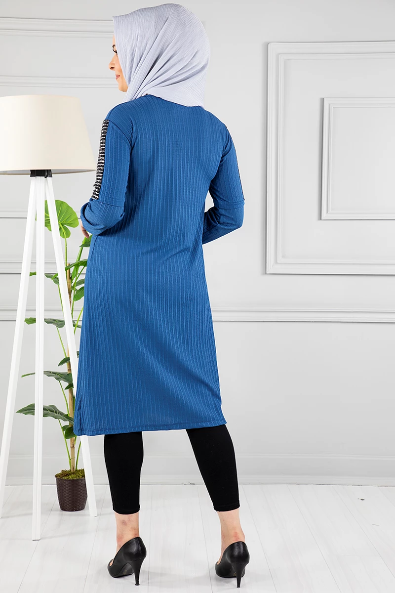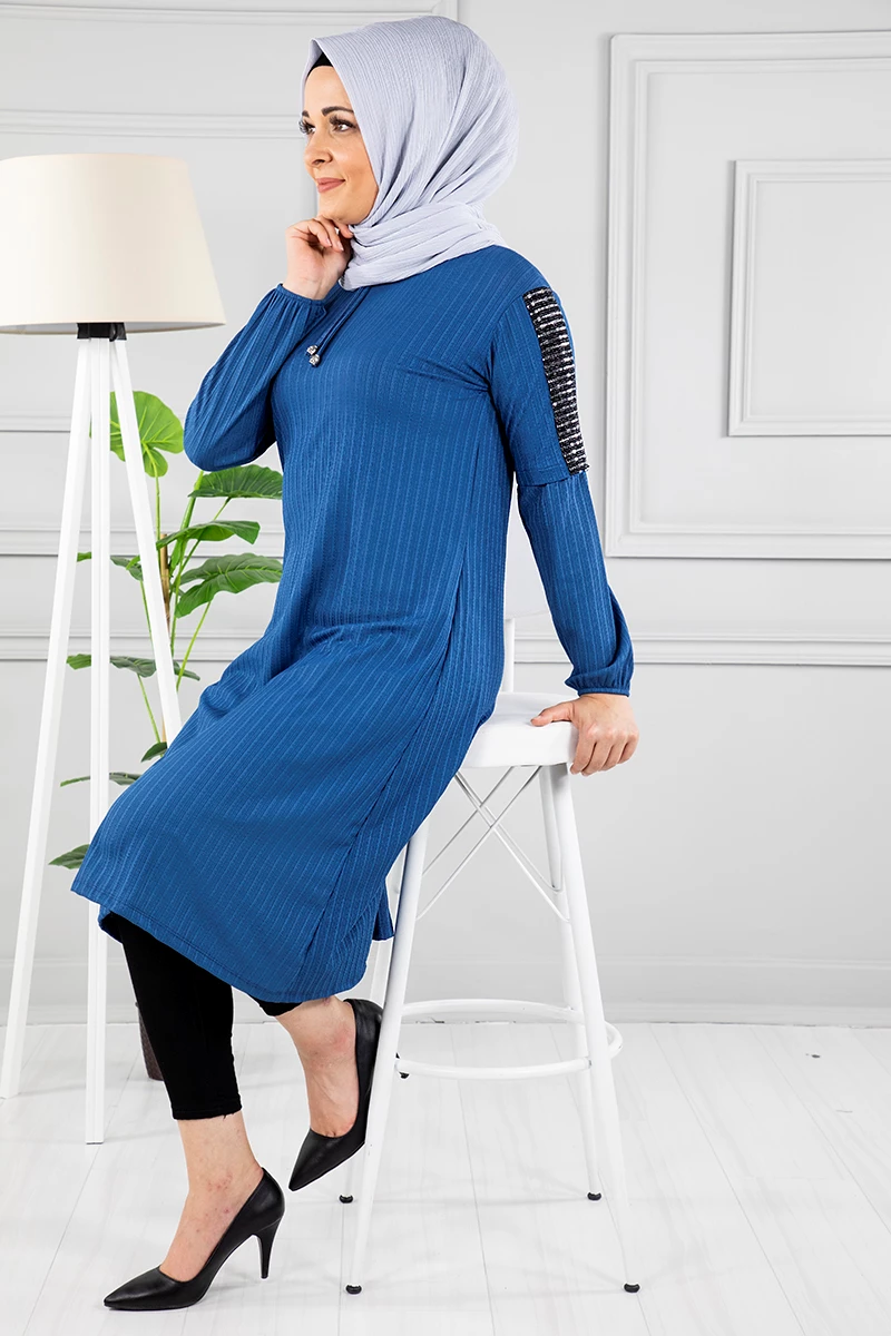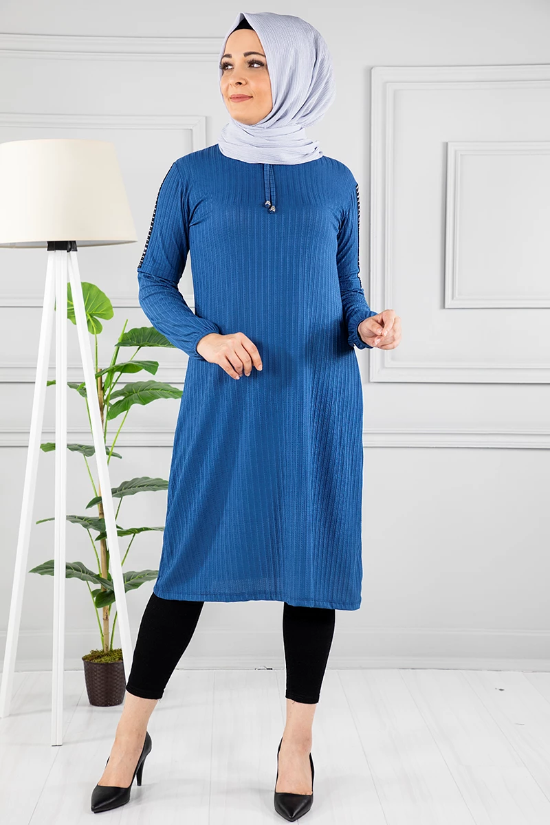 Pul Detaylı Kolları Büzgülü Tesettür Tunik ELF1017 İndigo S-M
