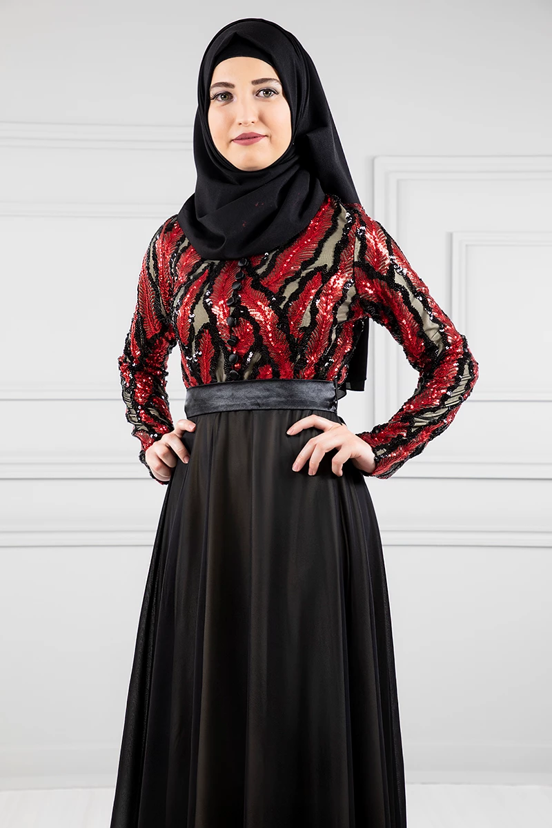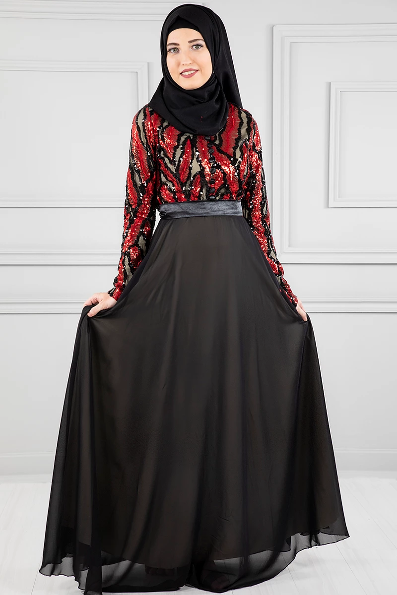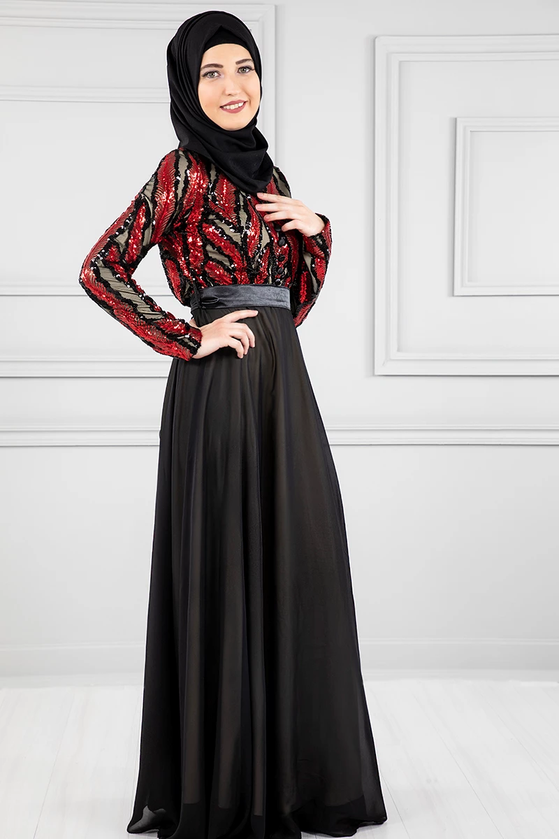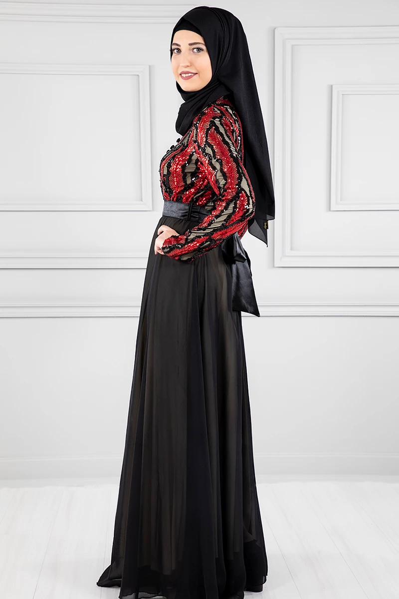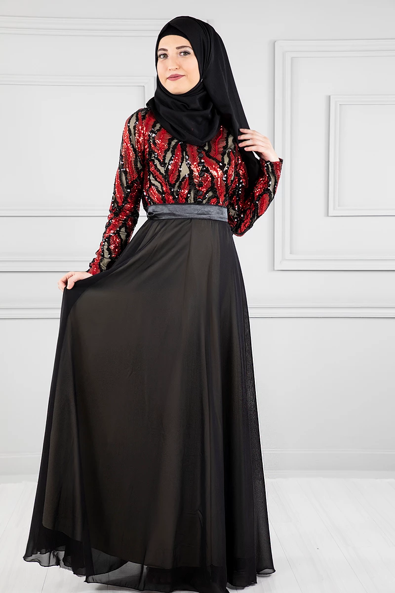Pul Payetli Abiye Elbise Vizon Bordo 3065 tr 38