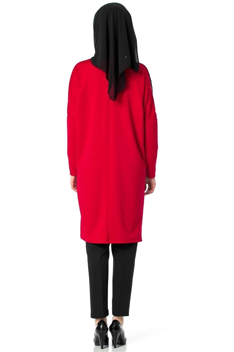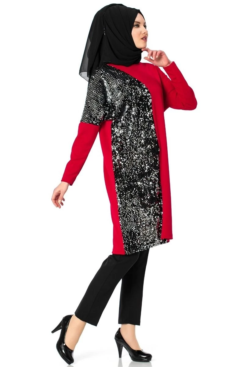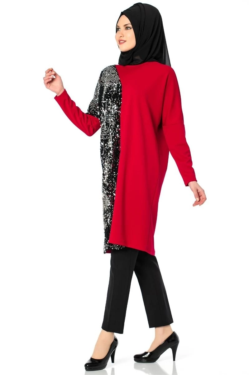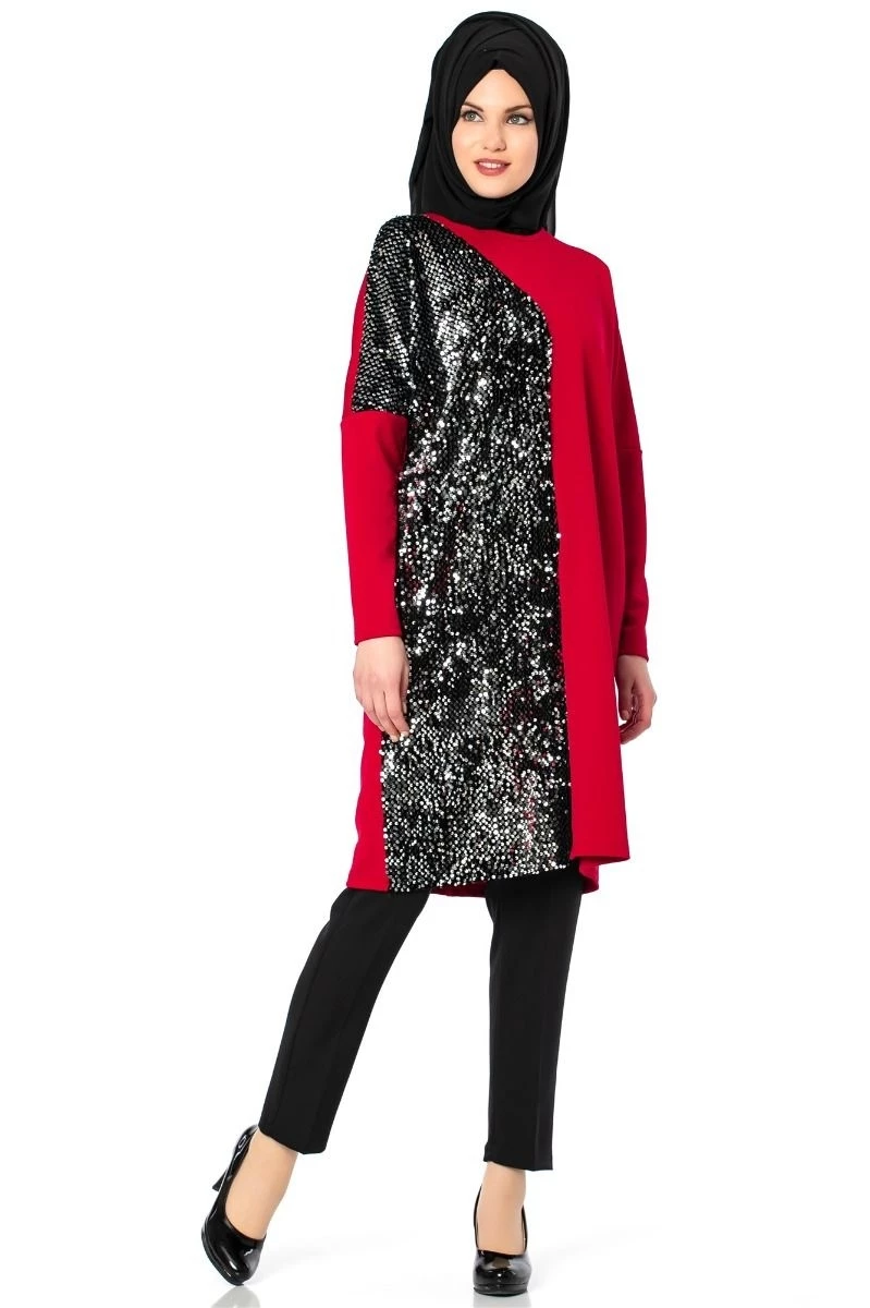 Pul Payetli Tesettür Tunik Kırmızı STD (38-44)