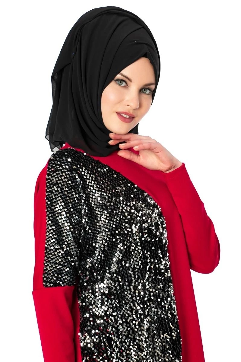 Needion - Pul Payetli Tesettür Tunik Kırmızı STD (38-44)